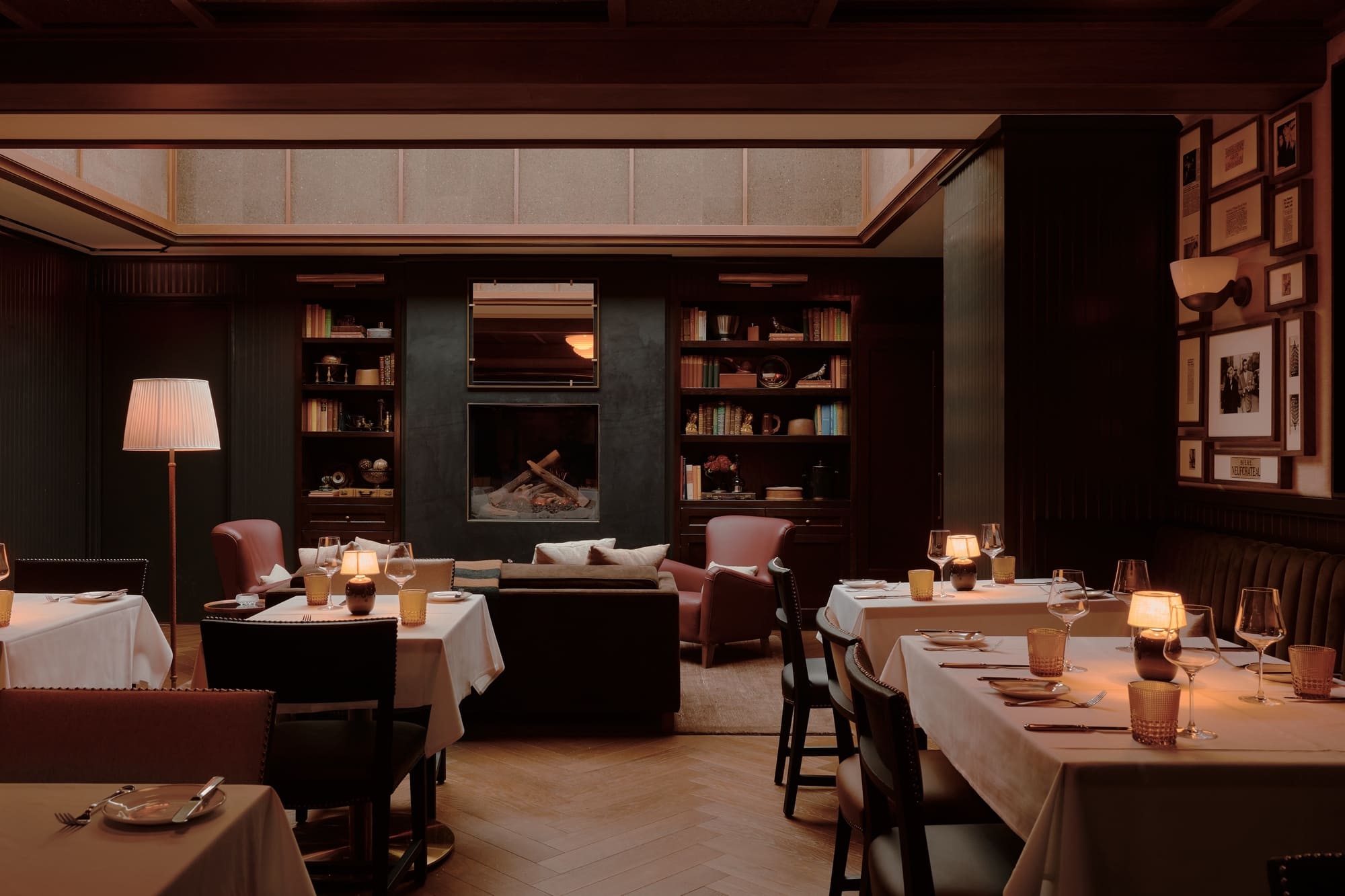 The upper level of Izzy’s has undergone a complete transformation into an elegant lounge space, designed for private events and refined dining experiences. The redesigned area features a secluded intimate bar alongside a striking new fireplace, both dramatically illuminated by natural light streaming through a restored opaque skylight. Previously hidden beneath layers of concealment, this architectural centerpiece has been refurbished with contemporary framing and translucent glass that bathes the entire space in a soft, atmospheric glow.