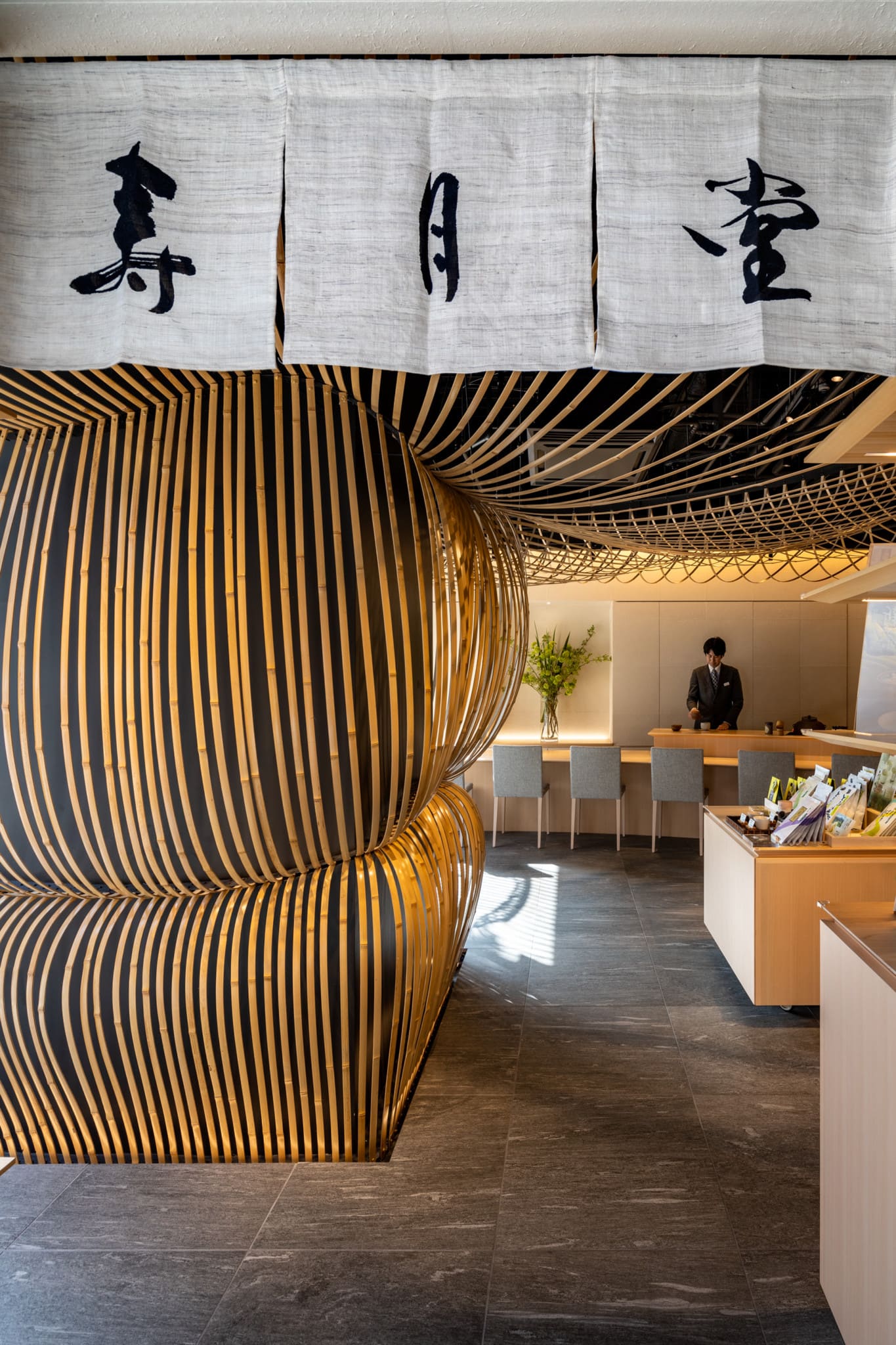 We designed a space that embodies the spirit of “Chazen” (concept that Way of Tea and Zen are the same) inspired by bamboo “Nodate” umbrellas.
