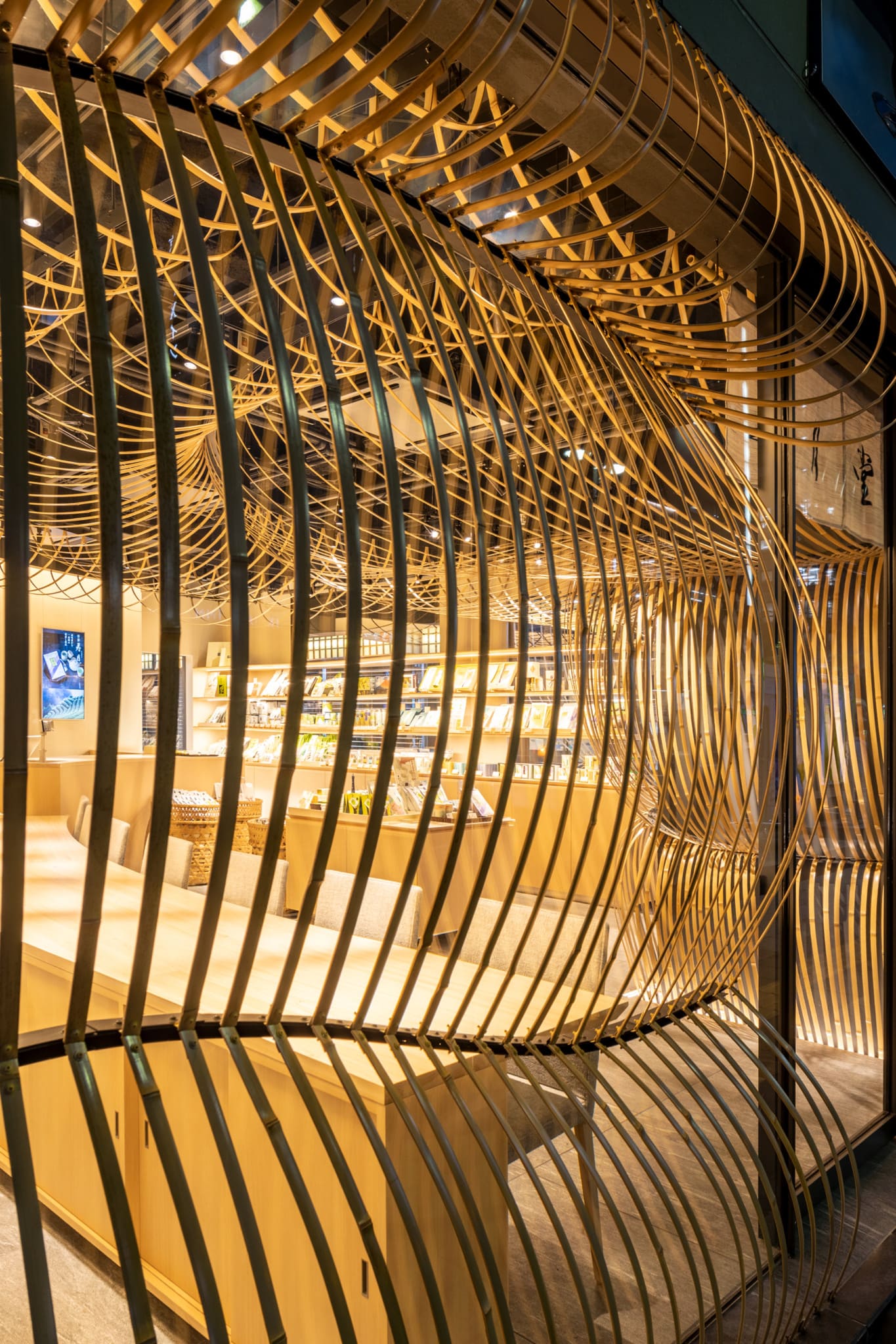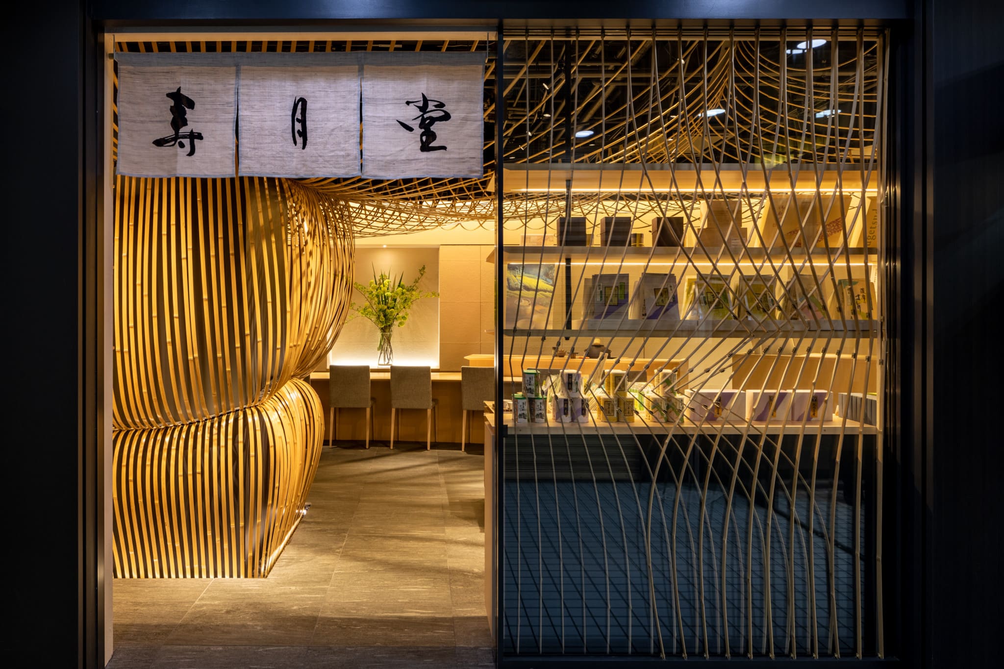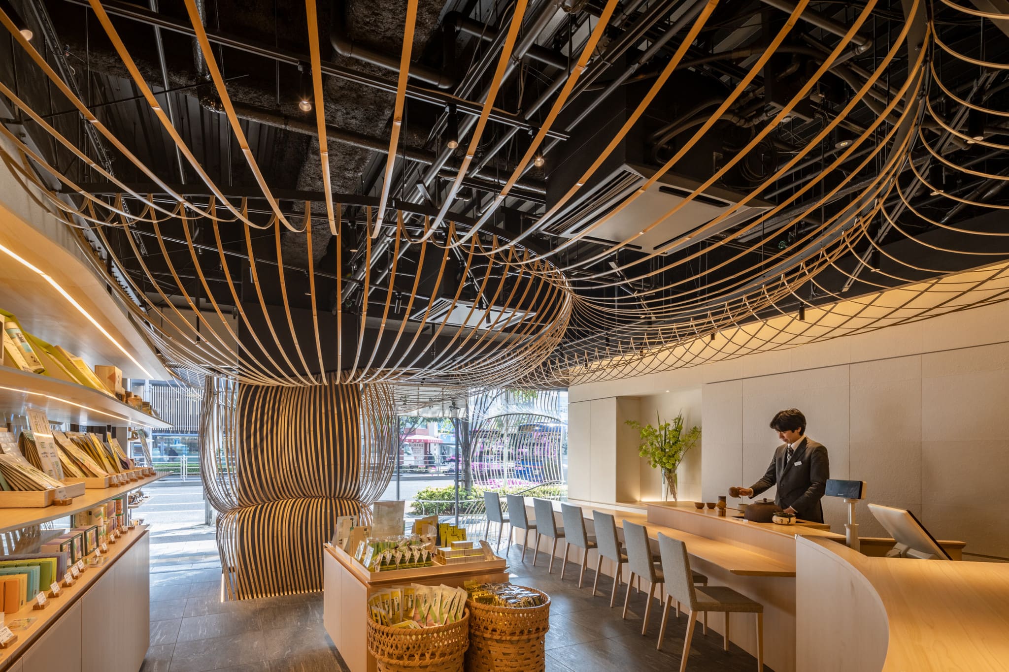 We designed the interior of both the Paris and Kabukiza Jugetsudo stores using bamboo. For this third store, we wanted to also embrace the airiness and openness of “Nodate”. Using the flexible properties of bamboo, we created bamboo umbrellas that bend and spread out. The bamboo umbrellas fill the interior space, spilling into the street of Tsukiji in an inviting gesture to by-walkers. The sensation of being under the umbrellas creates a peaceful space for guests reminiscent of tea ceremonies under “Nodate” umbrellas.
