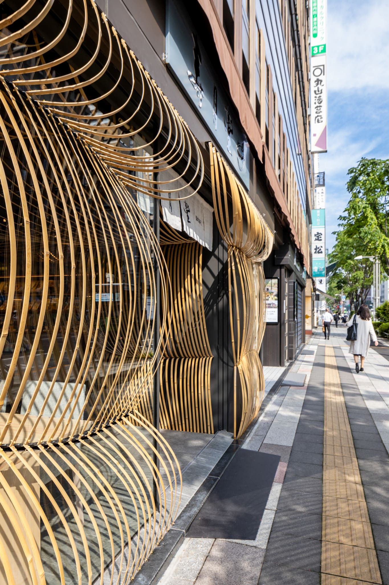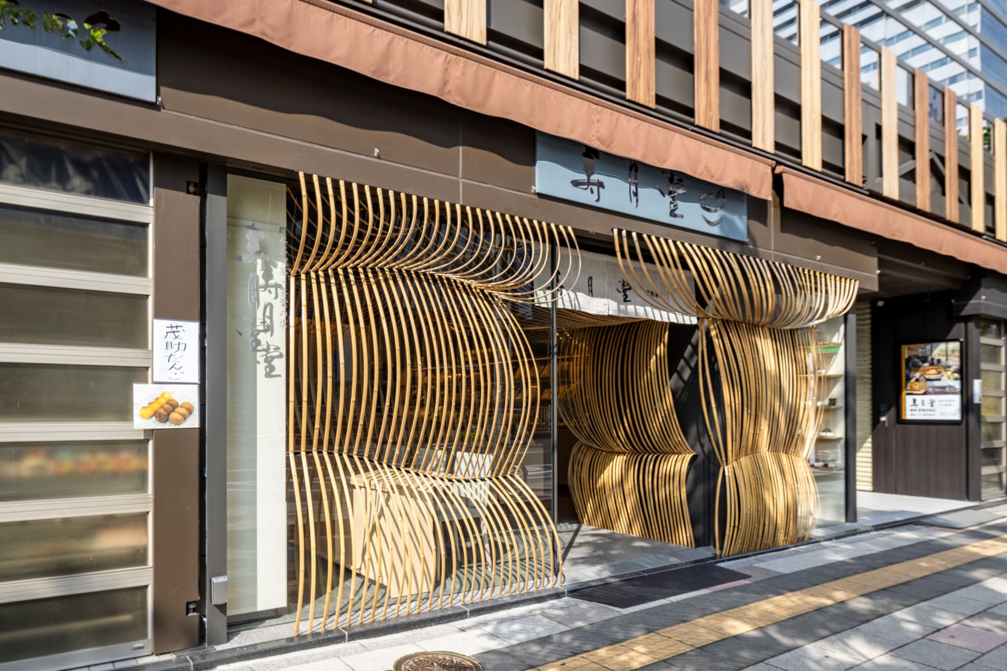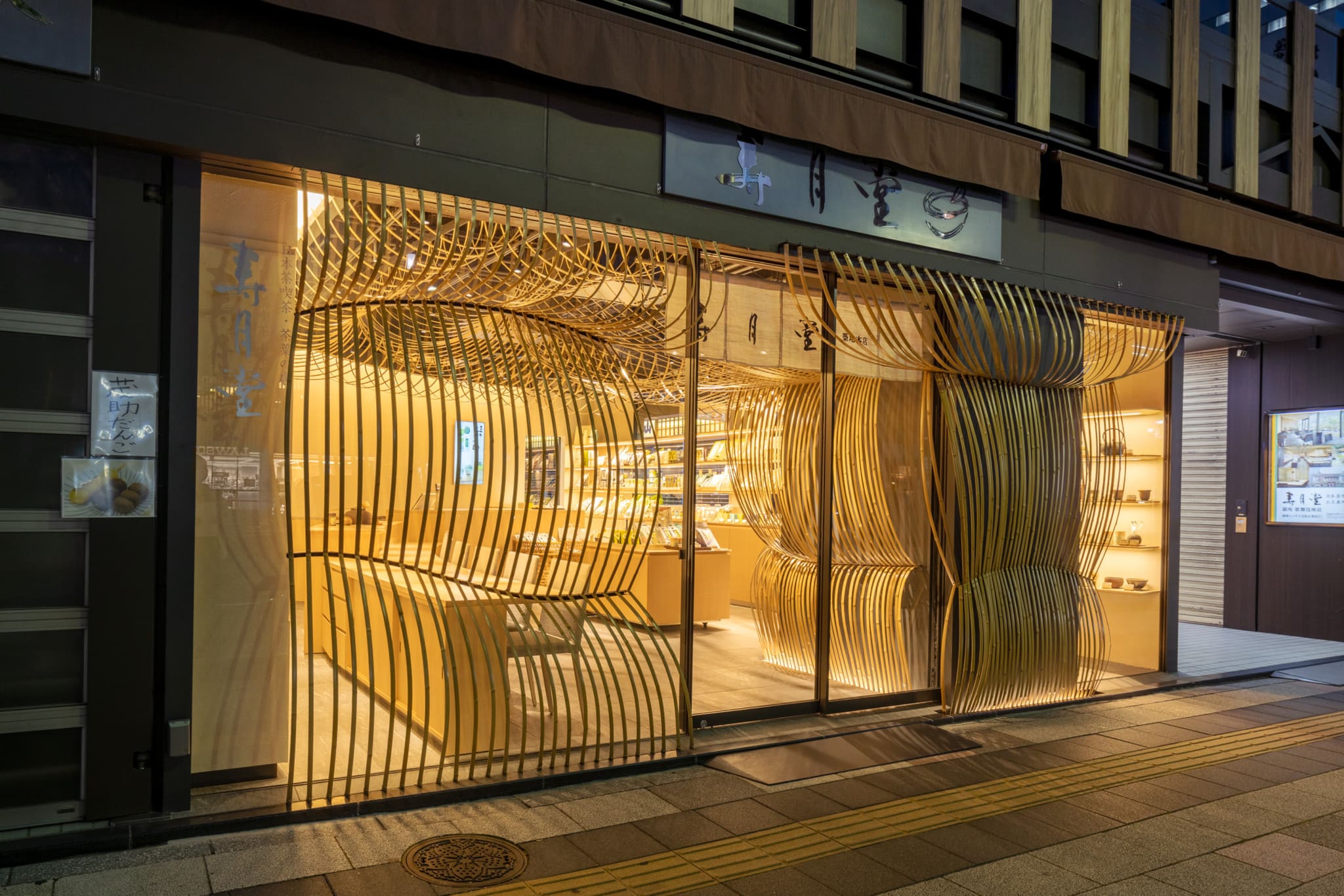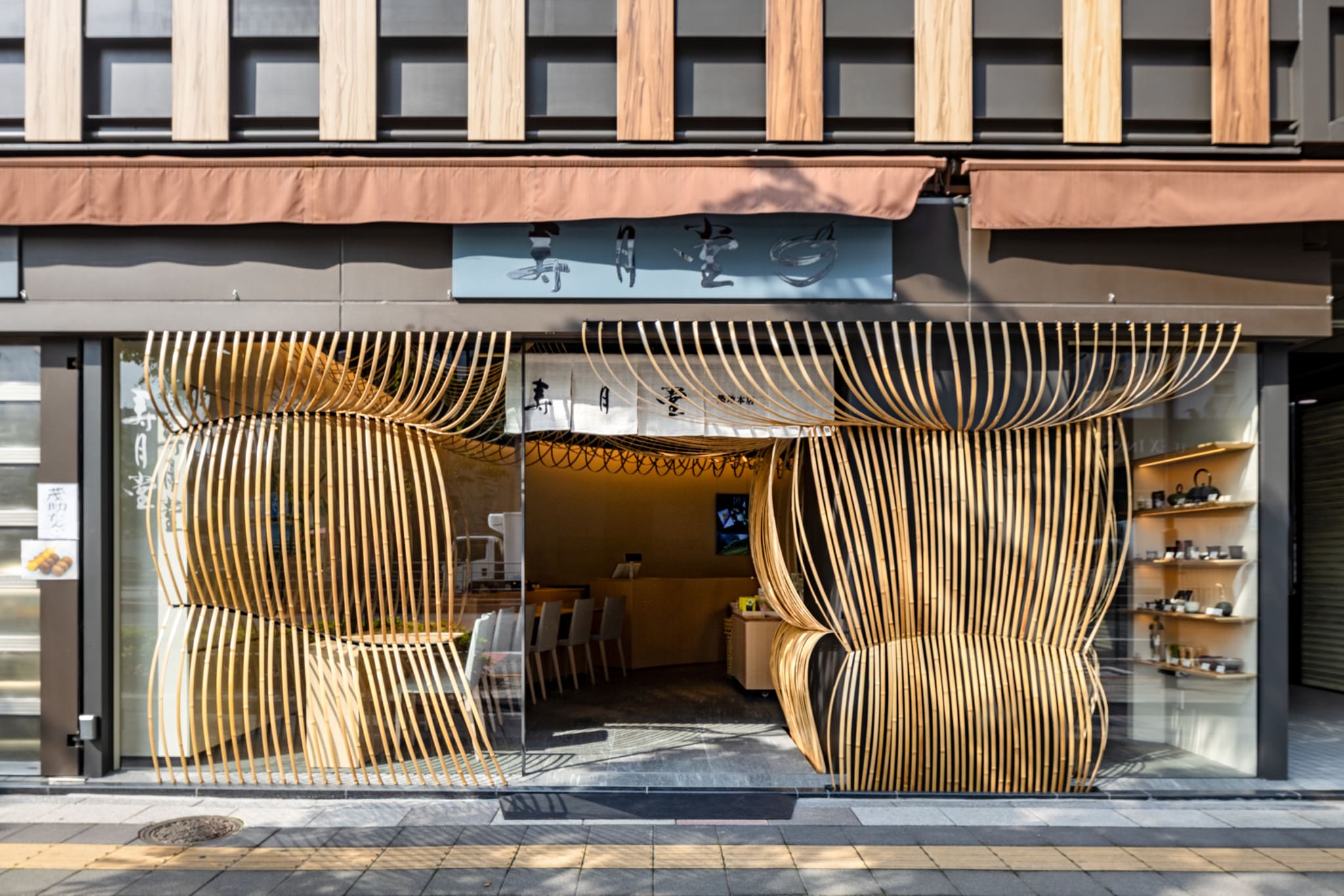 We designed the interior of both the Paris and Kabukiza Jugetsudo stores using bamboo. For this third store, we wanted to also embrace the airiness and openness of “Nodate”. Using the flexible properties of bamboo, we created bamboo umbrellas that bend and spread out. The bamboo umbrellas fill the interior space, spilling into the street of Tsukiji in an inviting gesture to by-walkers. The sensation of being under the umbrellas creates a peaceful space for guests reminiscent of tea ceremonies under “Nodate” umbrellas.