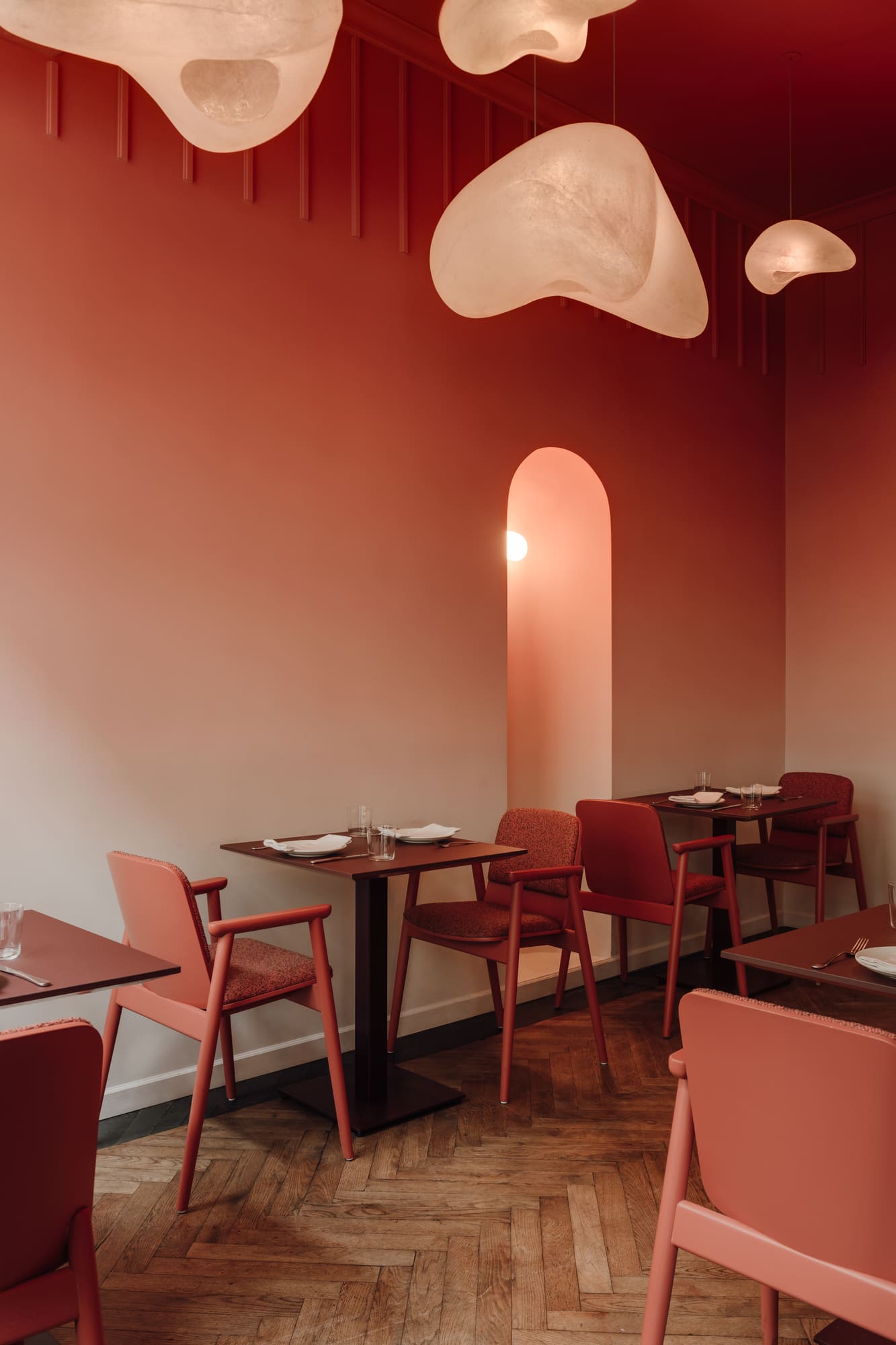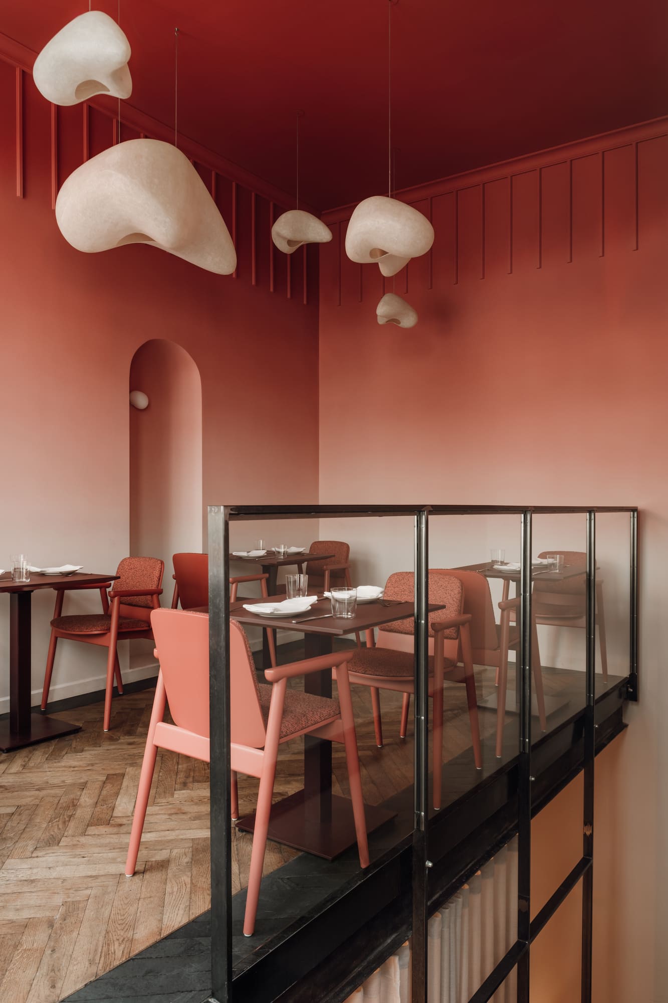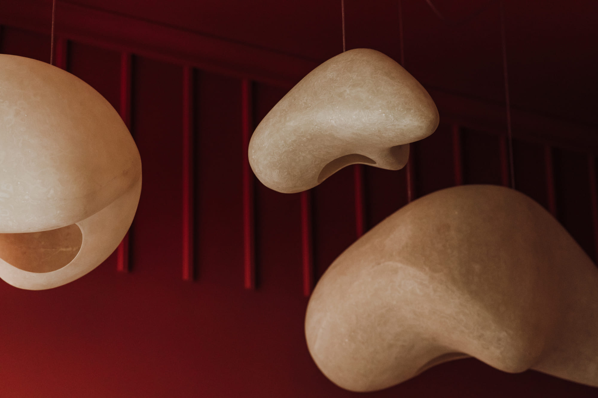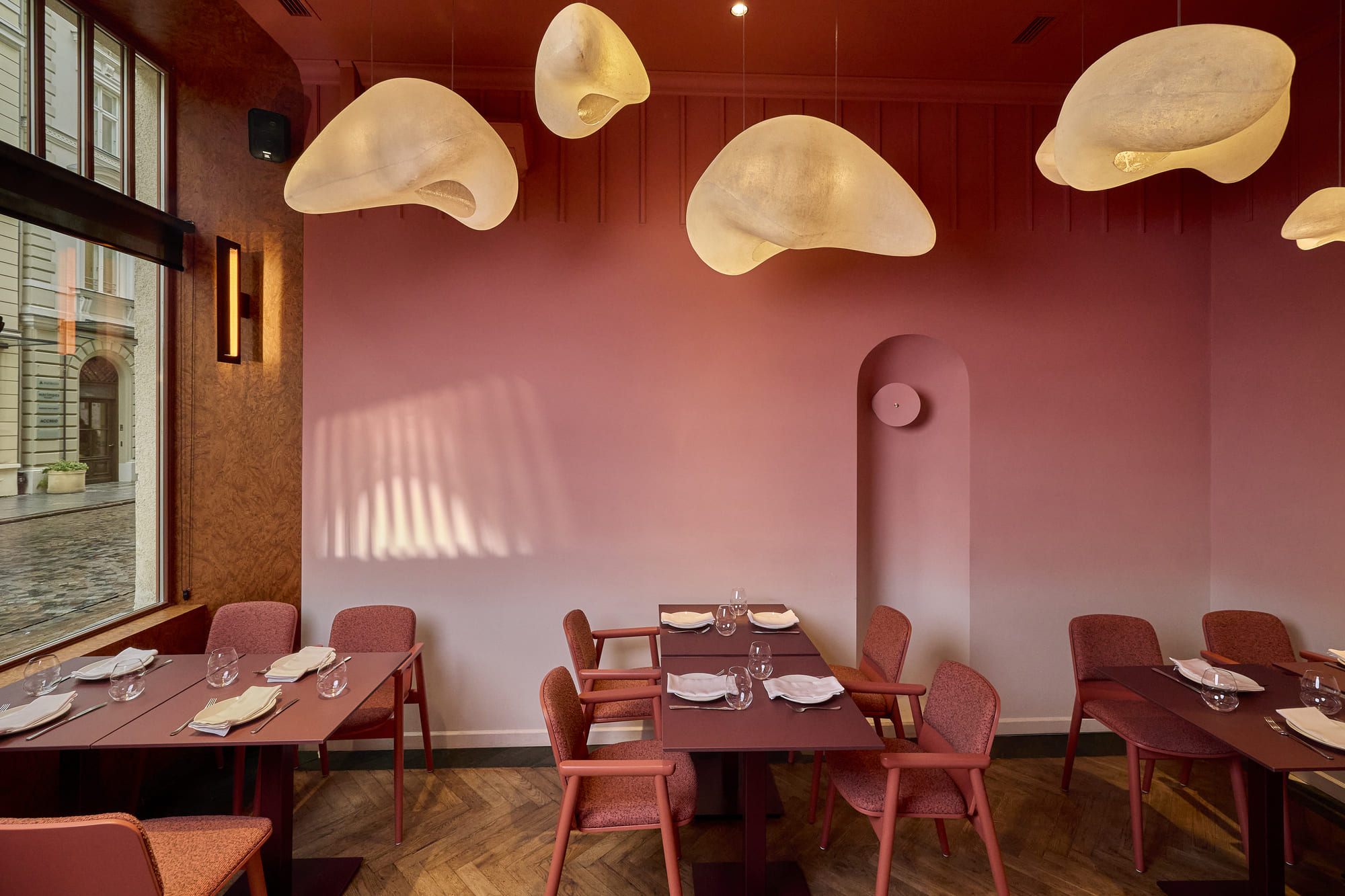 The luminous sculptures by Marek Bimer, reminiscent of swirling clouds, descend with a wine-inspired gradient, illuminating the darkest corners of the historic townhouse.