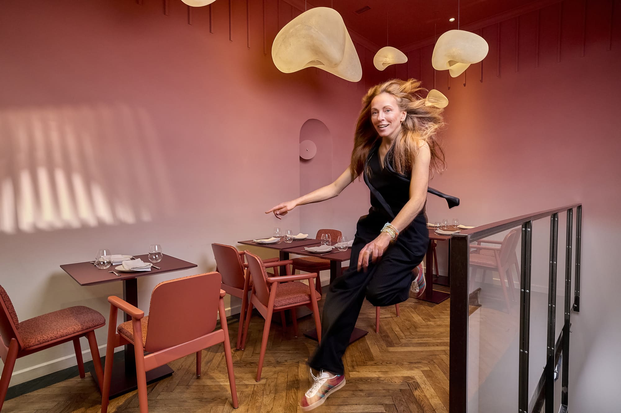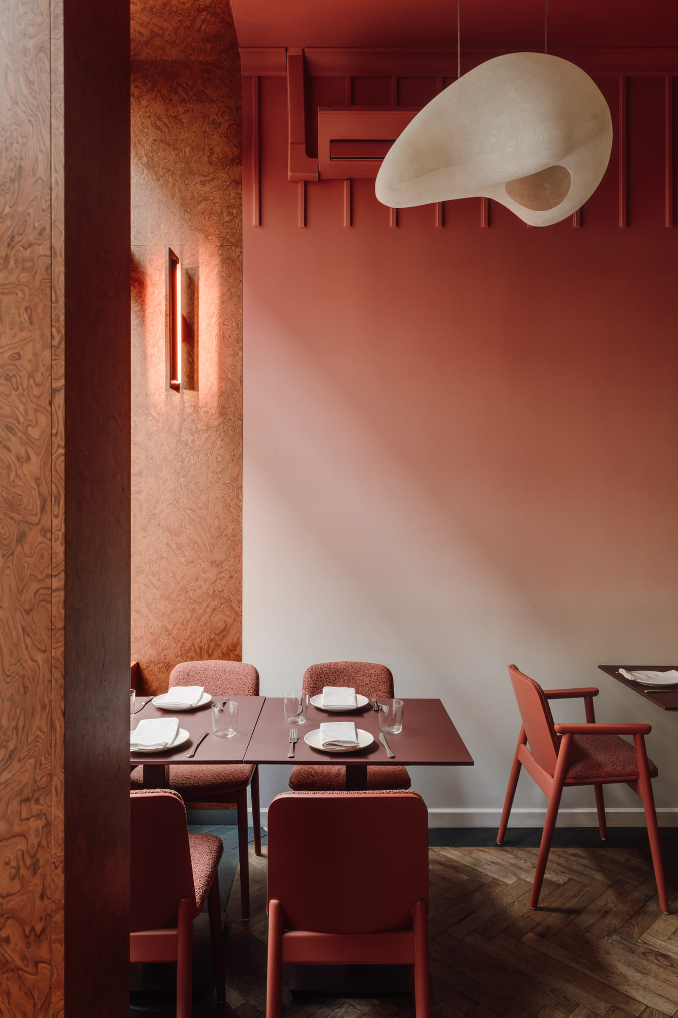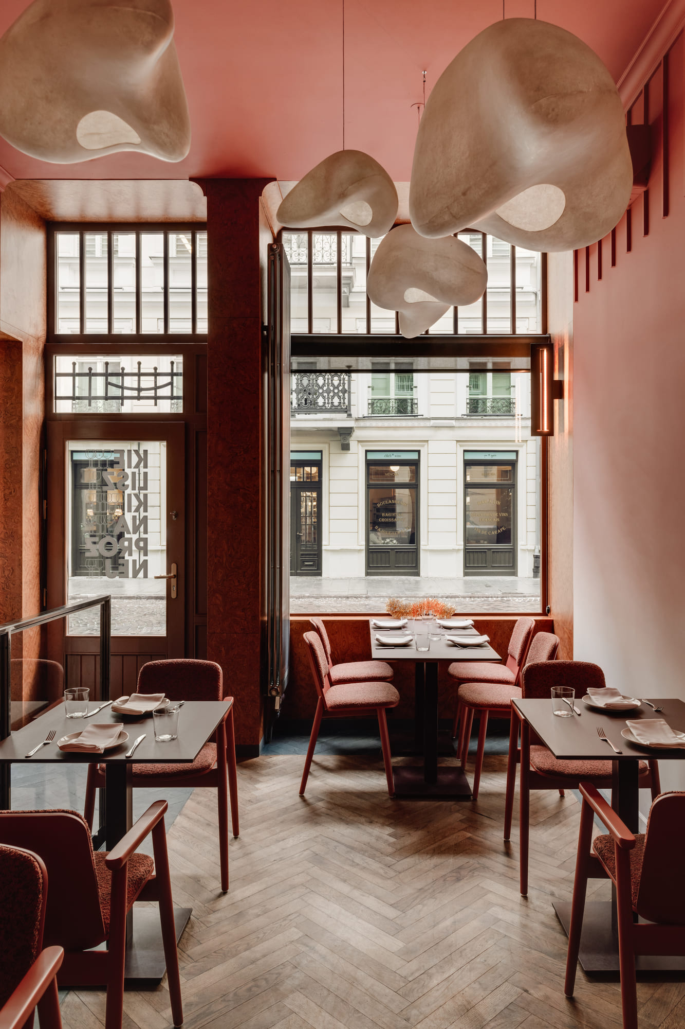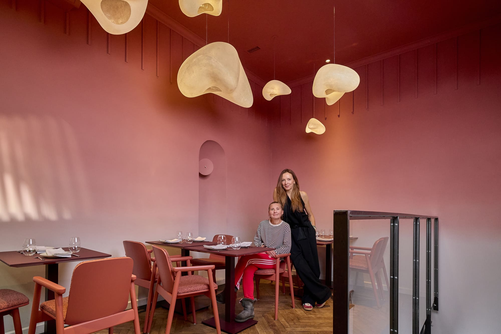 The luminous sculptures by Marek Bimer, reminiscent of swirling clouds, descend with a wine-inspired gradient, illuminating the darkest corners of the historic townhouse.