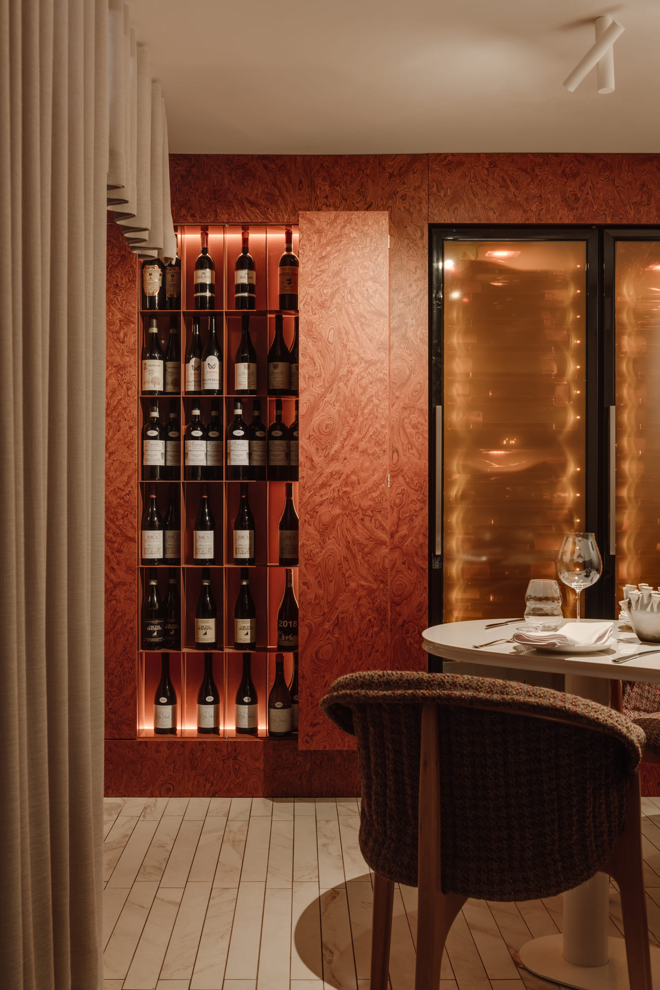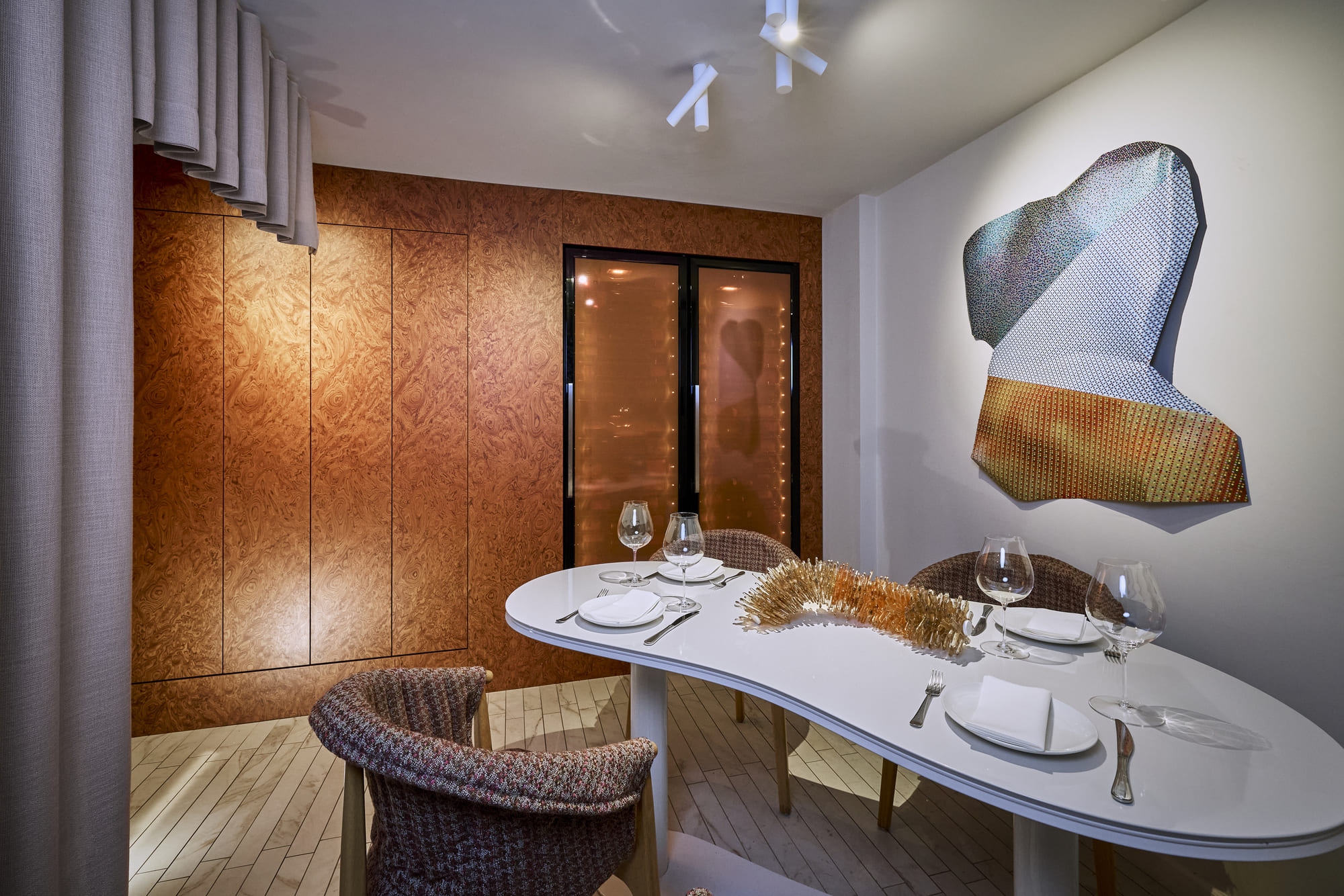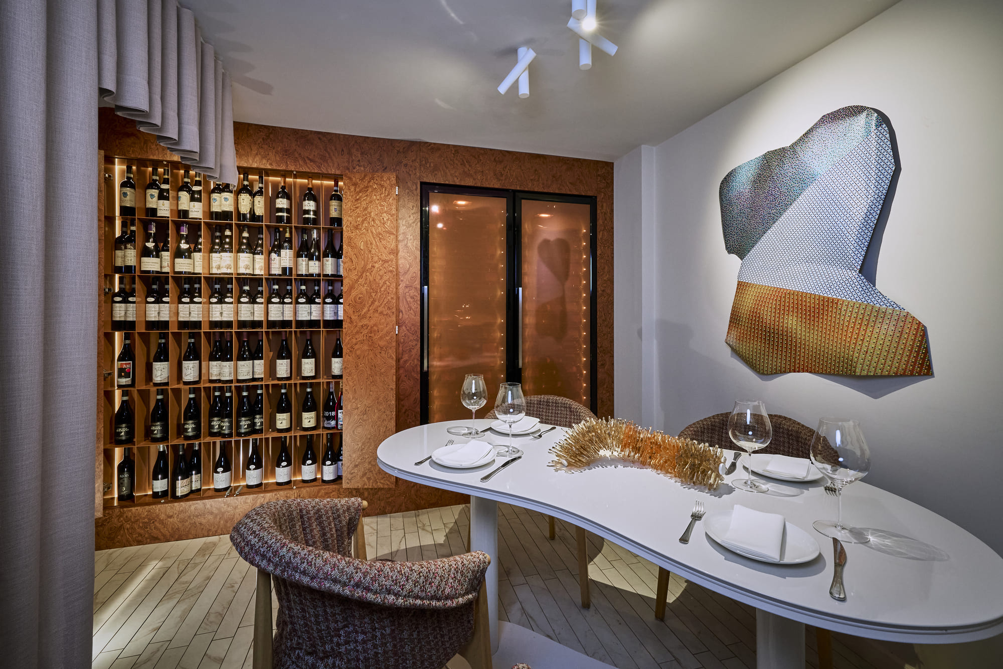 The culmination of light — placed, unexpectedly, in the VIP lower room — cuts off from the outside world, creating an undisturbed space for the contemplation of wine, cuisine, and art. Thanks to a planned cycle of rotating exhibitions, this space is, in our opinion, a powerful way to spark curiosity and surprise both new and returning guests.