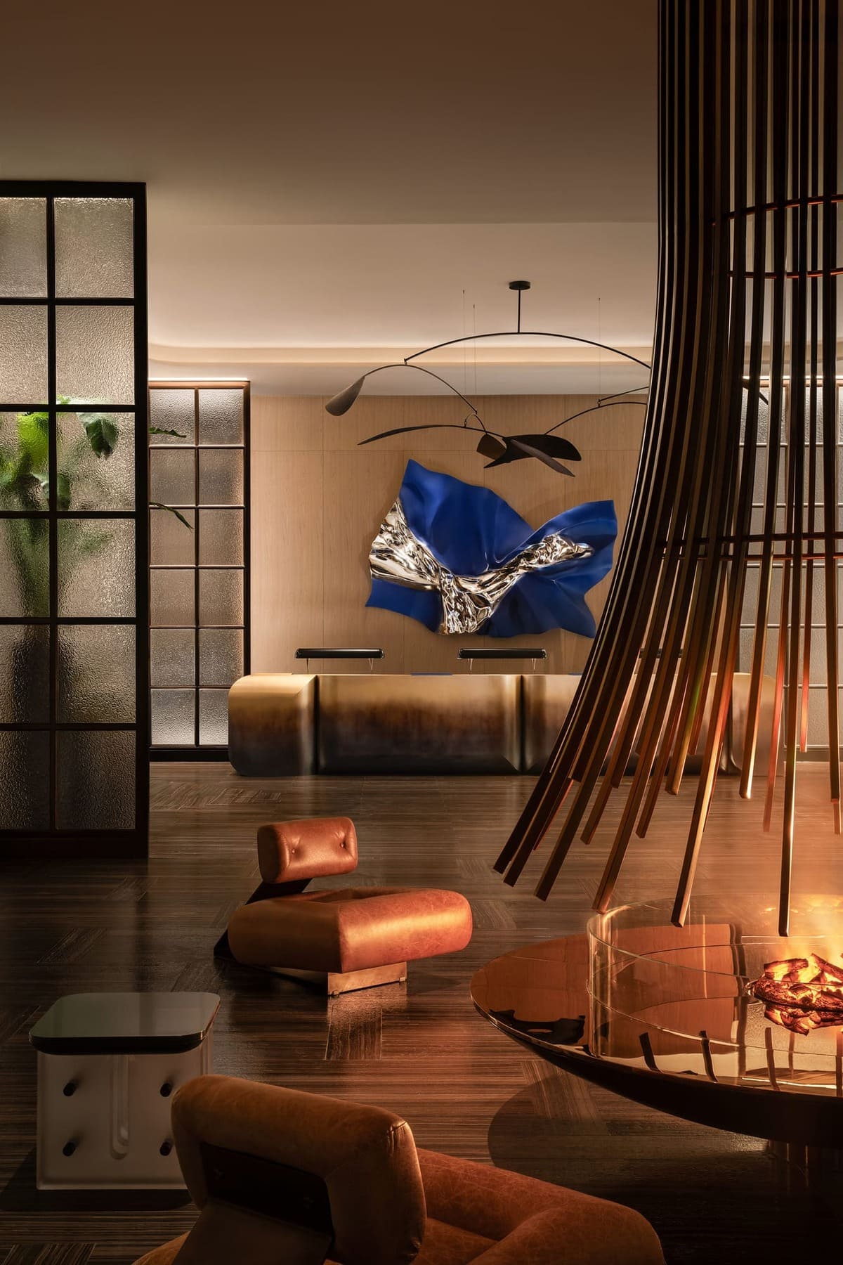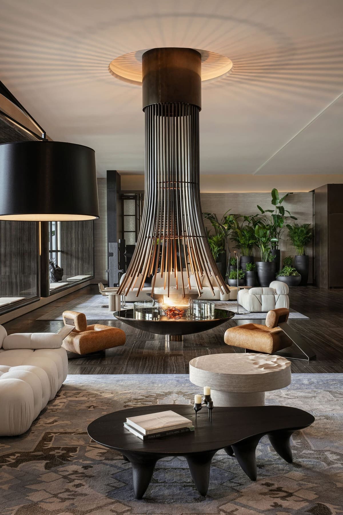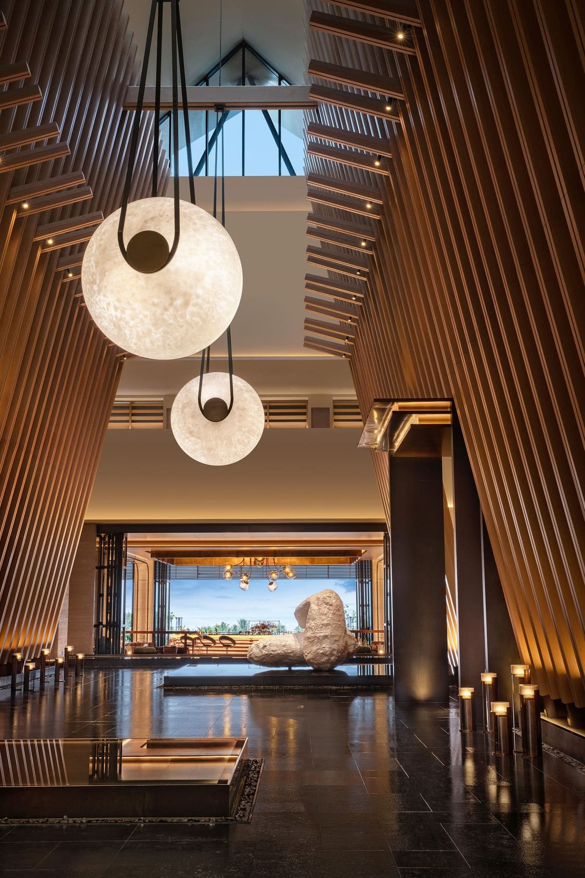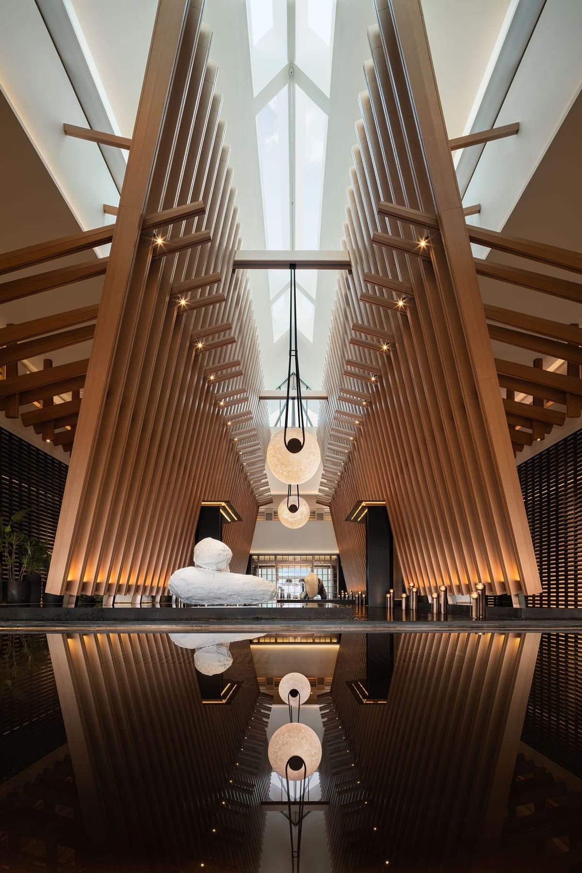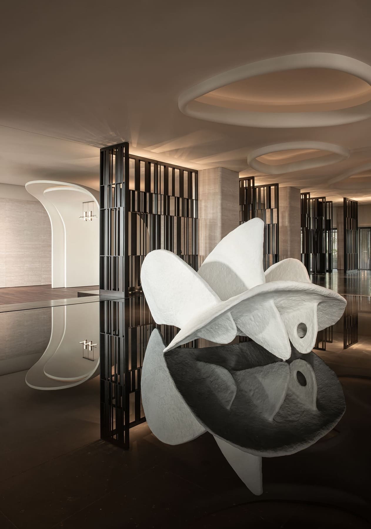 Defying conventional hotel programming, the lobby is redefined as an “Art Atrium,” “Living Room,” and “Leisure Balcony.” The reception zone, centered around a fireplace and encircled by organic curved furniture, creates a welcoming and open social environment. Seven infinity water features, numerous art pieces, and scattered tropical greenery invite guests to slow their pace and immerse themselves in the present moment.