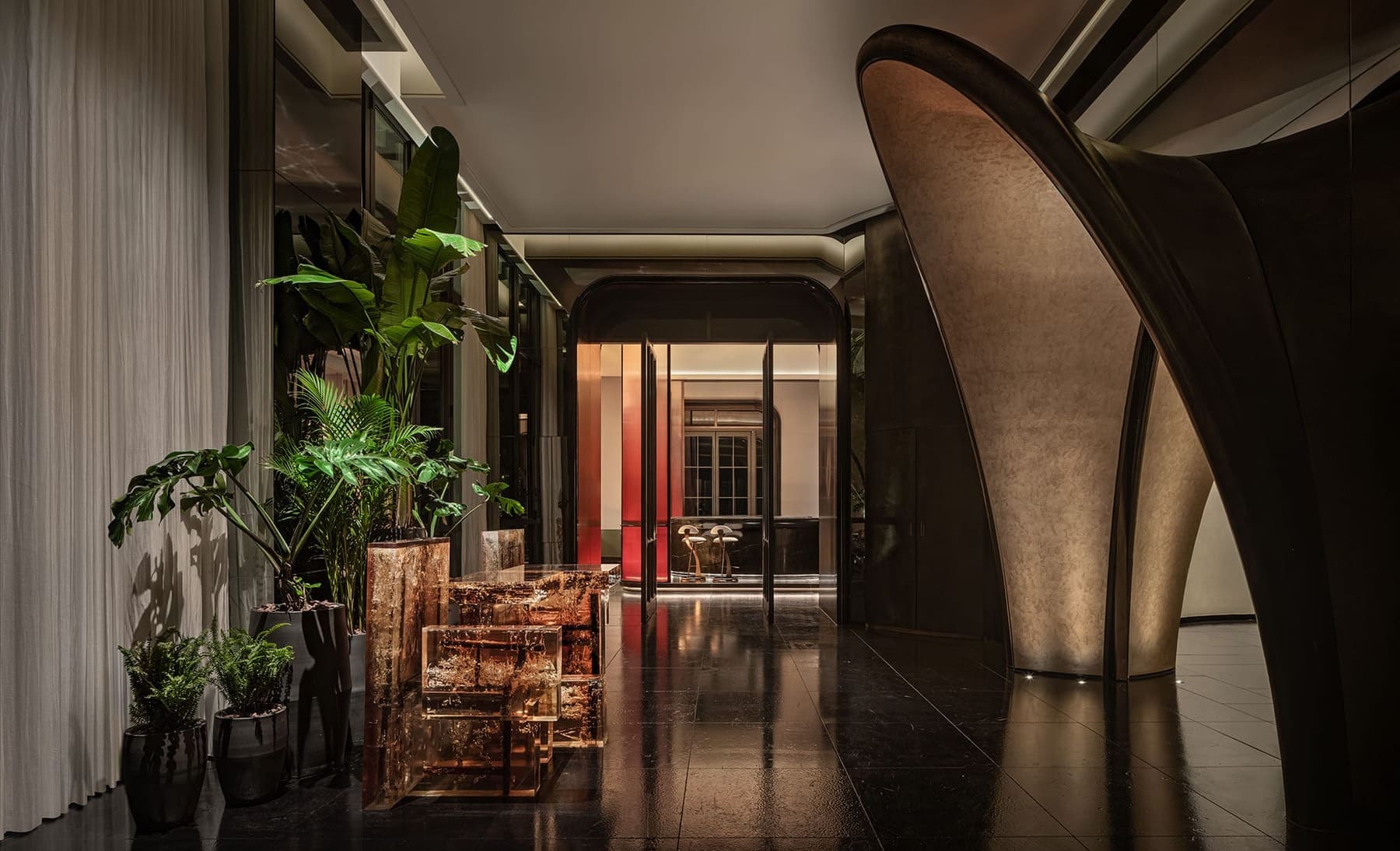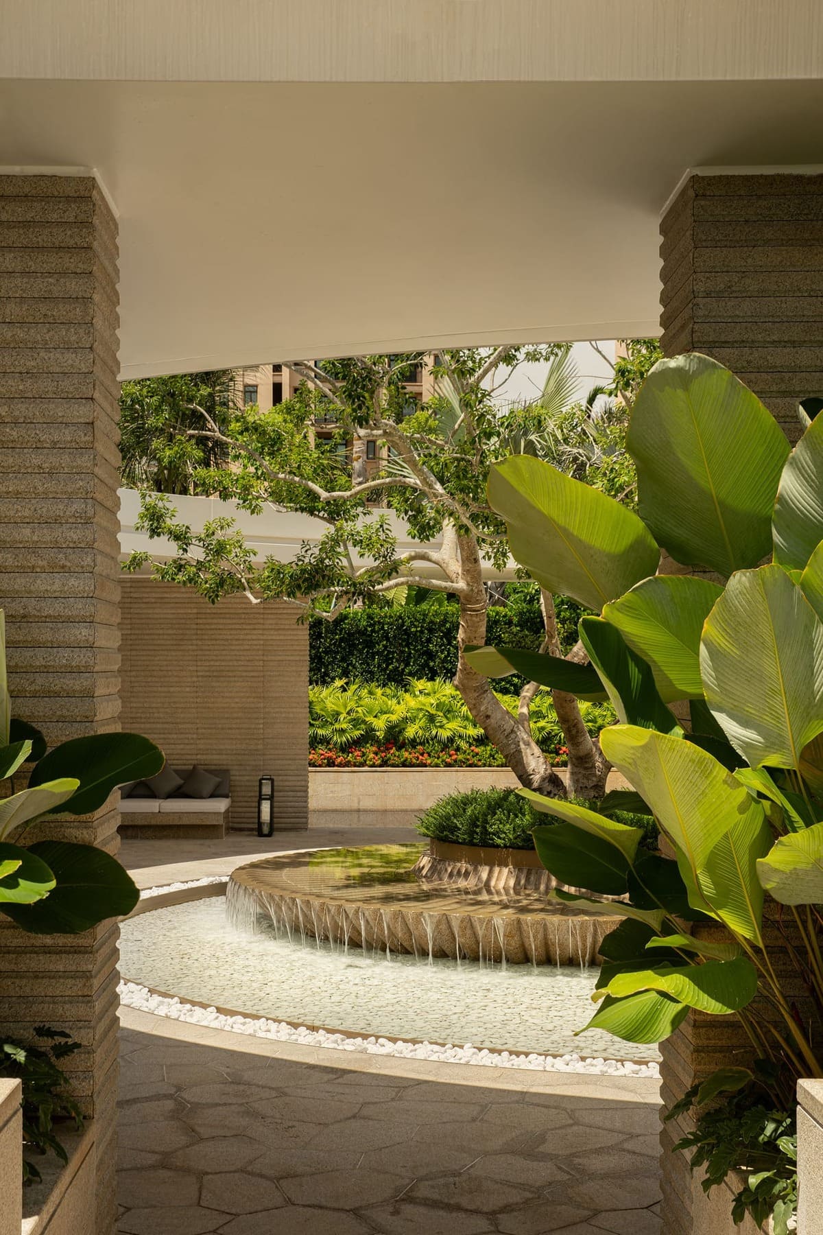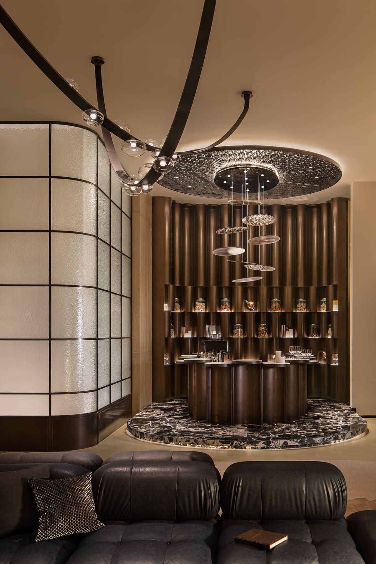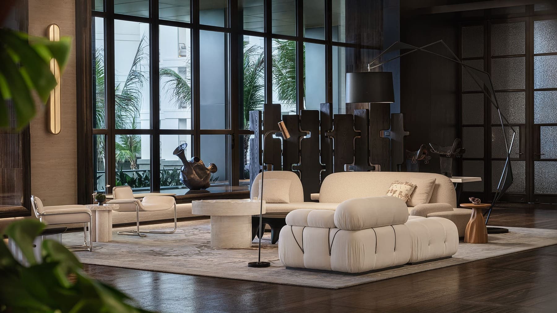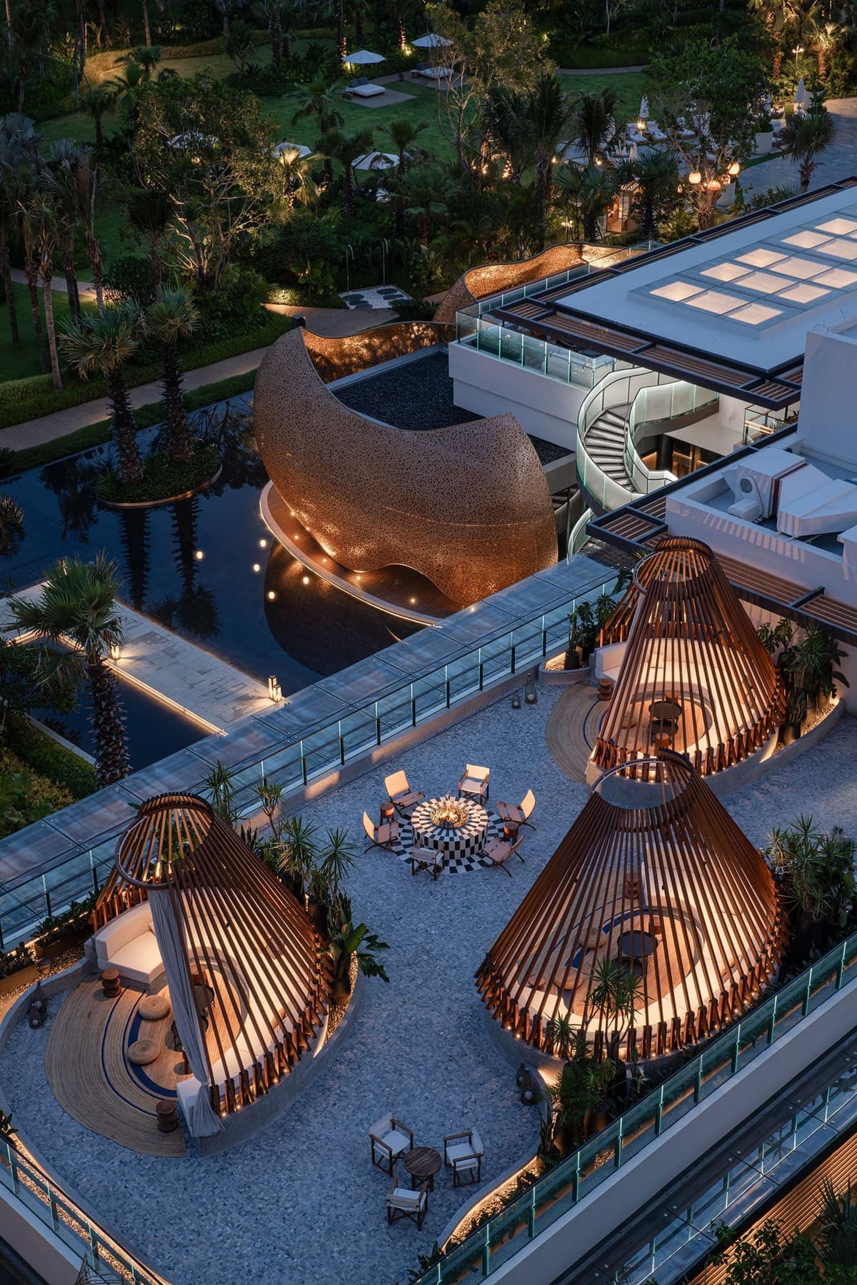 Defying conventional hotel programming, the lobby is redefined as an “Art Atrium,” “Living Room,” and “Leisure Balcony.” The reception zone, centered around a fireplace and encircled by organic curved furniture, creates a welcoming and open social environment. Seven infinity water features, numerous art pieces, and scattered tropical greenery invite guests to slow their pace and immerse themselves in the present moment.