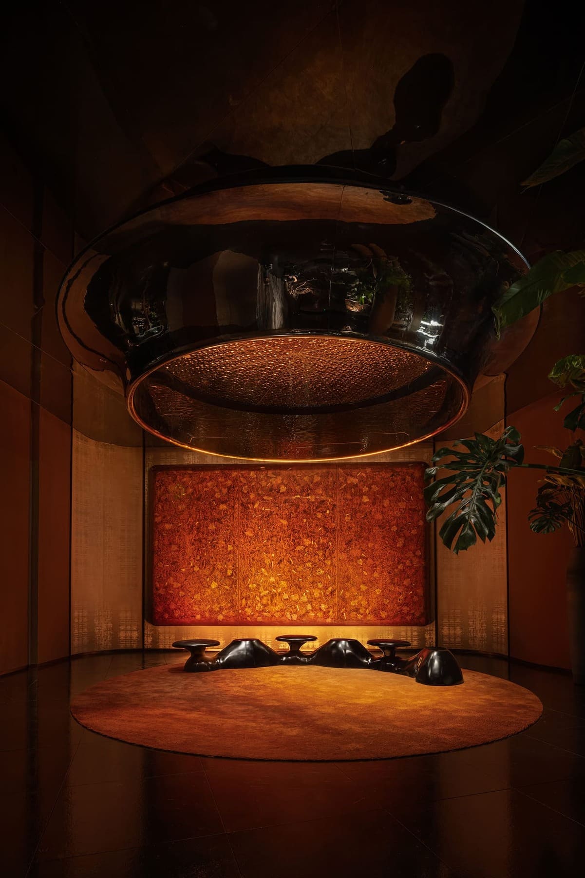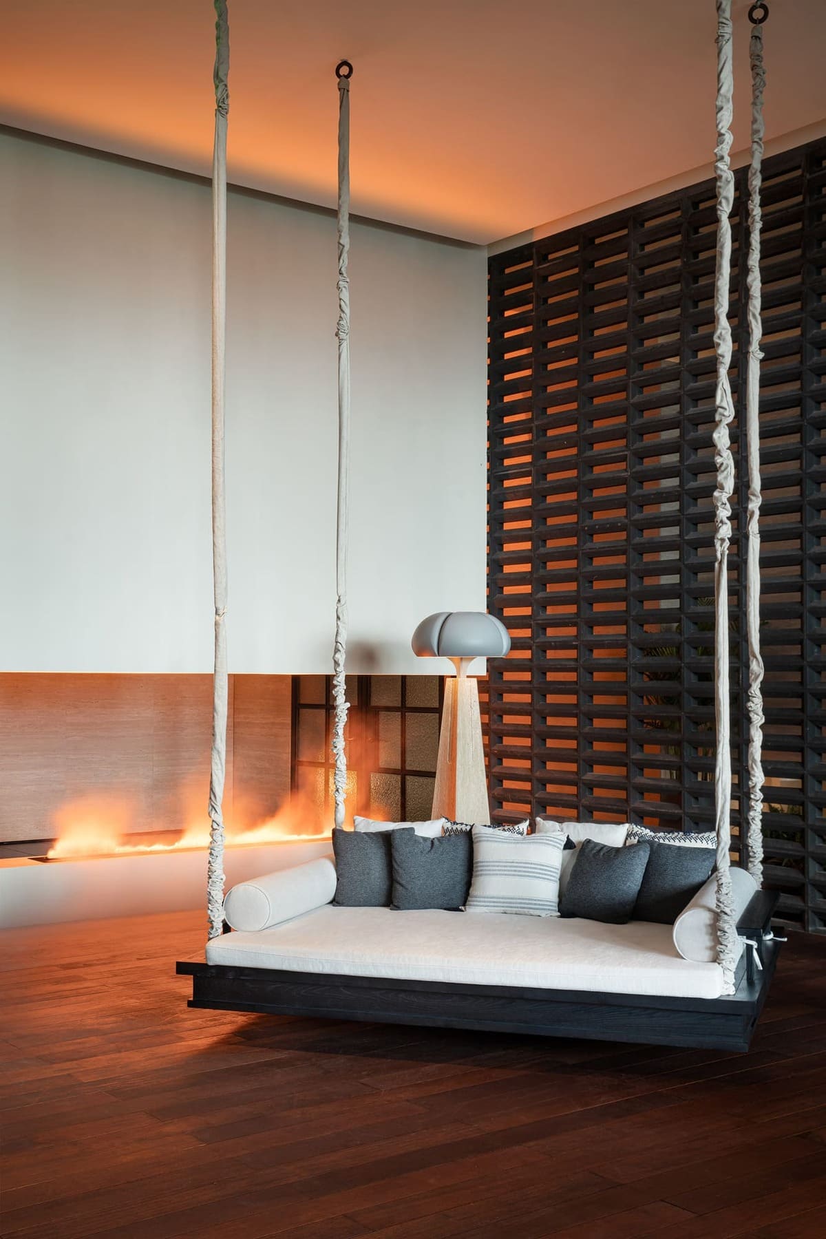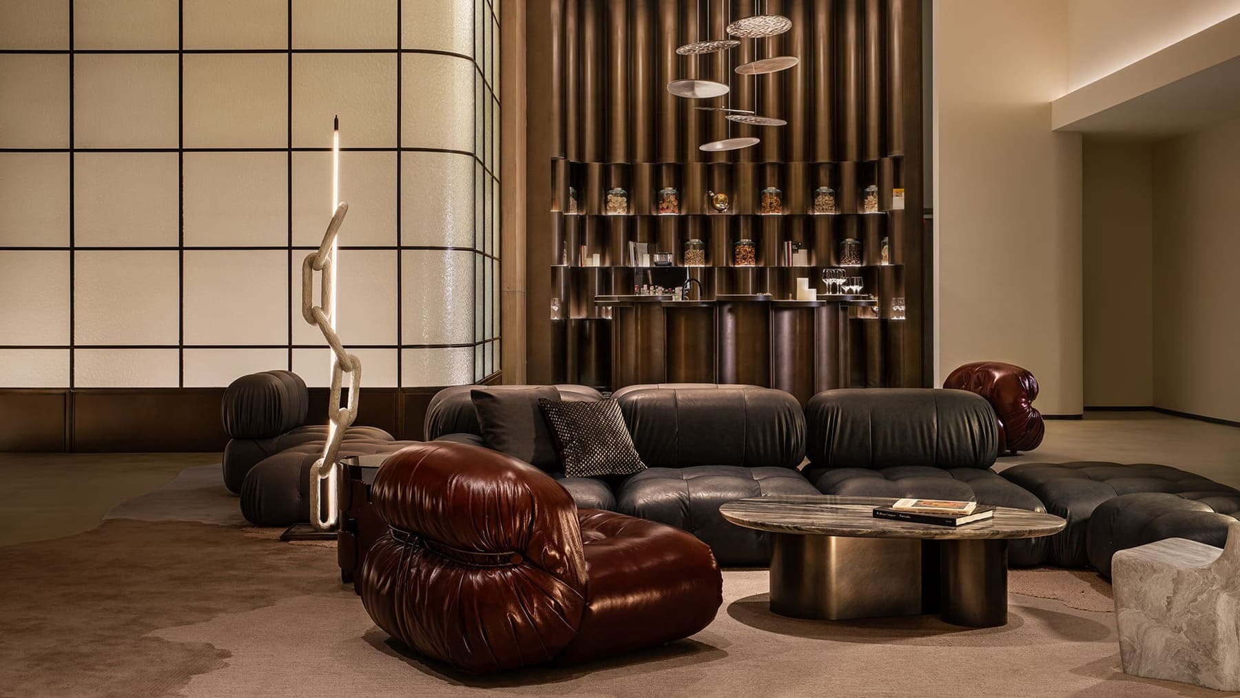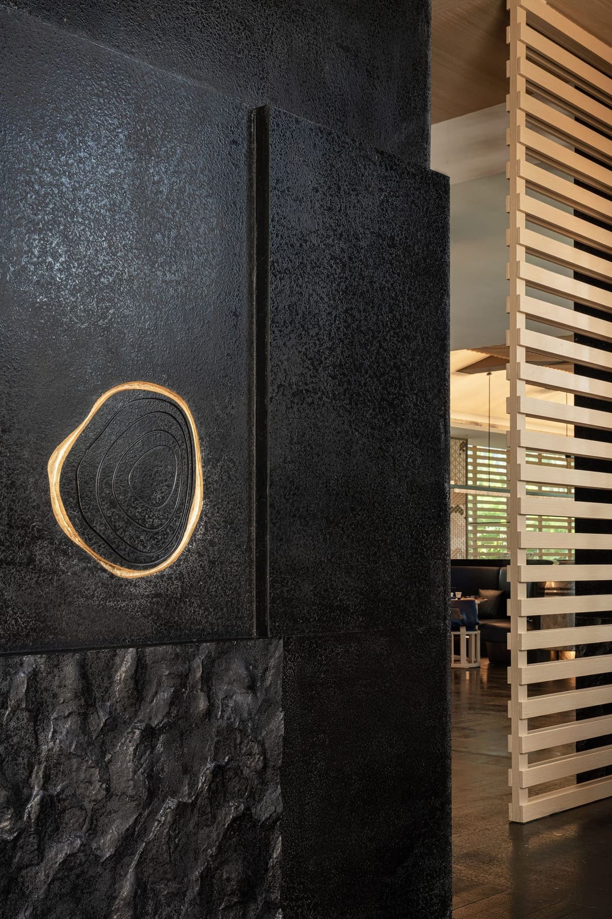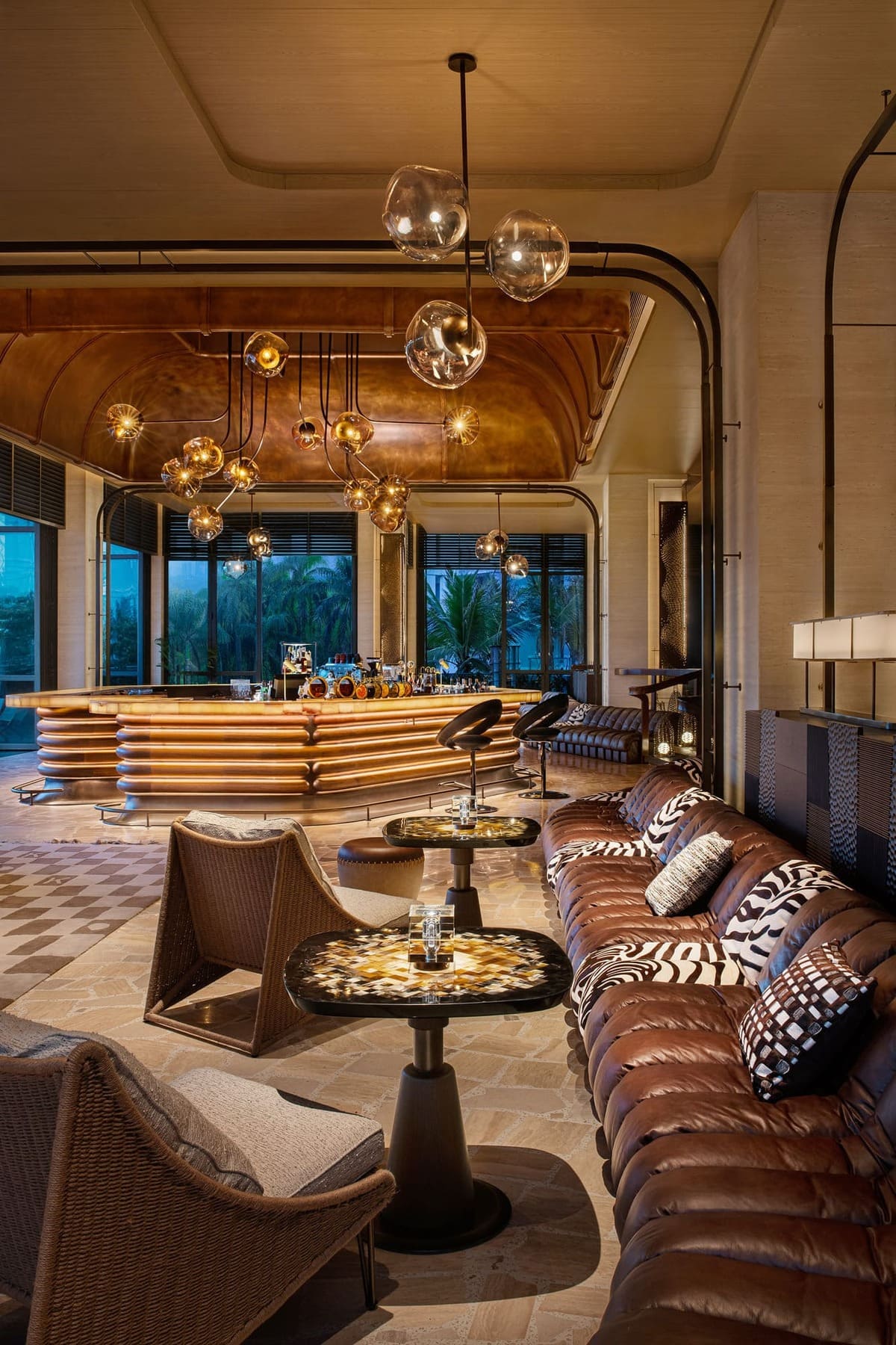 Defying conventional hotel programming, the lobby is redefined as an “Art Atrium,” “Living Room,” and “Leisure Balcony.” The reception zone, centered around a fireplace and encircled by organic curved furniture, creates a welcoming and open social environment. Seven infinity water features, numerous art pieces, and scattered tropical greenery invite guests to slow their pace and immerse themselves in the present moment.