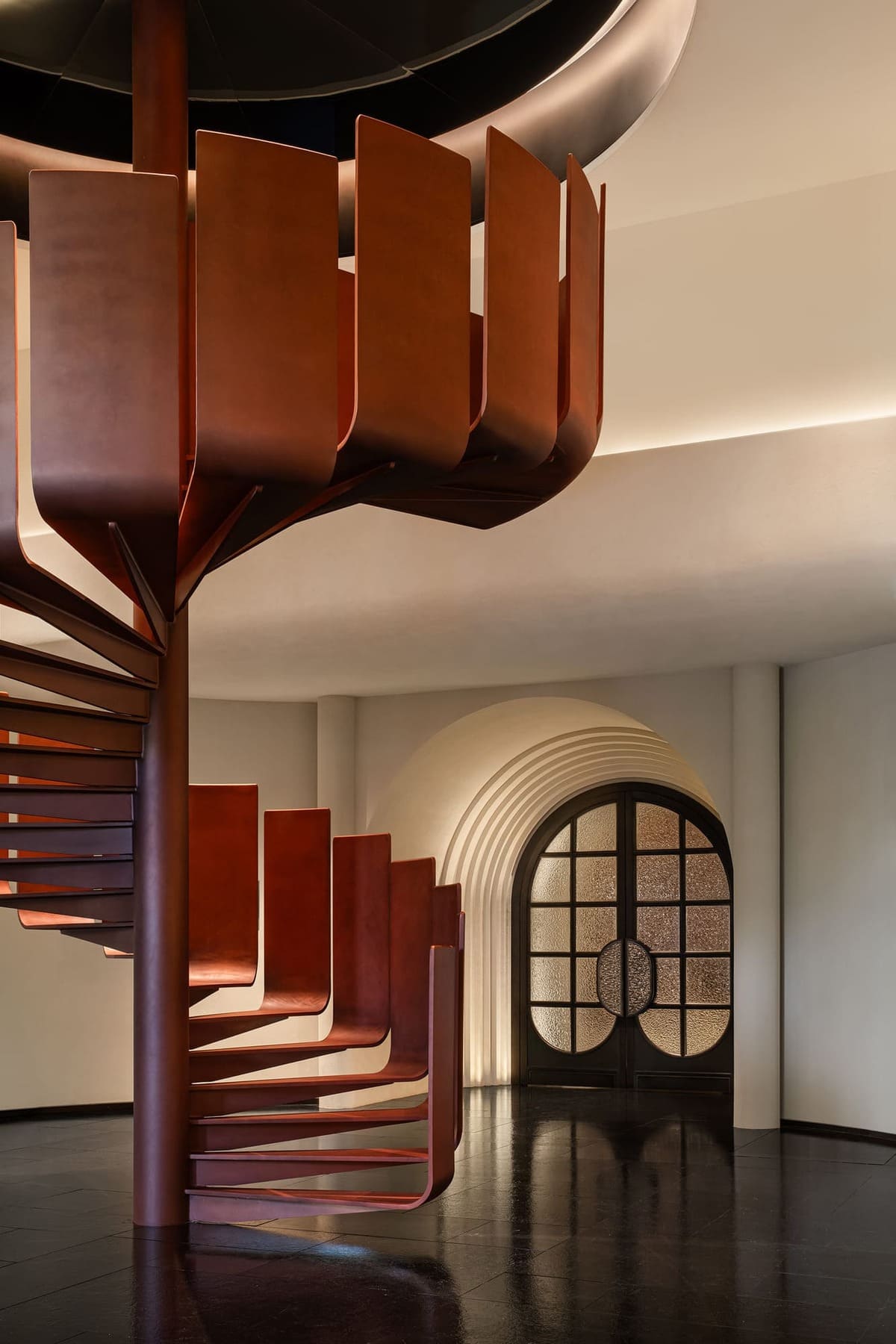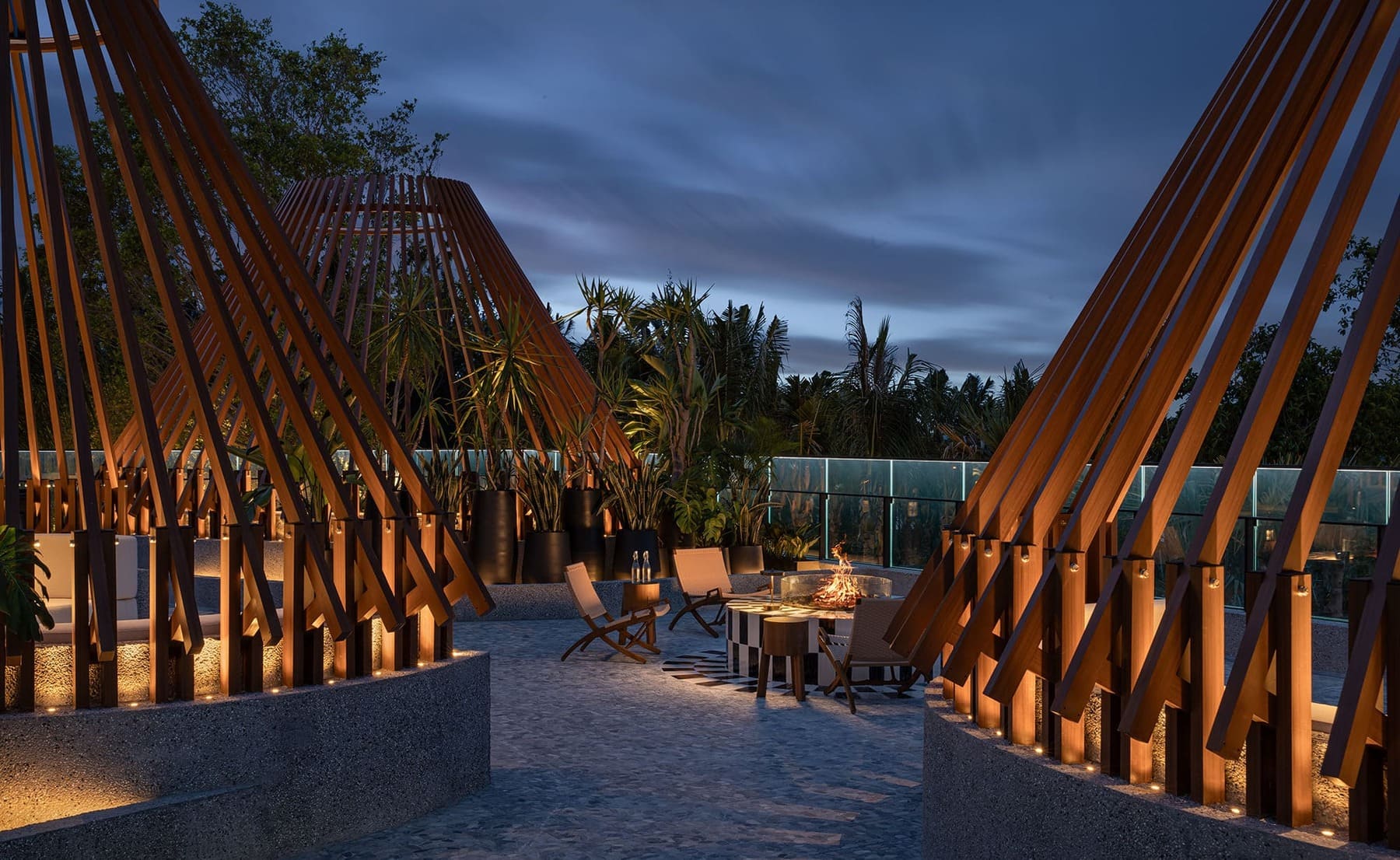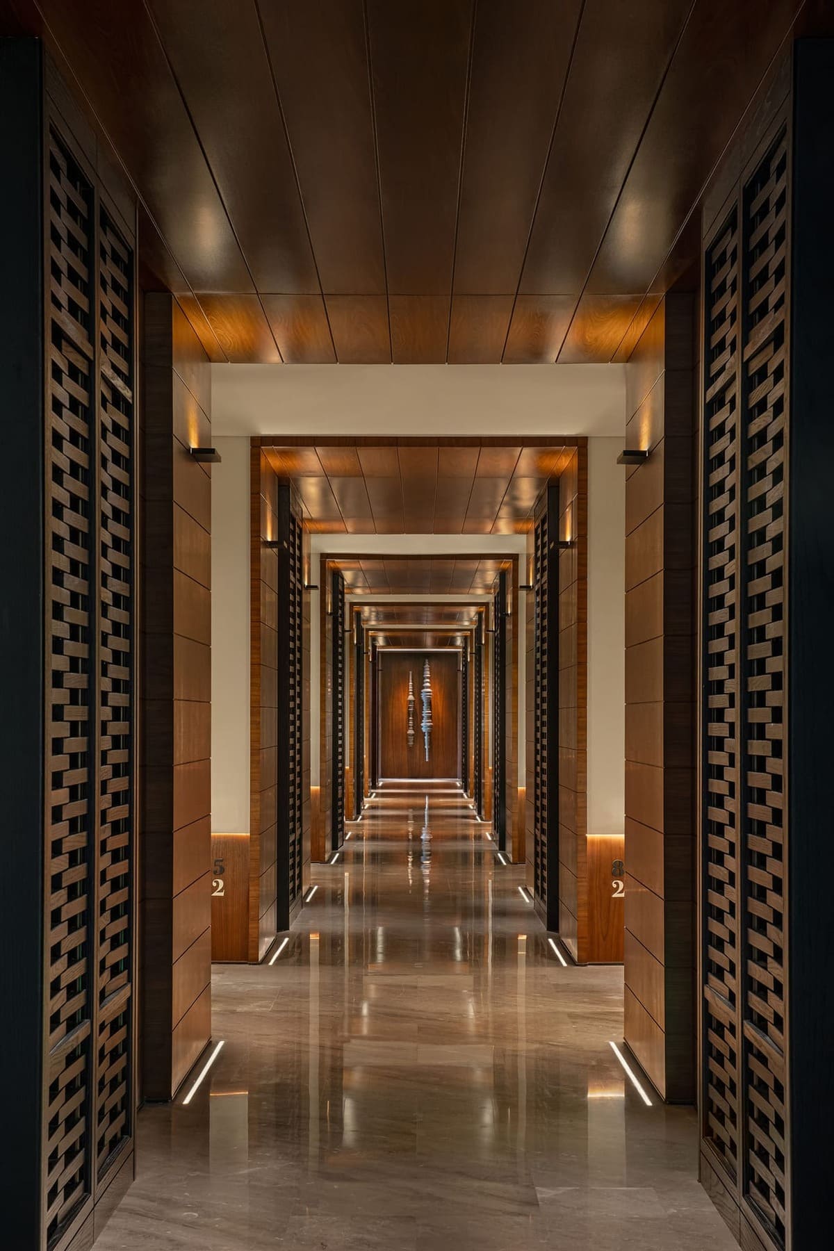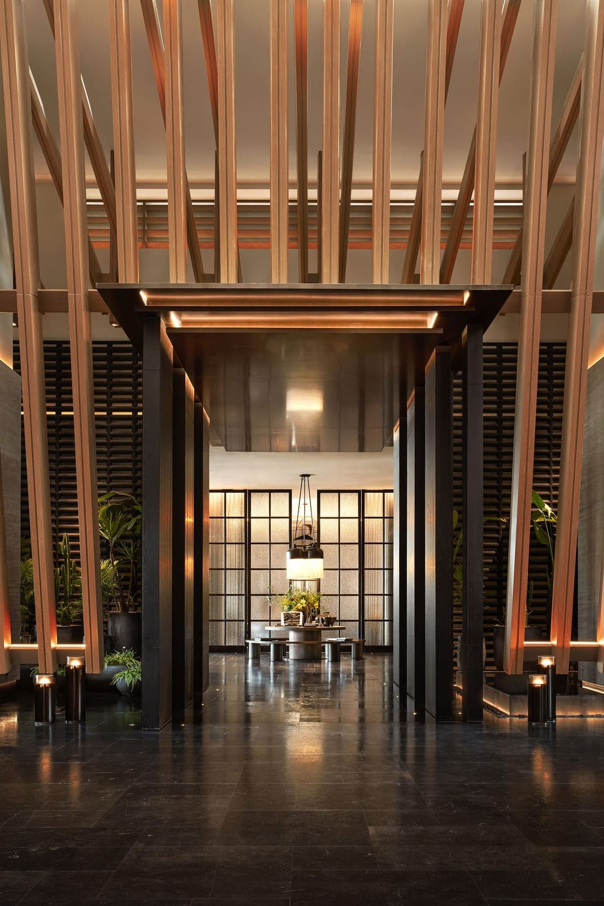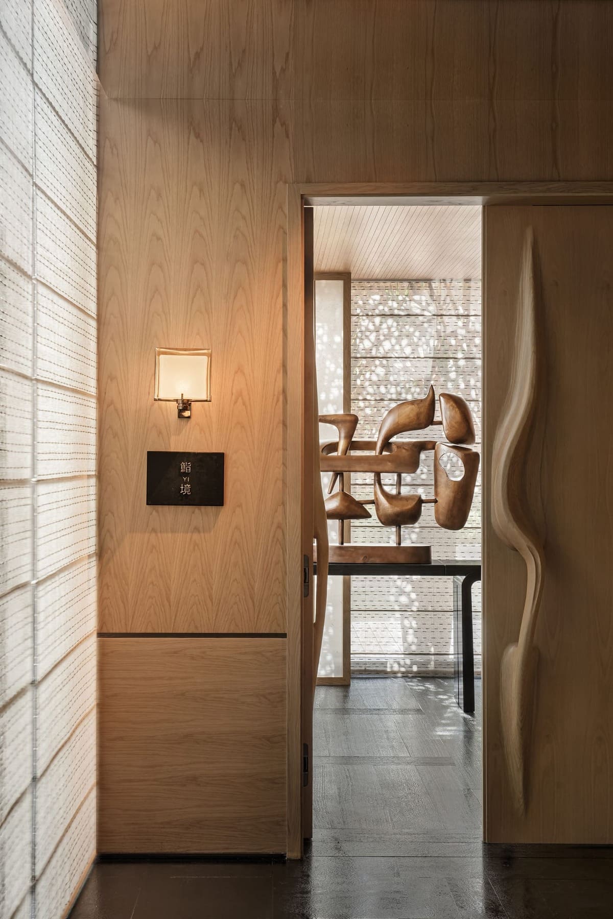 Defying conventional hotel programming, the lobby is redefined as an “Art Atrium,” “Living Room,” and “Leisure Balcony.” The reception zone, centered around a fireplace and encircled by organic curved furniture, creates a welcoming and open social environment. Seven infinity water features, numerous art pieces, and scattered tropical greenery invite guests to slow their pace and immerse themselves in the present moment.