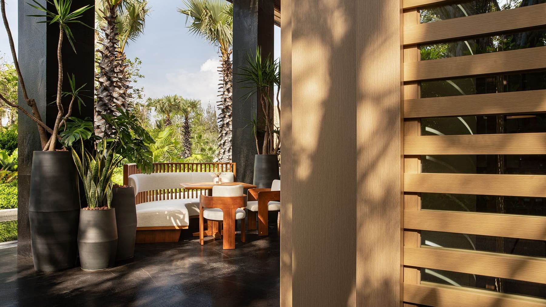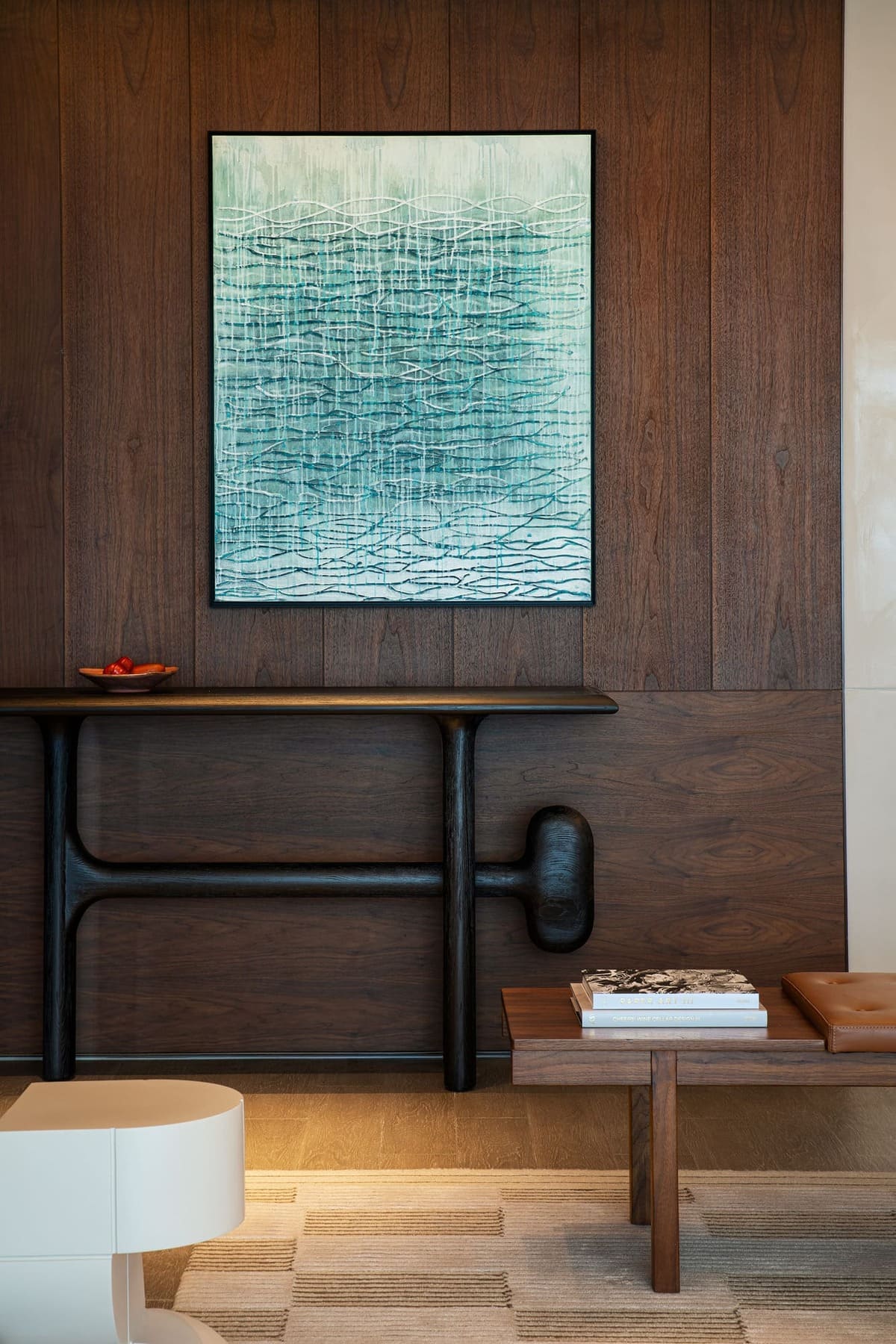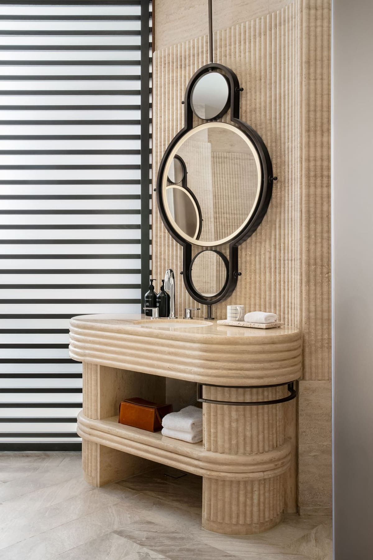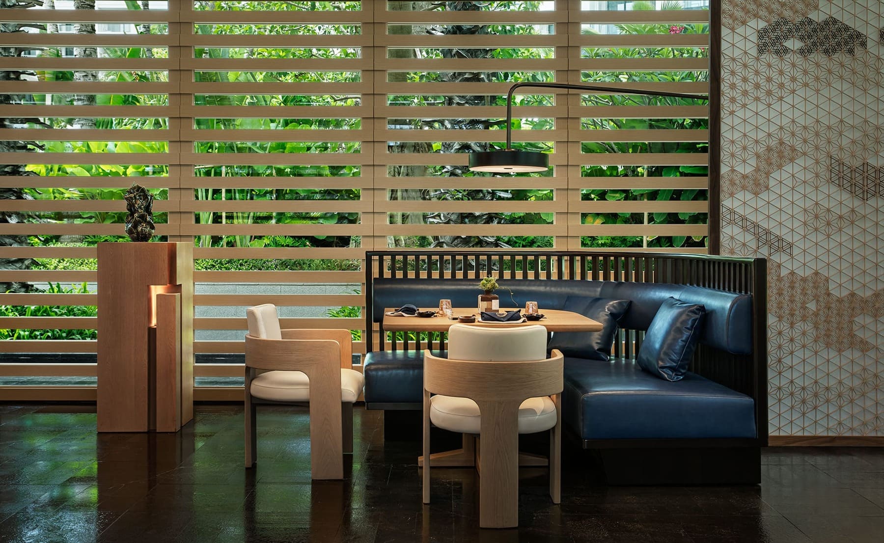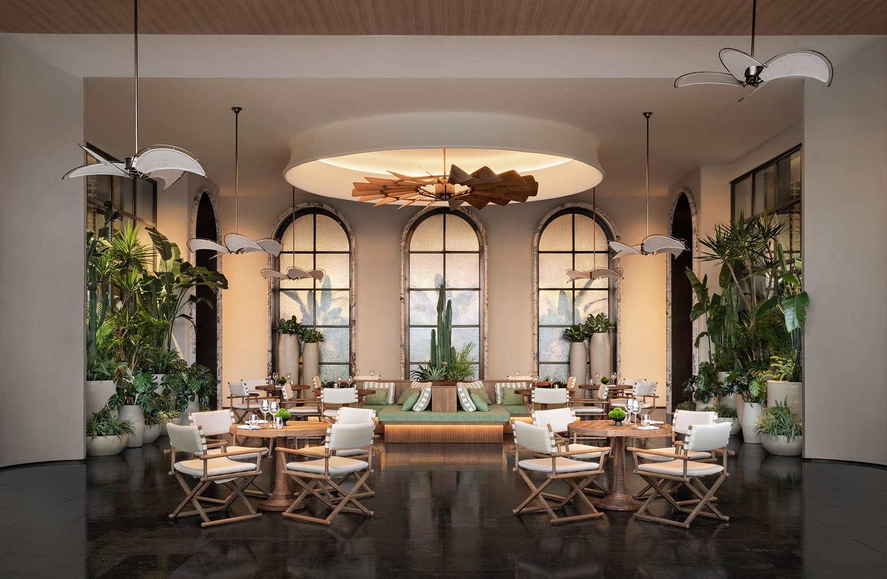 Defying conventional hotel programming, the lobby is redefined as an “Art Atrium,” “Living Room,” and “Leisure Balcony.” The reception zone, centered around a fireplace and encircled by organic curved furniture, creates a welcoming and open social environment. Seven infinity water features, numerous art pieces, and scattered tropical greenery invite guests to slow their pace and immerse themselves in the present moment.