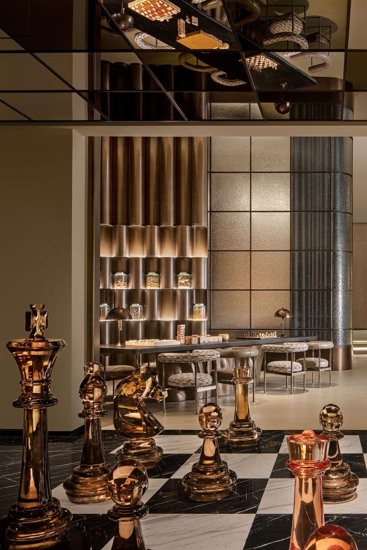 The all-day dining restaurant, Chinese restaurant, Japanese restaurant, and two bars each manifest unique aesthetic realms tailored to their culinary themes, resonating deeply with the Kimpton brand DNA. The Games Chamber, integrating chess, billiards, and a screening room, offers tranquil yet socially engaging leisure spaces. An e-sports center specifically addresses the lifestyle preferences of Generation Z. Guestroom furnishings extend the muse’s collecting sensibilities, featuring personalized bespoke pieces imbued with narrative depth. Even easily overlooked “grey” spaces are meticulously designed, ensuring that guests continually encounter unexpected moments of delight while wandering, pausing, and observing.