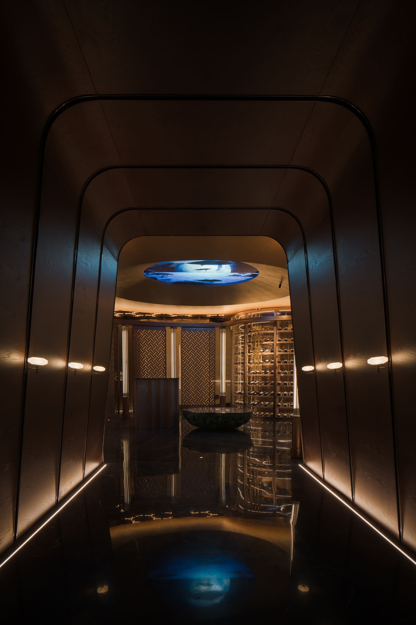 Guests traverse a long corridor illuminated with light art, which evokes the feeling of an underwater wonderland. The corridor is flanked by private dining rooms, each themed around mythical beasts from Shanhaijing. Upon reaching the open dining area, a bar counter crafted from translucent stones immediately commands attention, serving as the centerpiece of the space. The open seating area offers expansive views of Shanghai’s iconic skyline, including the World Financial Center, Jin Mao Tower, and Shanghai Tower. Here, guests are invited to immerse themselves in the charm of mountain and sea culture, beautifully fused with the urban landscape.
