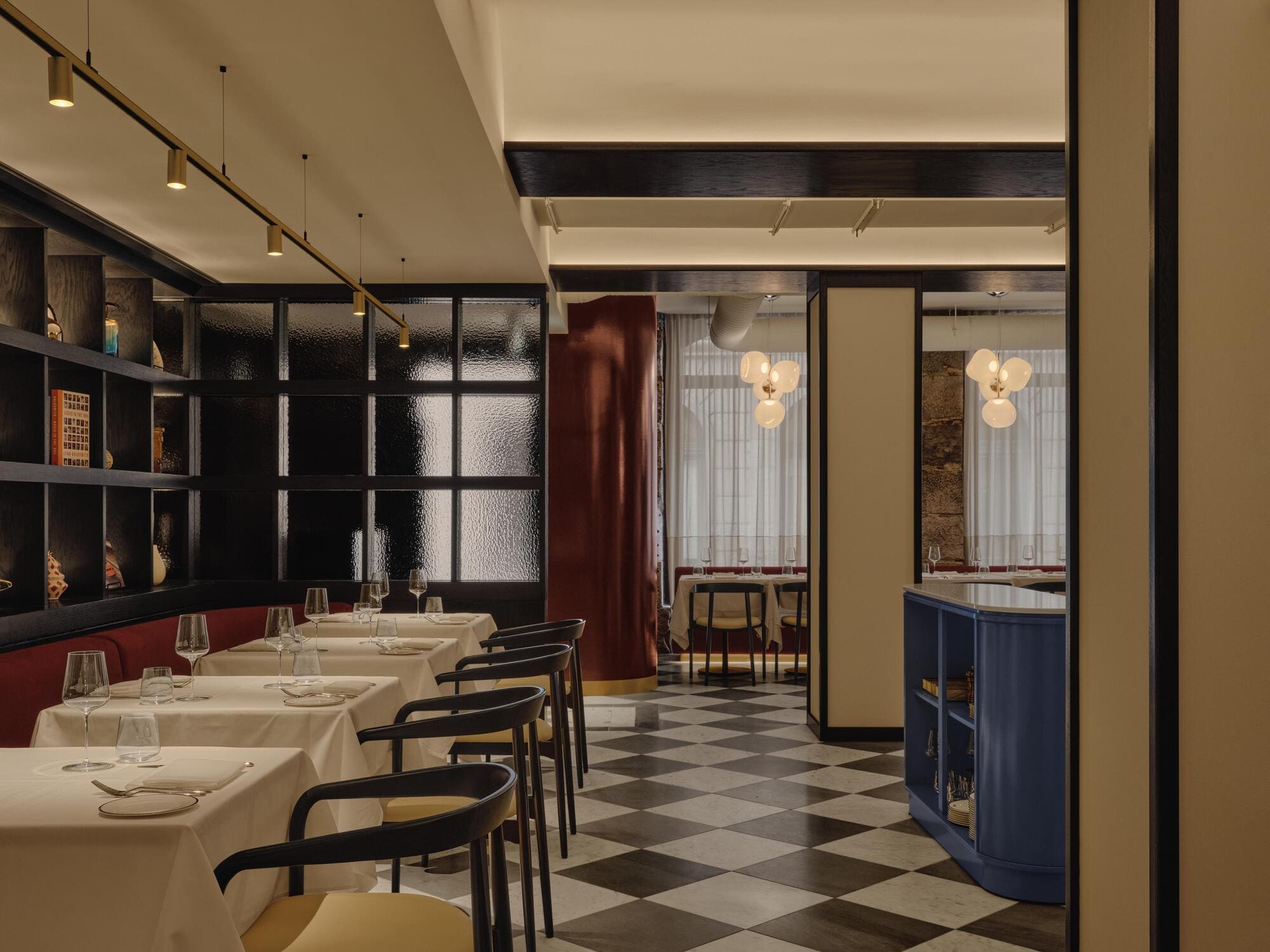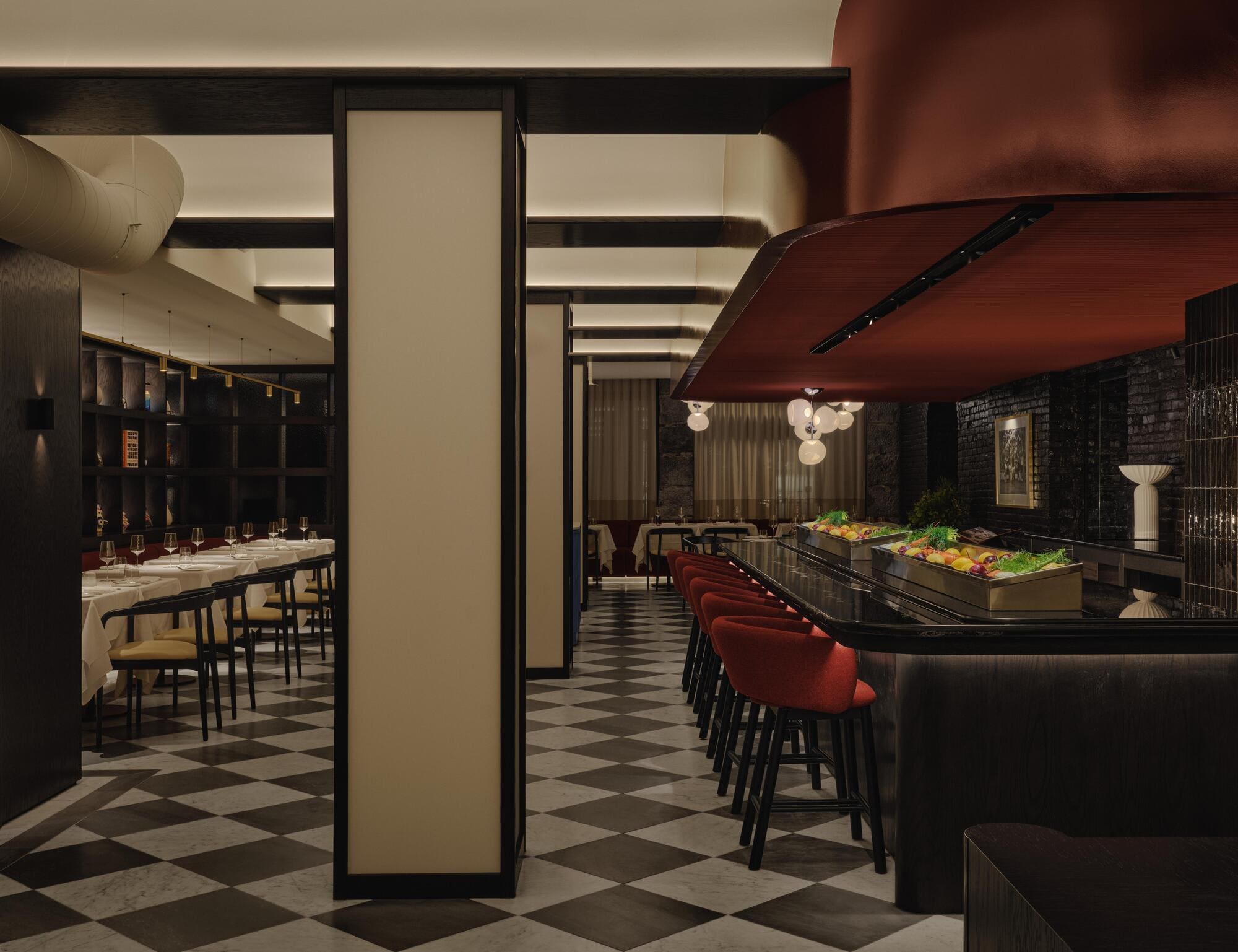 At the heart of the space, the crudo bar commands attention as the restaurant’s architectural centerpiece. Designed as an open central island in black marble, it organizes the dining room’s flow and sightlines, while providing a dramatic backdrop to the fresh fish prepared there. This focal point guides the eye and sets the rhythm of the spatial experience, turning the preparation of seafood into a visual and culinary performance.