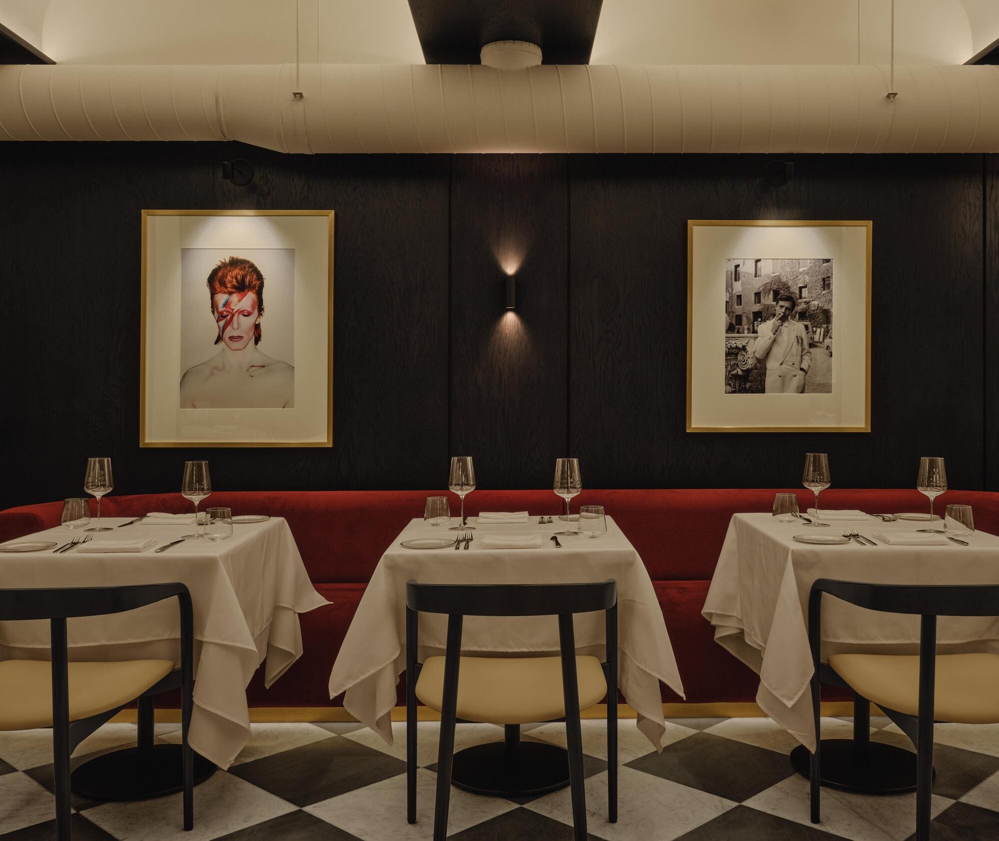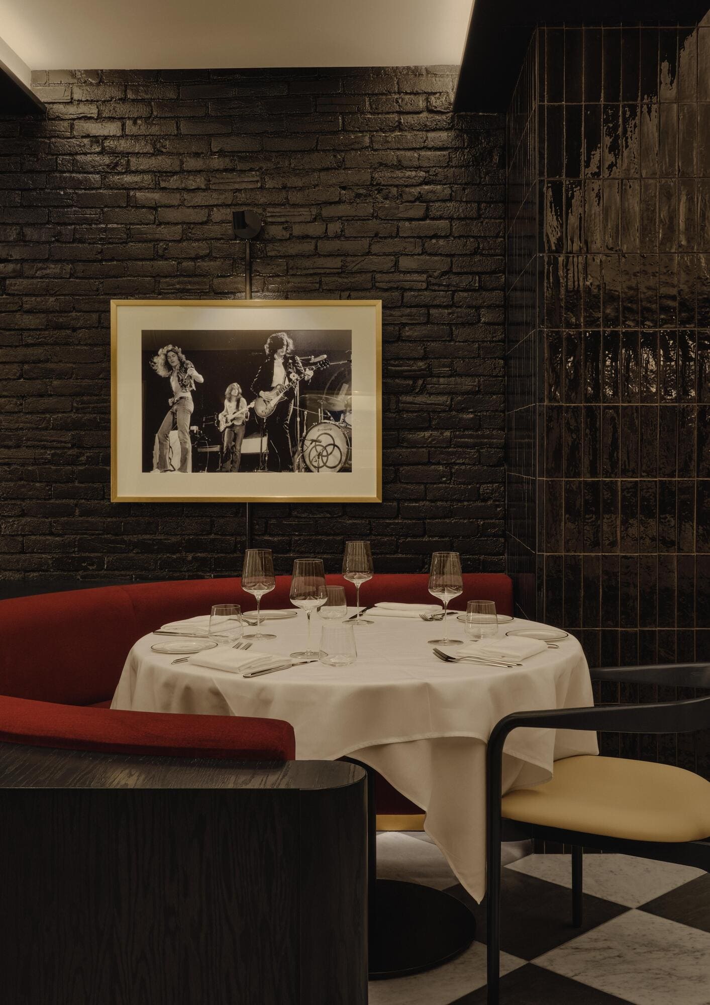 The main dining room is distinguished by its higher, vaulted ceilings, which amplify natural light and give breath to the space — shaping its singular atmosphere. The marble checkerboard floor creates a strong graphic anchor and pays homage to Italian heritage. Textural plays of brick and porcelain recall the raw simplicity of coastal materials, while the rounded shapes of the drop ceiling and entrance wall nod to portside fishing – both in form and in color – subtly echoing boat hulls. On the walls, photographs blend Italian icons with contemporary American figures, creating a visual narrative that roots Mare in its cultural heritage, while celebrating the restaurant’s unique identity. The eclectic mix sparks conversation and adds depth to the ambiance.