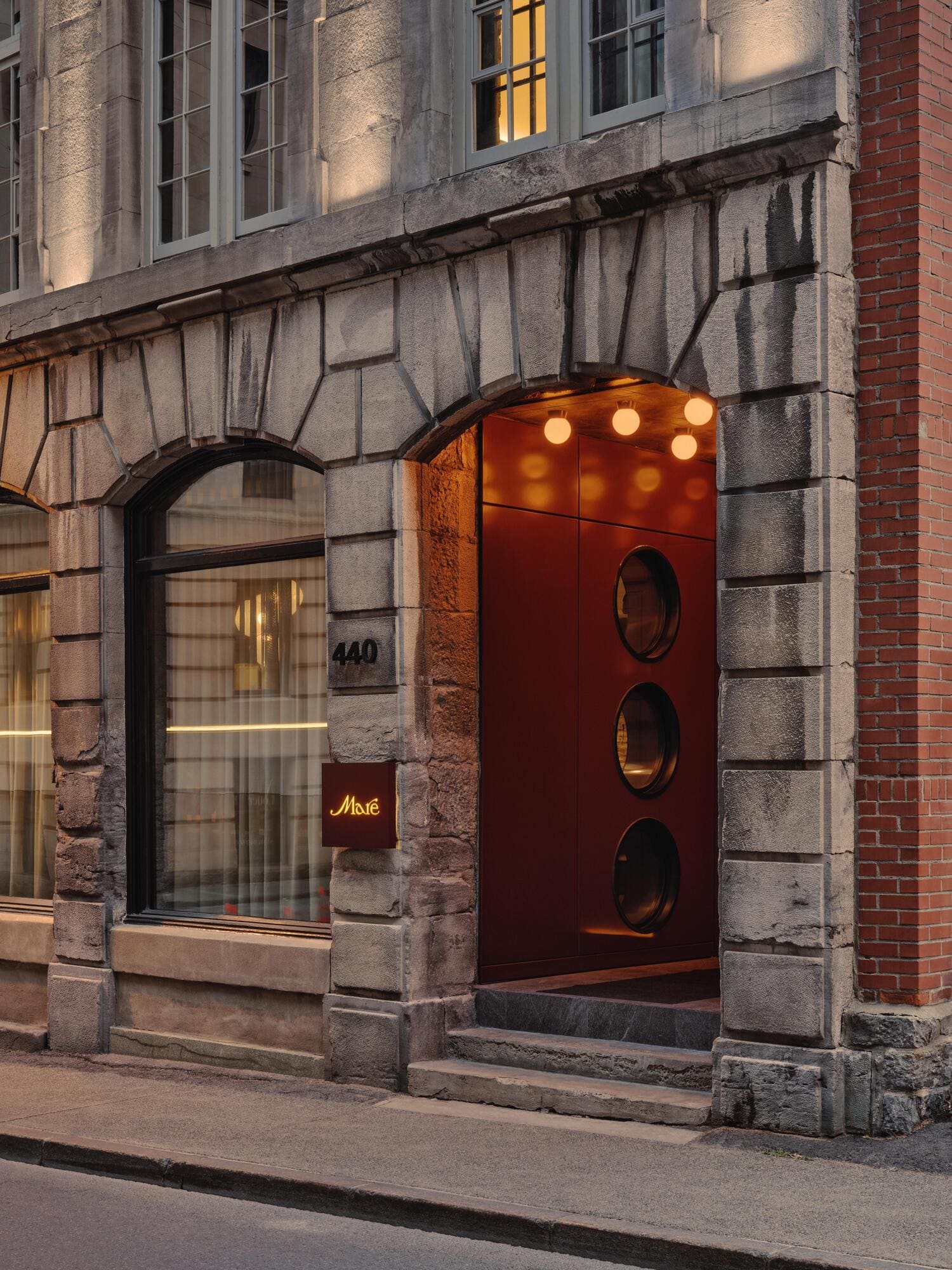 From the street, the restaurant’s generous glass façade, accented by two-tone drapes, offers glimpses of its lively interior. The intimate entrance provides a clear transition from the bustle of the Old Port to the restaurant’s hushed ambiance. Portholes and deep rust-hued metal panels frame this passageway, hinting at the unique experience that lies ahead.