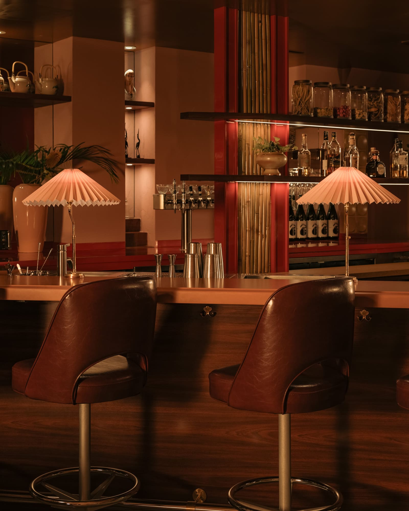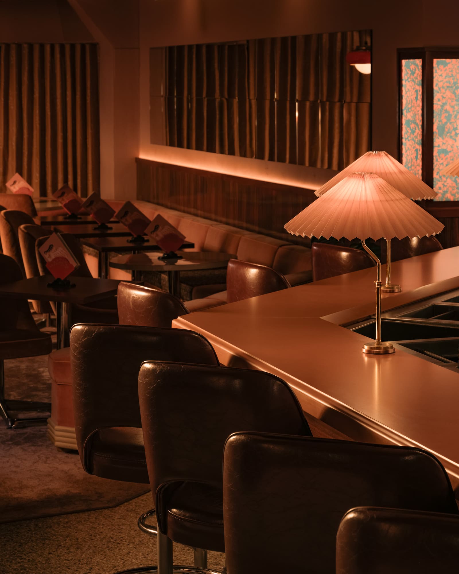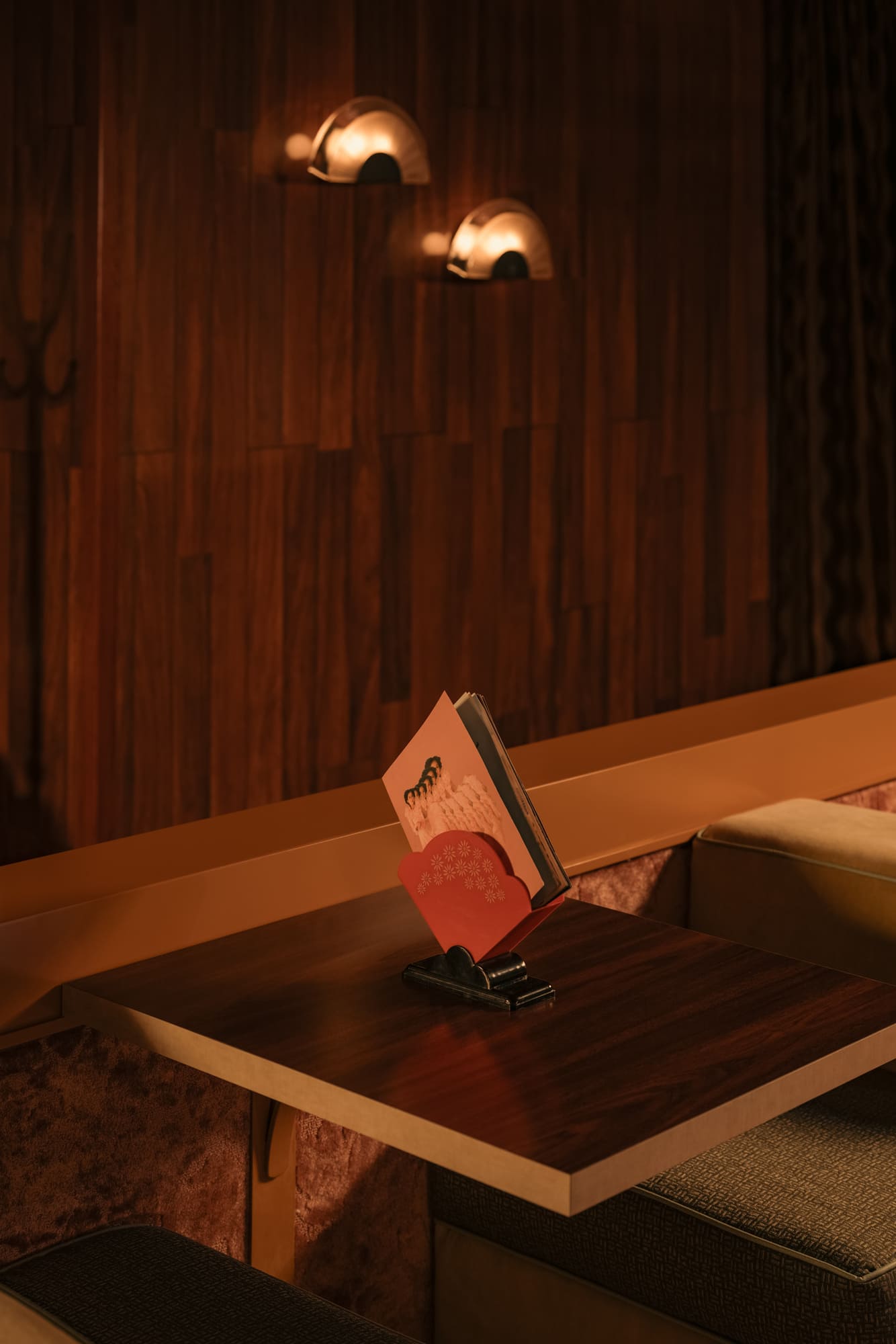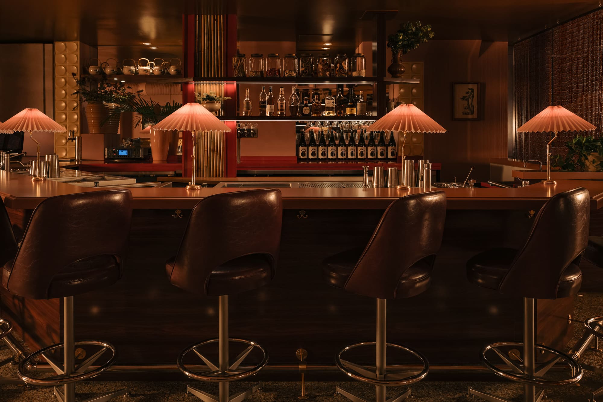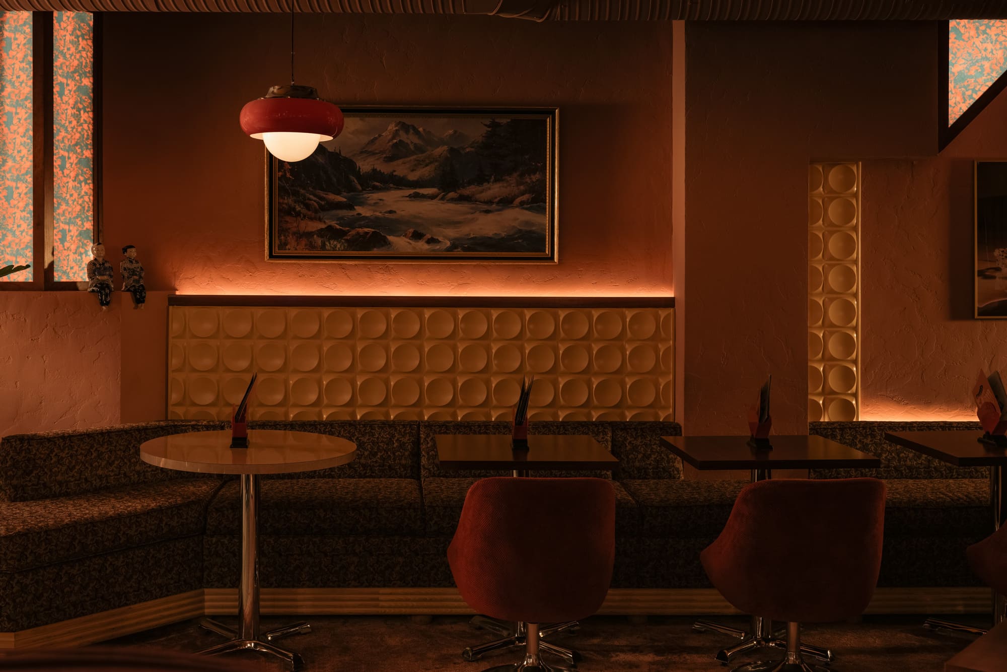 The dimly lit room is aesthetically inspired both by an image by Vancouver photographer Greg Girard series of Hong Kong nightlife in the 70s and 80s; and by the clandestine “love motels” of a bygone era. Enveloped in plush pink drapery and lush carpeting with vintage floral patterns, the space pops with bold red accents courtesy of 1970s Guzzini pendant lights against walls dressed in dark wood paneling with a glowing old school jukebox, like that in one of Girard’s photos of a restaurant/bar, adding a sense of nostalgia and novelty to the richly textured atmosphere.
