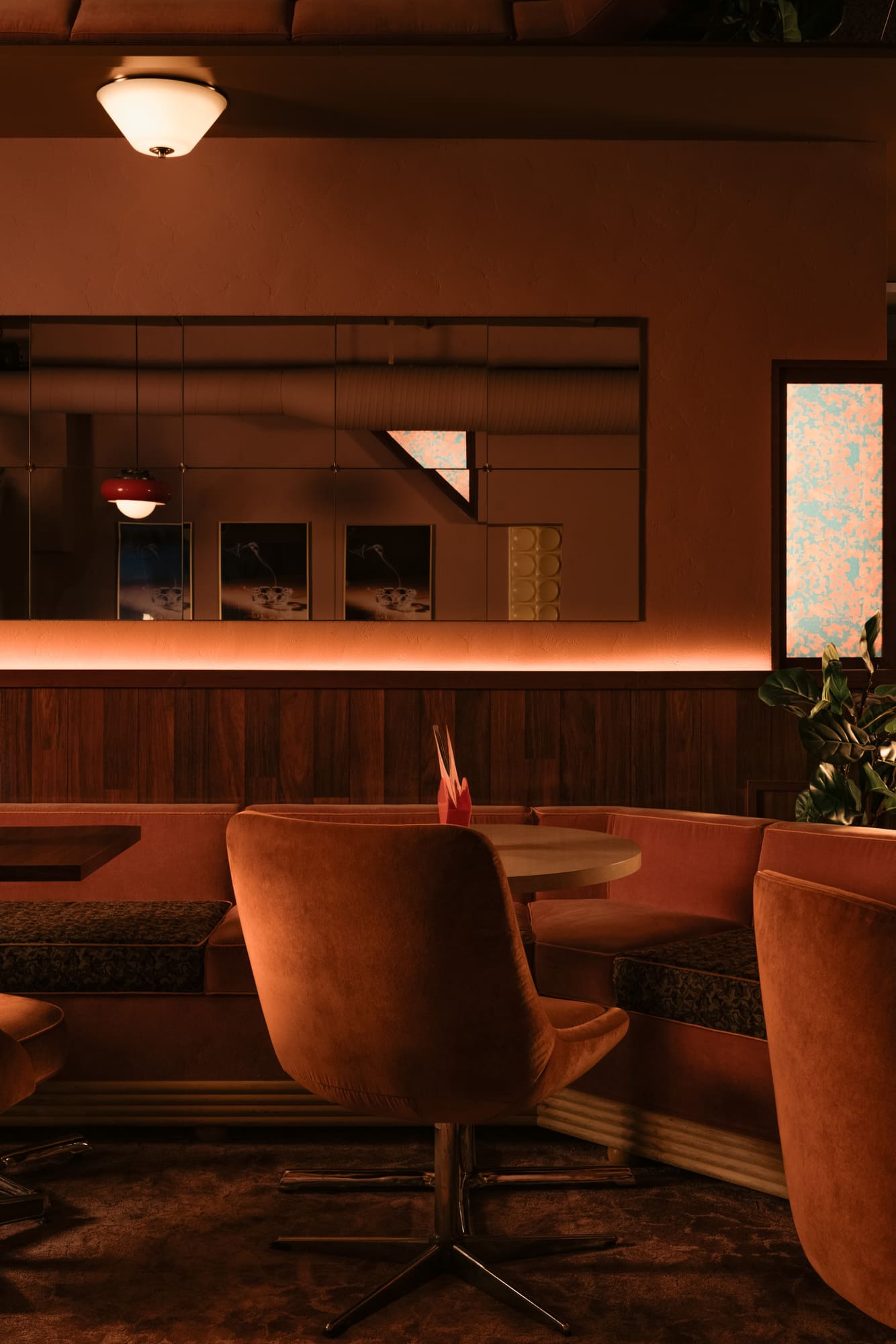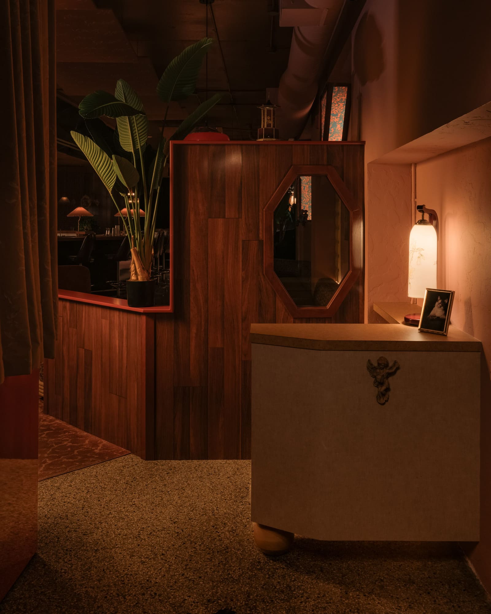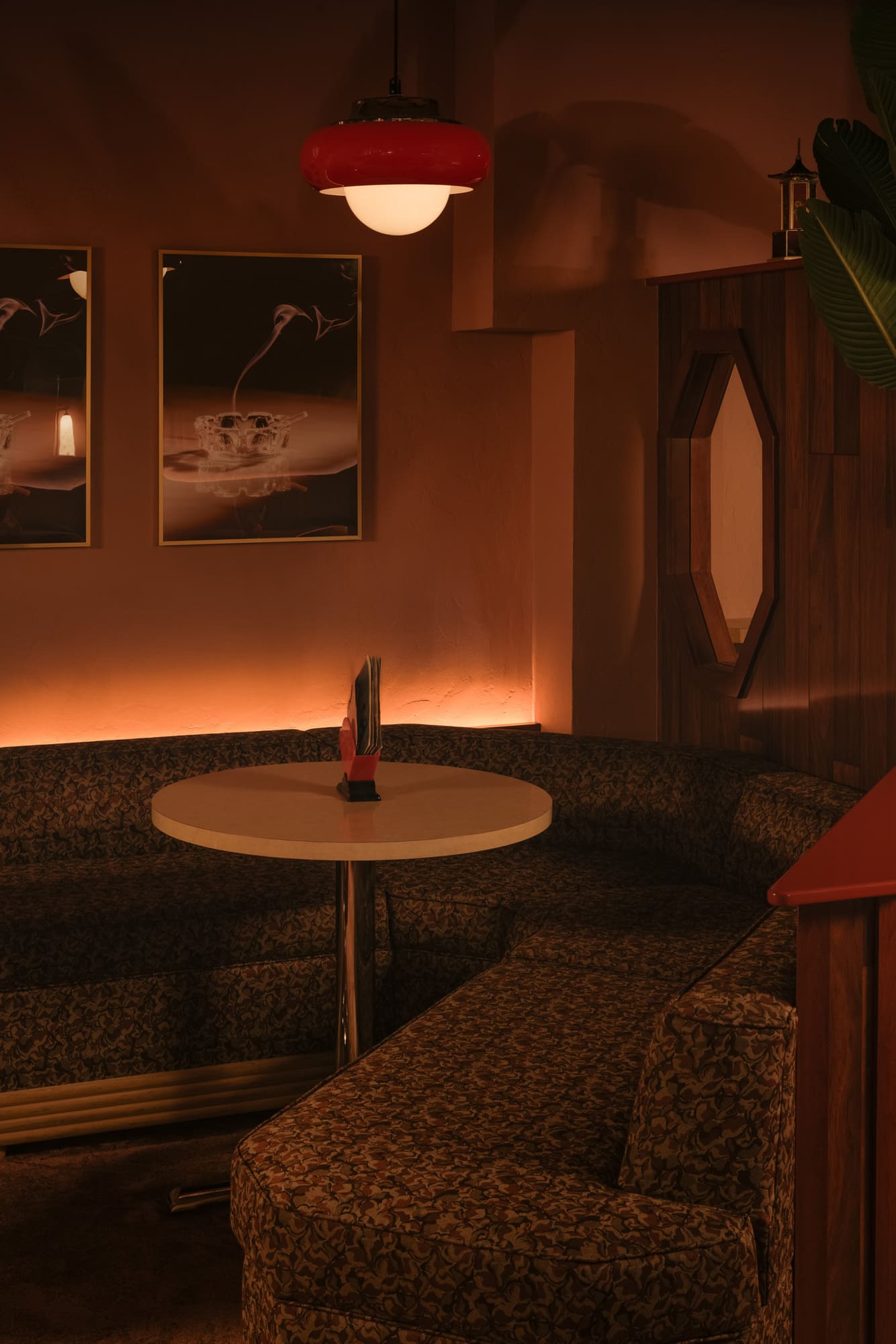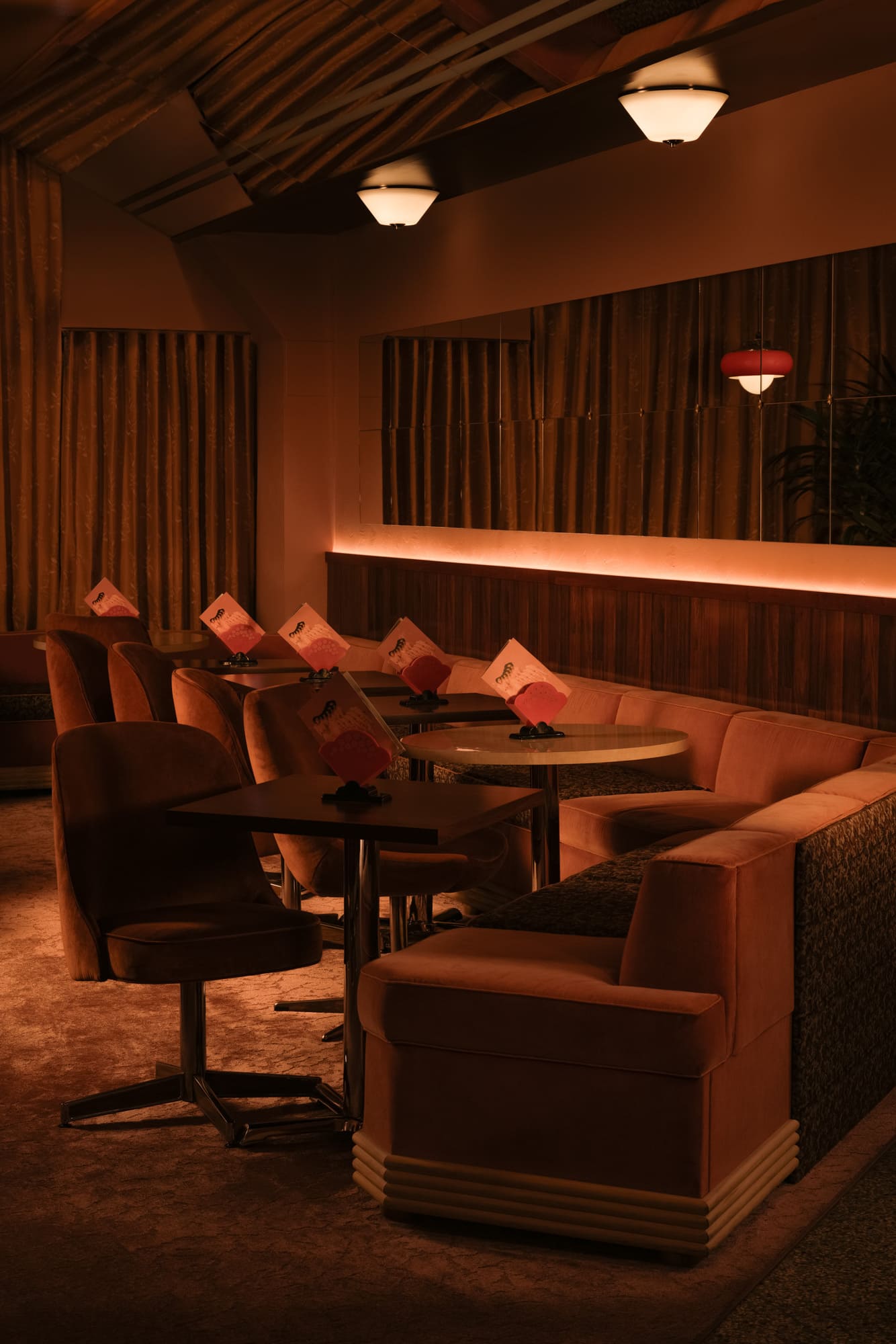 The dimly lit room is aesthetically inspired both by an image by Vancouver photographer Greg Girard series of Hong Kong nightlife in the 70s and 80s; and by the clandestine “love motels” of a bygone era. Enveloped in plush pink drapery and lush carpeting with vintage floral patterns, the space pops with bold red accents courtesy of 1970s Guzzini pendant lights against walls dressed in dark wood paneling with a glowing old school jukebox, like that in one of Girard’s photos of a restaurant/bar, adding a sense of nostalgia and novelty to the richly textured atmosphere.