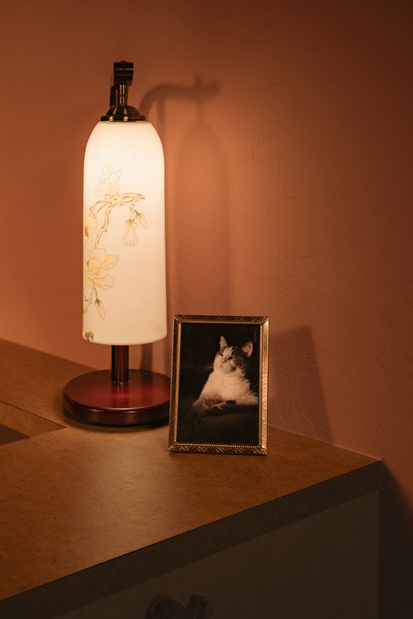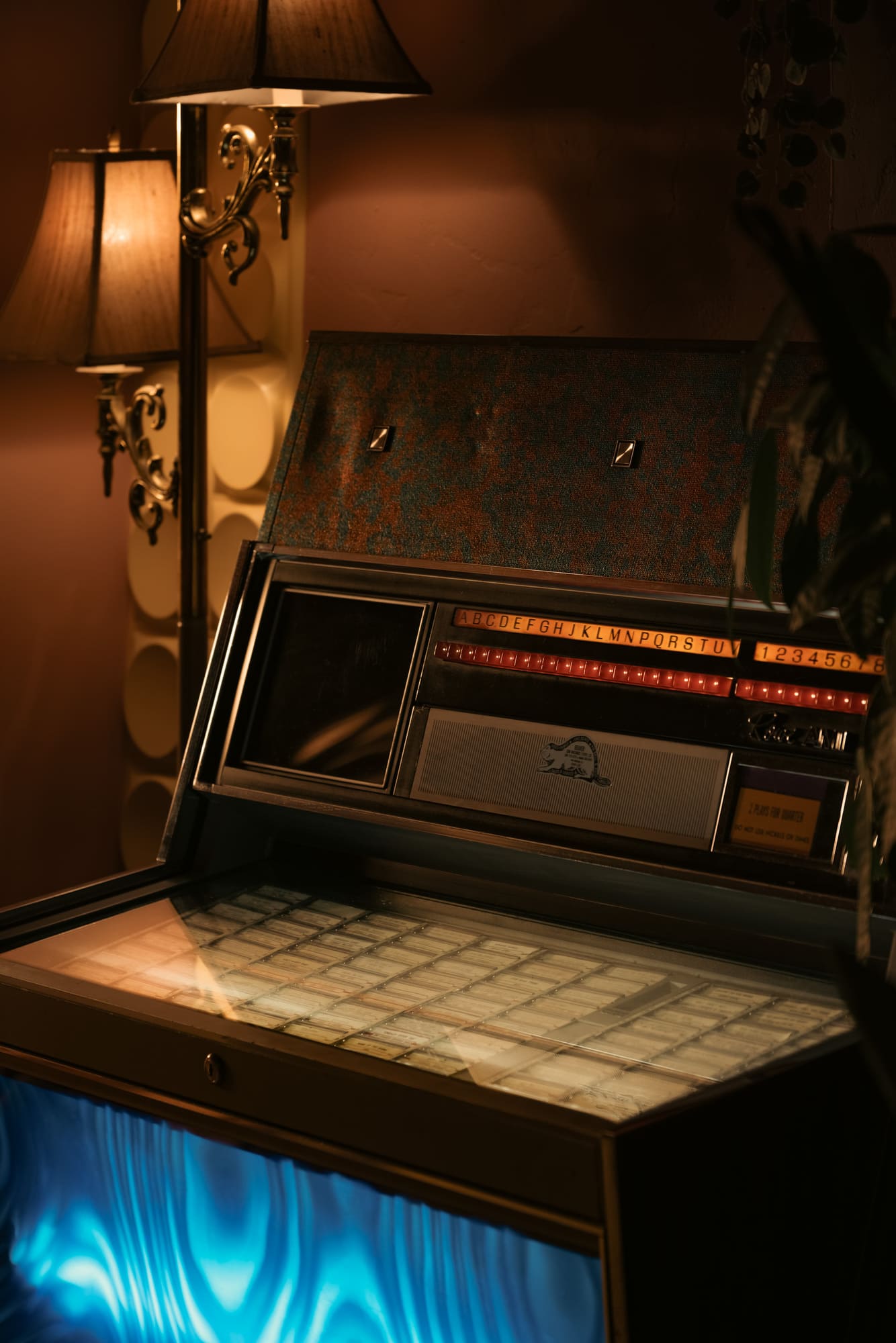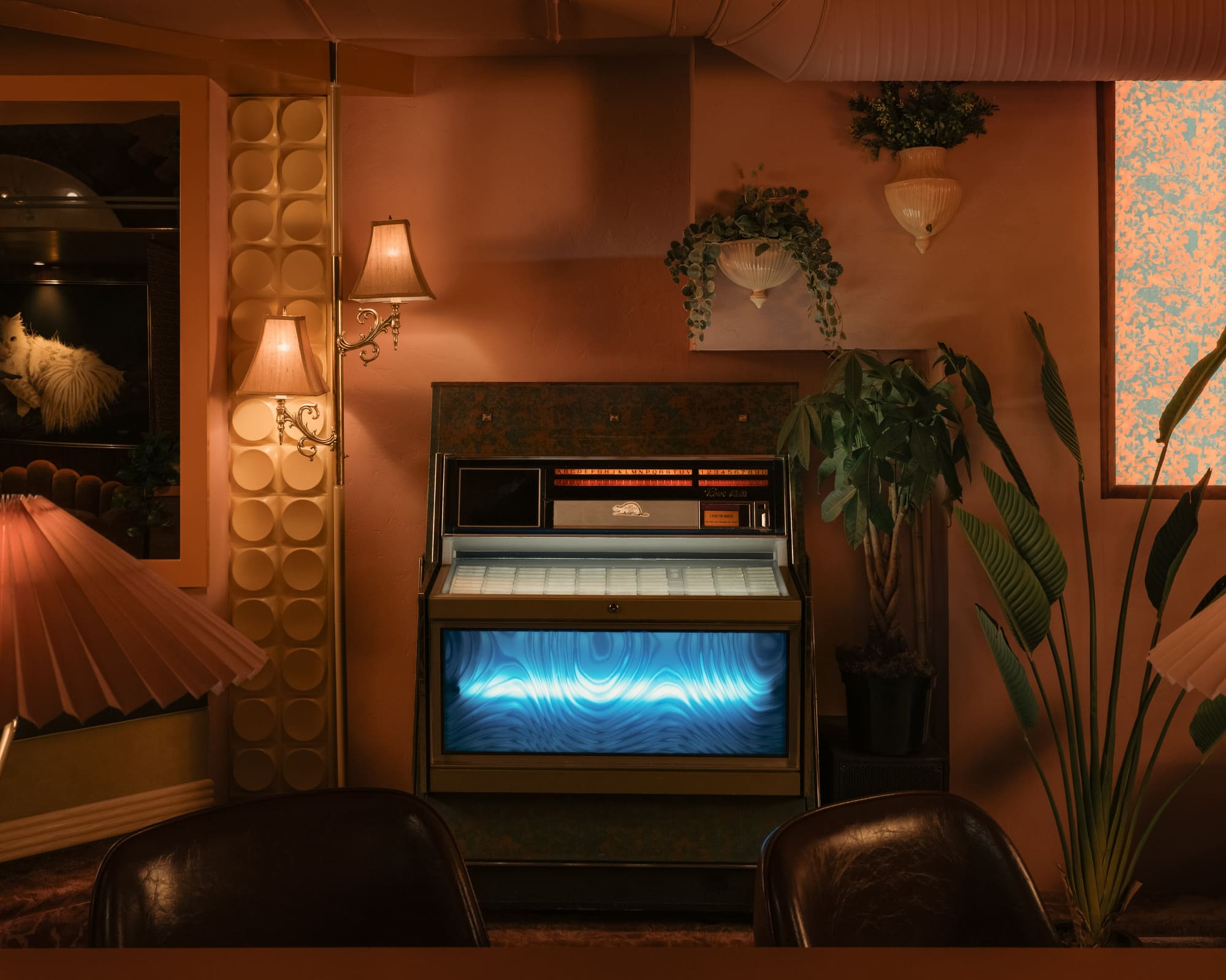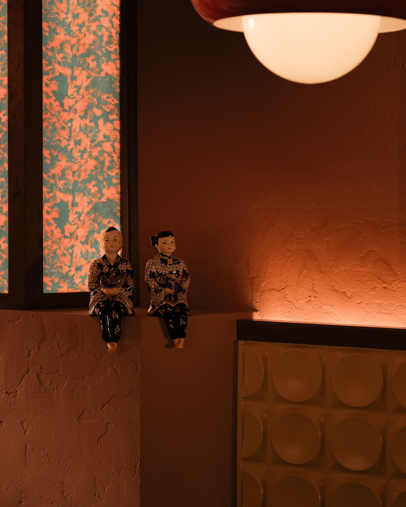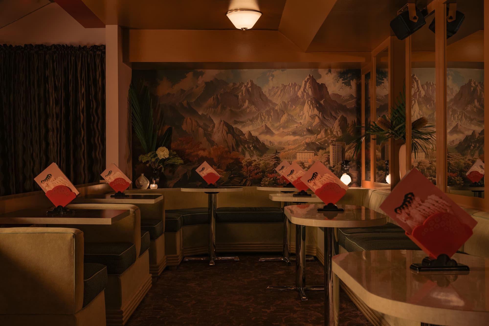The dimly lit room is aesthetically inspired both by an image by Vancouver photographer Greg Girard series of Hong Kong nightlife in the 70s and 80s; and by the clandestine “love motels” of a bygone era. Enveloped in plush pink drapery and lush carpeting with vintage floral patterns, the space pops with bold red accents courtesy of 1970s Guzzini pendant lights against walls dressed in dark wood paneling with a glowing old school jukebox, like that in one of Girard’s photos of a restaurant/bar, adding a sense of nostalgia and novelty to the richly textured atmosphere.