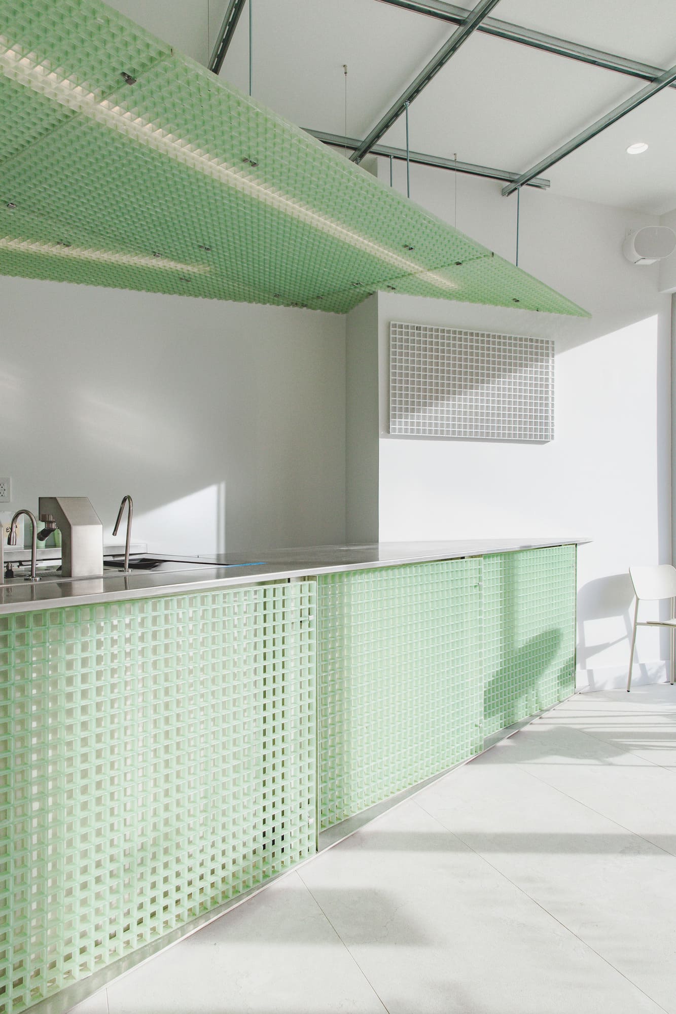 Stainless steel countertops and shelving complement the green FRP and support the industrial palette. Their reflective surfaces amplify natural and artificial light, allowing the green tint of the panels to shift in tone throughout the day. These material choices also emphasize durability and clarity, qualities that align with the project’s intent to feel both utilitarian and unique.