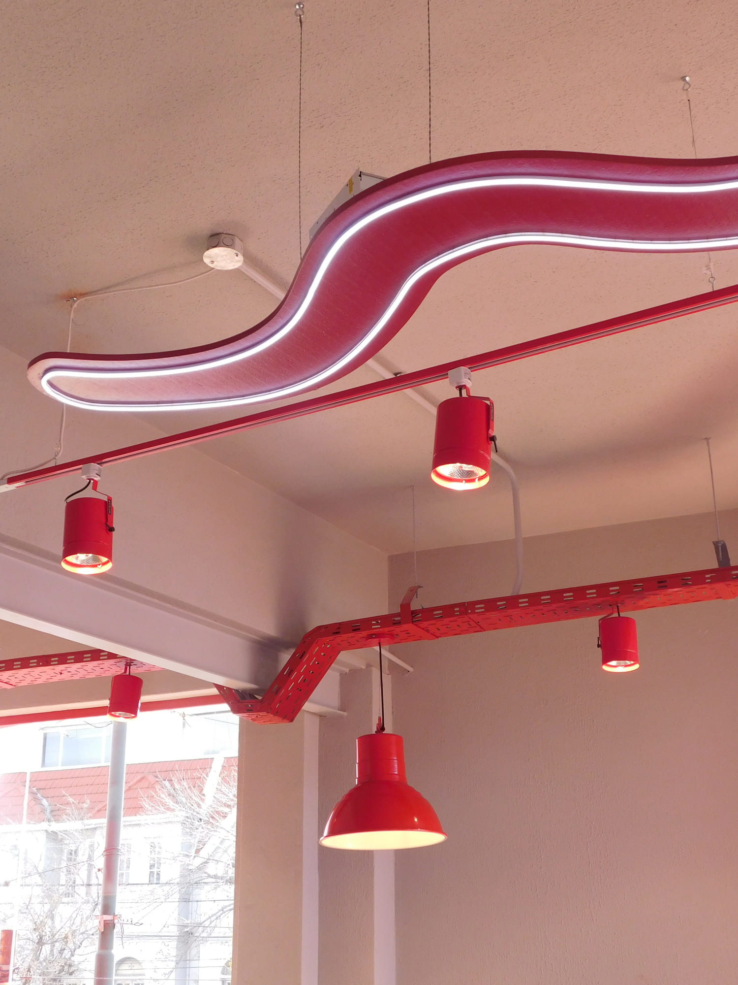 Lighting takes center stage—soft diffused panels and golden neon highlights create an ambiance that’s both urban and sophisticated, evoking the rhythm and vibrancy of the streets outside. Every element, from the furniture to the signage and graphic details, reflects a strong, modern, and cohesive identity designed to deliver a memorable visual and sensory experience.