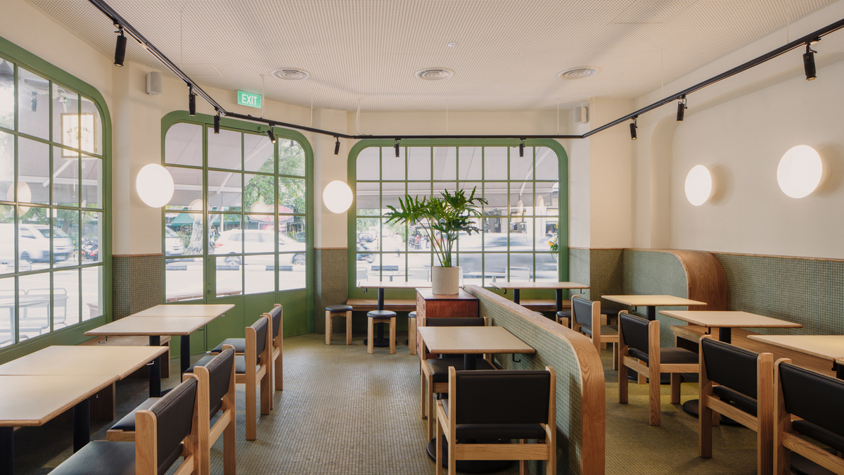 Launched by the owners of a string of popular cafes, including Atlas Coffeehouse in Singapore, the 70-seater eatery is situated at the end of a row of shophouses, giving it a distinct presence. I made the most of this by cutting out large windows that are articulated with mullions and softened with chamfered edges, and bring in much natural light. Benches line the inside walls, while outside, ample al fresco seating builds a strong connection with the streetscape.