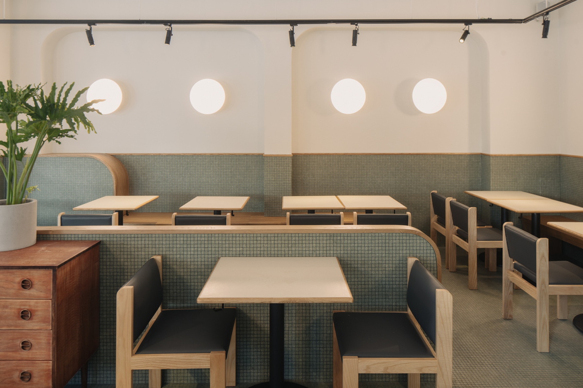 To the back, the coffee counter is clearly defined as a box. Tubular elements in burnt orange make the space a focal point, and exposed timber framework alludes to the woodwork in classical Japanese architecture. The graphic language of these orange elements is echoed in the black ceiling lights, and three-dimensional circular sconces add this play of geometry. The dining chairs are custom-designed, borrowing the classic lines from vintage chairs and the natural timber bodies keeping with the theme.
