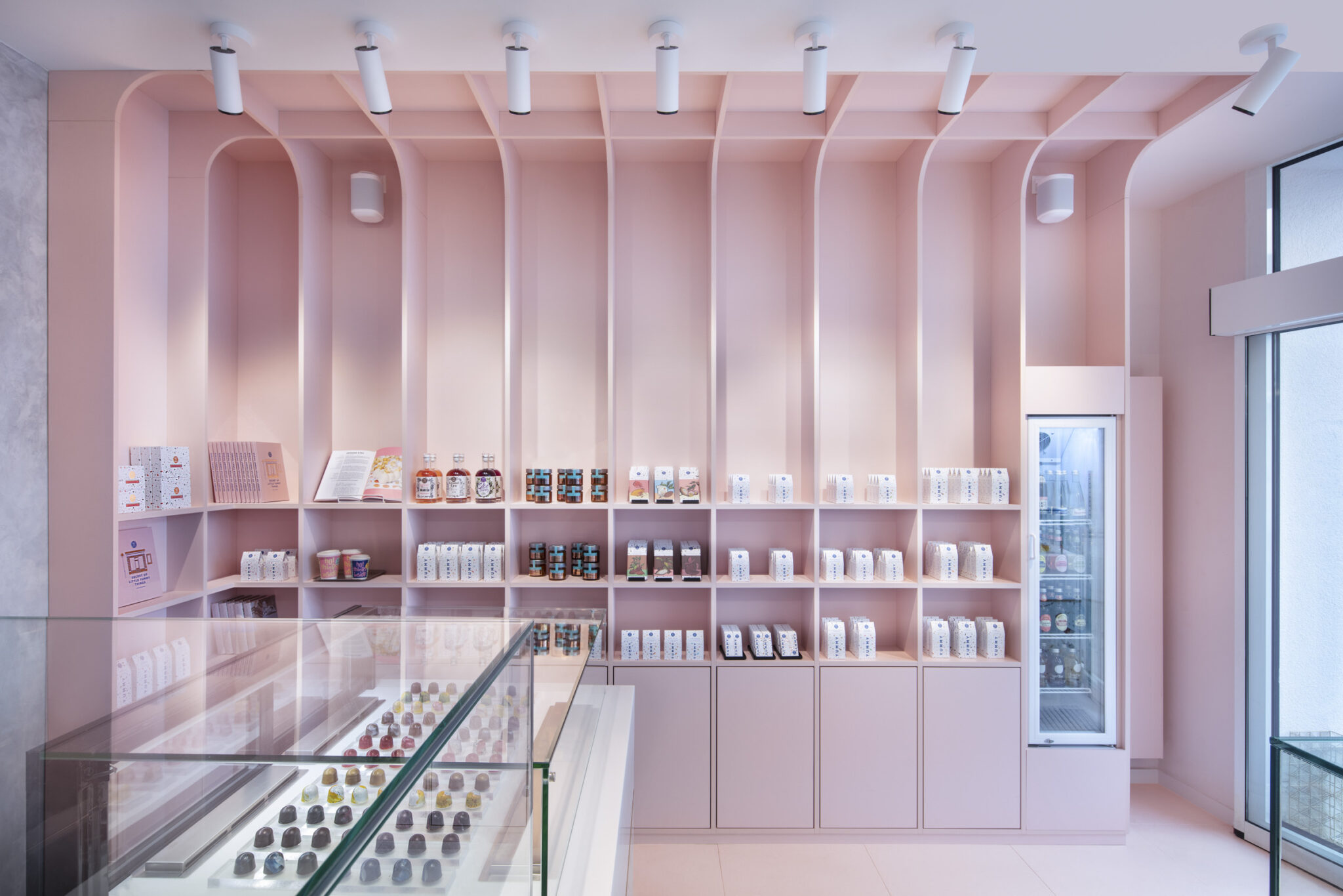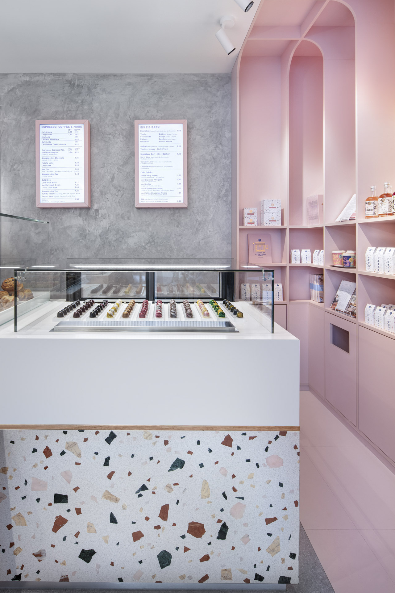 In order to translate the sweet delicacies of Pâtisserie Ludwig into an interior design concept, we immersed one half of the new sales area in sticky sweet pink and the other half in raw concrete, whose broken surface is reminiscent of the crystalline structure of the chilled tartlets and fresh ice cream. The rosé-coloured shelves extend from floor to ceiling and end as round arches set into the ceiling. The monolithic counter has a neutral white work and presentation surface, which becomes a passe-partout for the colourful chocolates and tartlets. The front of the counter, colourful, handmade terrazzo, forms the counterpart to the “Little Yummy Things”.