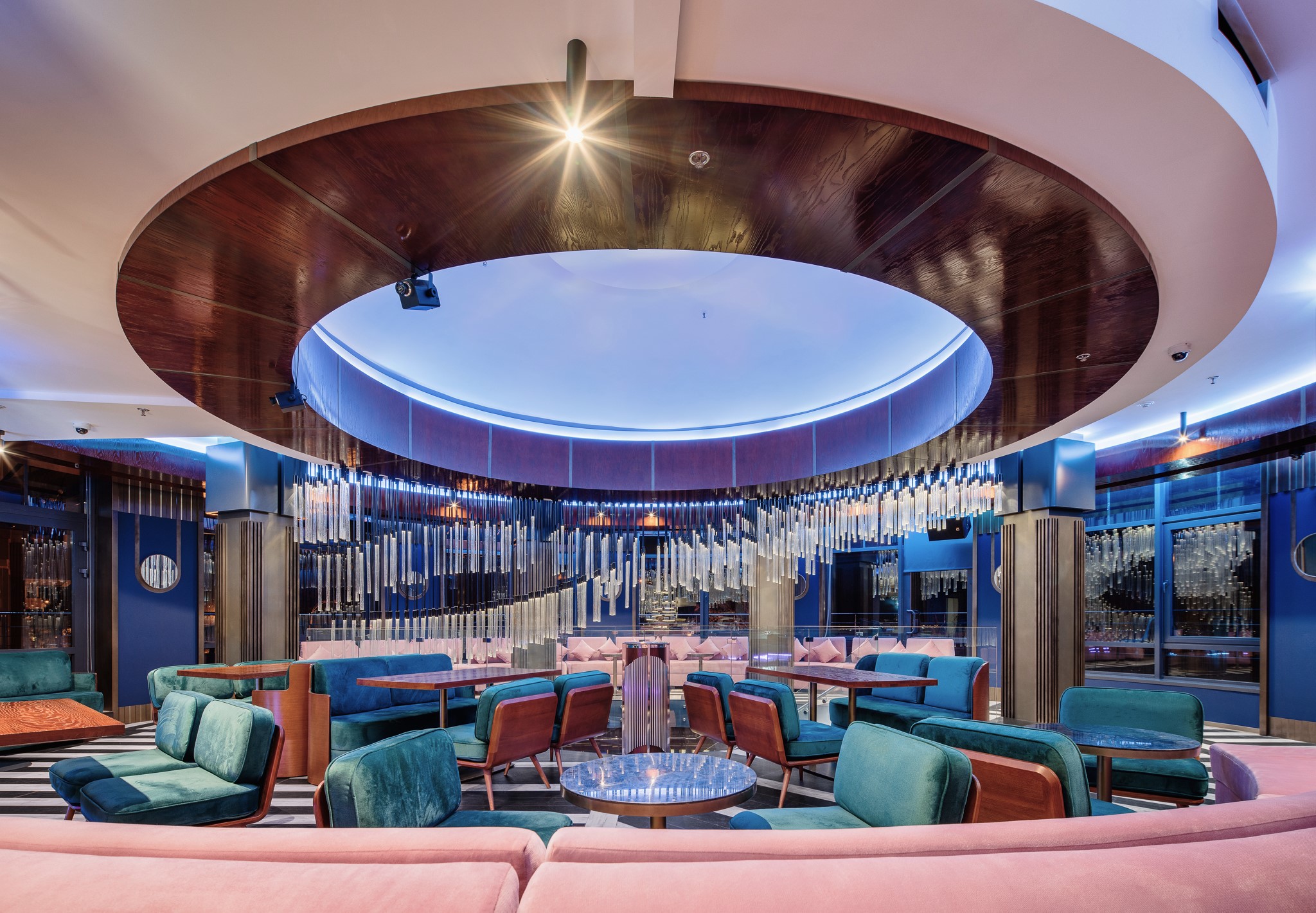 Emerald color and ultramarine, noble shine of brass, elegance of bent wooden surfaces and radial elements, stone surfaces, chic velour – the main elements against the background of the graphic pattern on the floor, designed after the works of English artist and naval officer Norman Wilkinson.