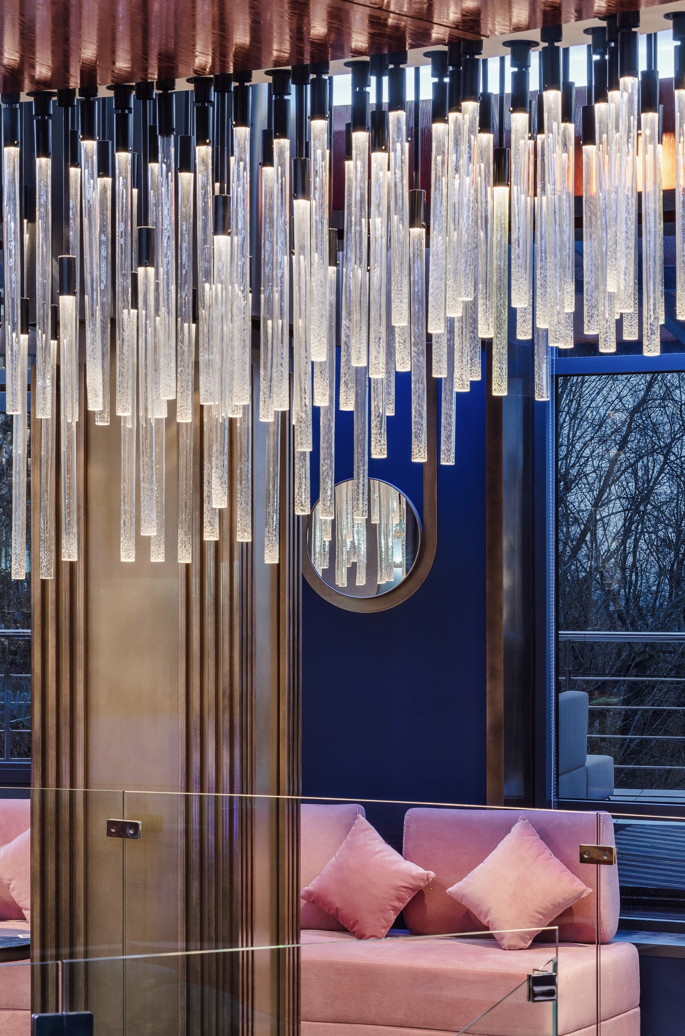 Many luminaires create the effect of four ocean waves: above the first and second-floor bars, the staircase, and the DJ platform area. Five types of glass elements of different lengths are handmade using various techniques. The total number of luminaires is 1,369 and their total length is 422 meters. Each of the 1,369 luminaires is individually illuminated.