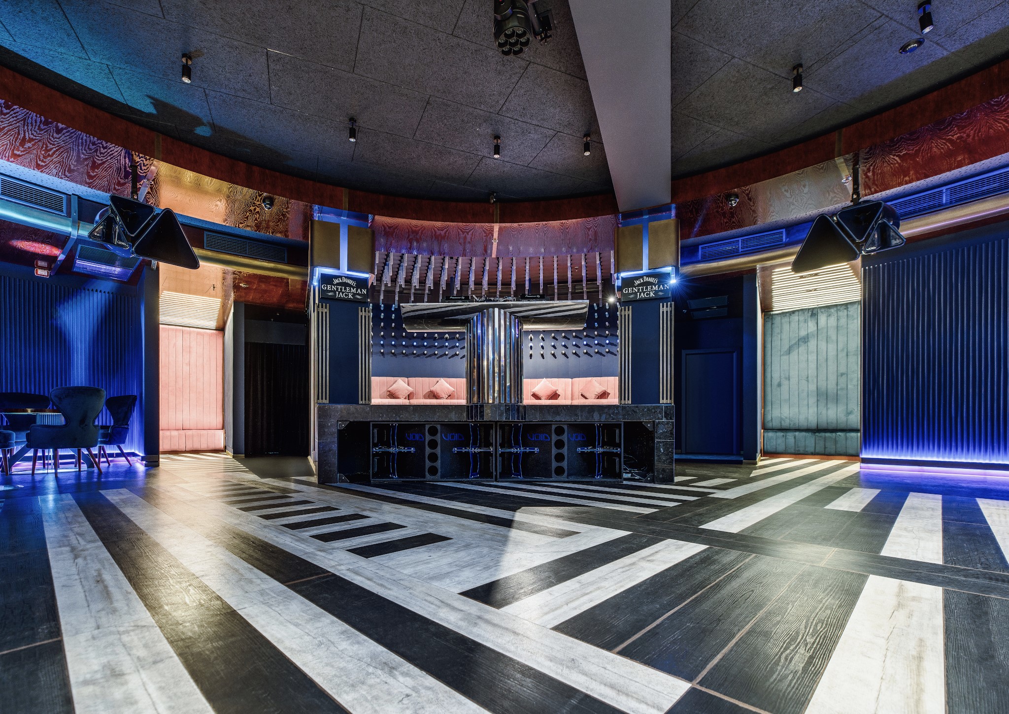 The first thing that greets guests is the long radius-shaped contact bar. It is made of brass, natural stone, and glossy wood. Then the geometric floor pattern leads to the epicenter of events – to the stage, the main musical platform of the venue. The dance floor area is conditionally limited by the floor pattern and columns with luminous capitals.