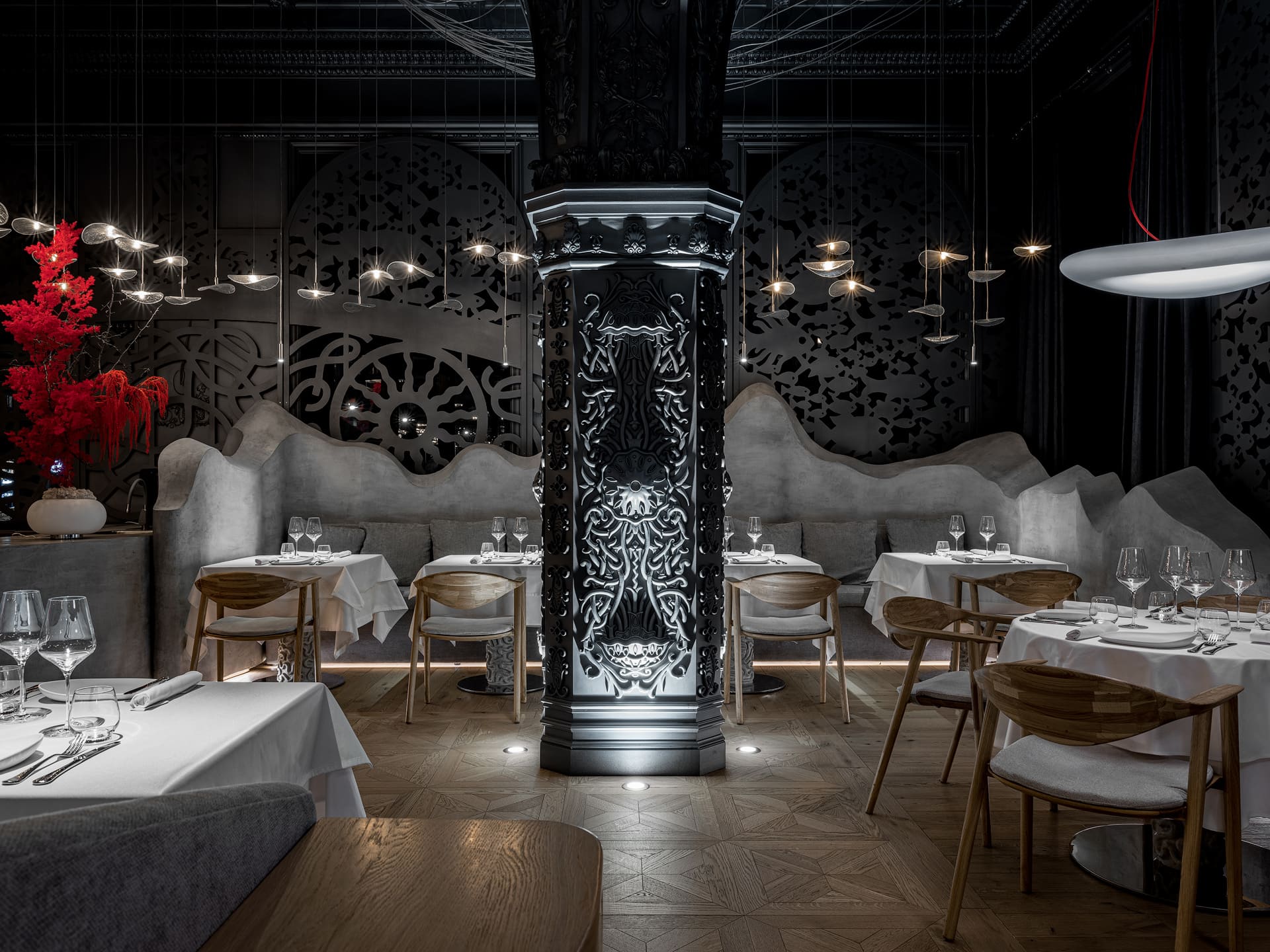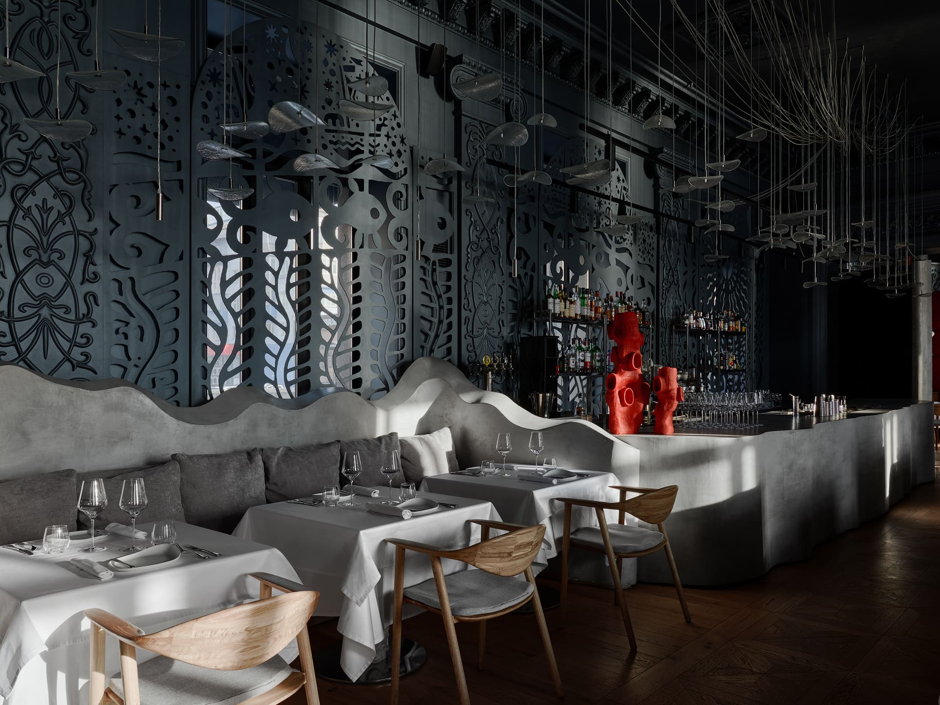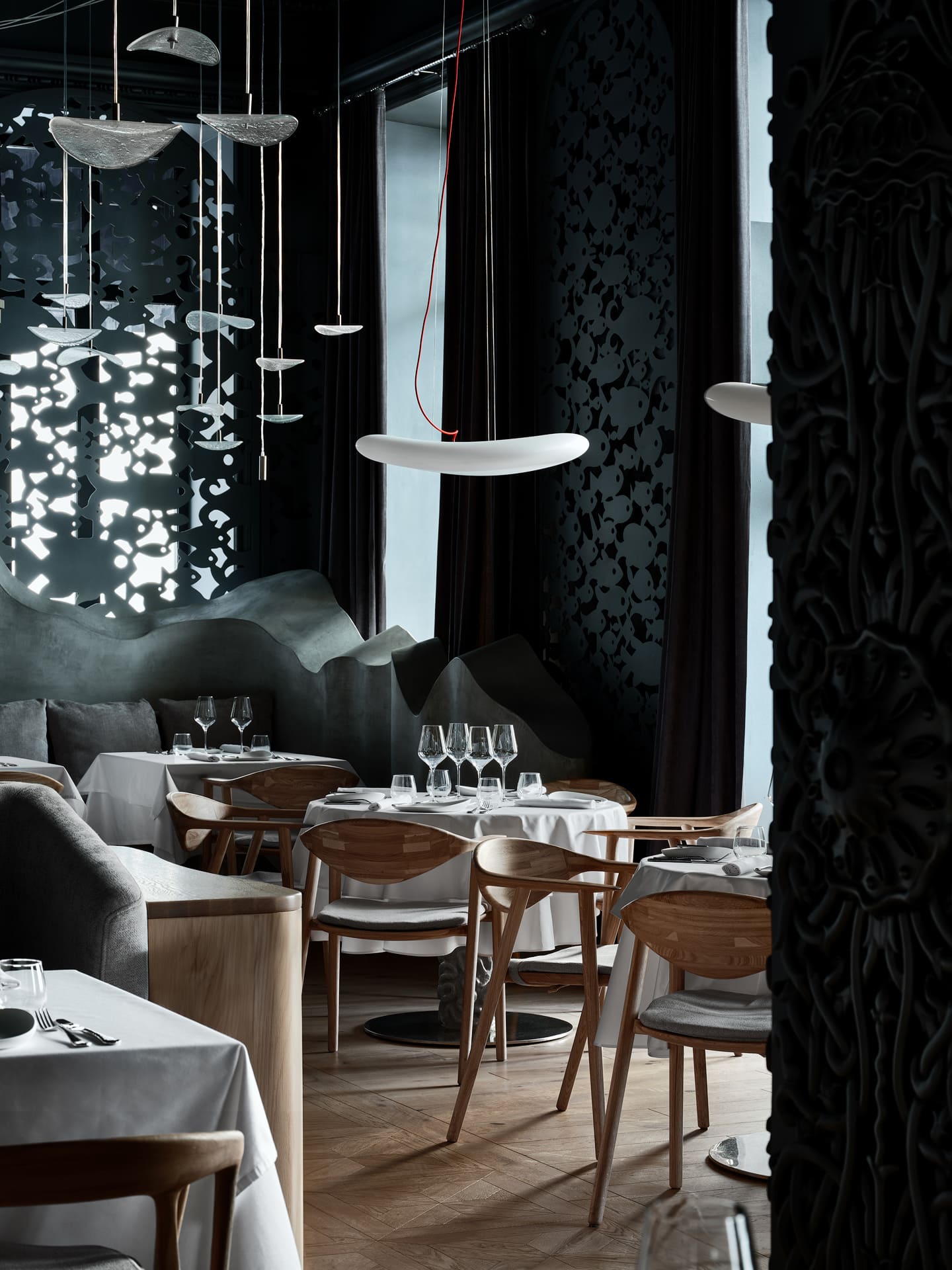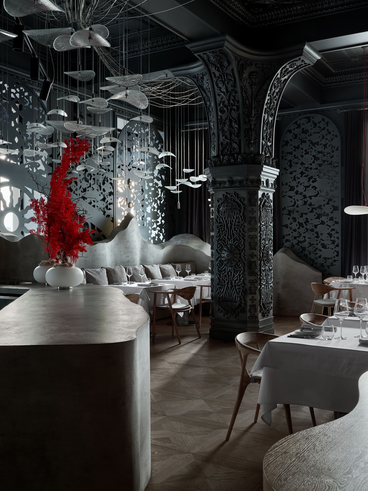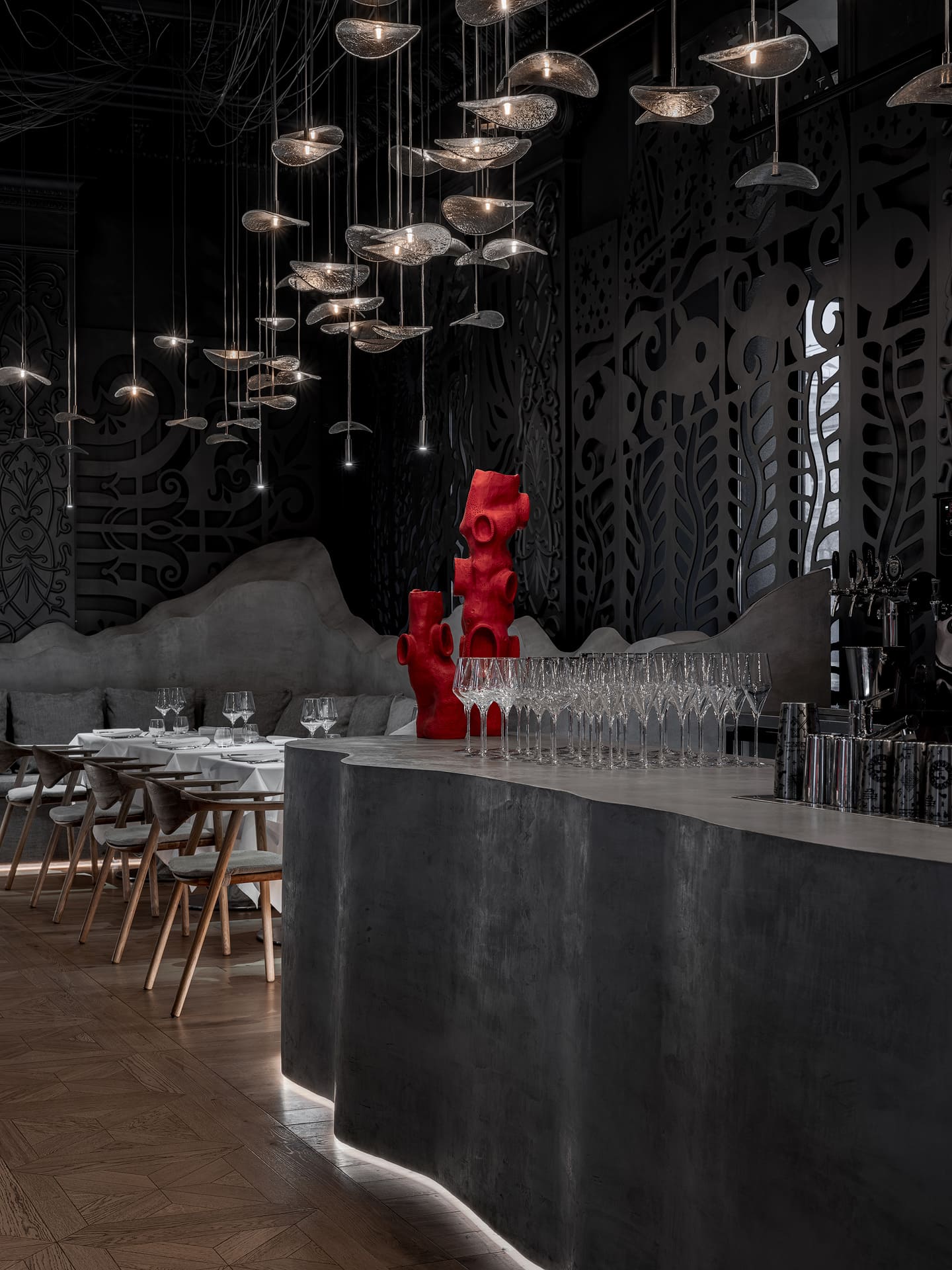 The main task given by the Berrywood Family restaurant group was to create the atmosphere immersing guests in the sea world. The restaurant’s interior is dark, almost monochrome, with lots of reflective metal surfaces. Bright accents — ceramic corals — refer to underwater landscapes. The concrete wave that stretches throughout the space is our tribute to modernist architecture. We decorated surfaces with tailor-made plaster moldings to create expressively fairytale atmosphere. Windows that do not overlook the river are covered with fabled motifs screens. The design of moldings and screens was exclusively created for the project by modern Siberian artist.