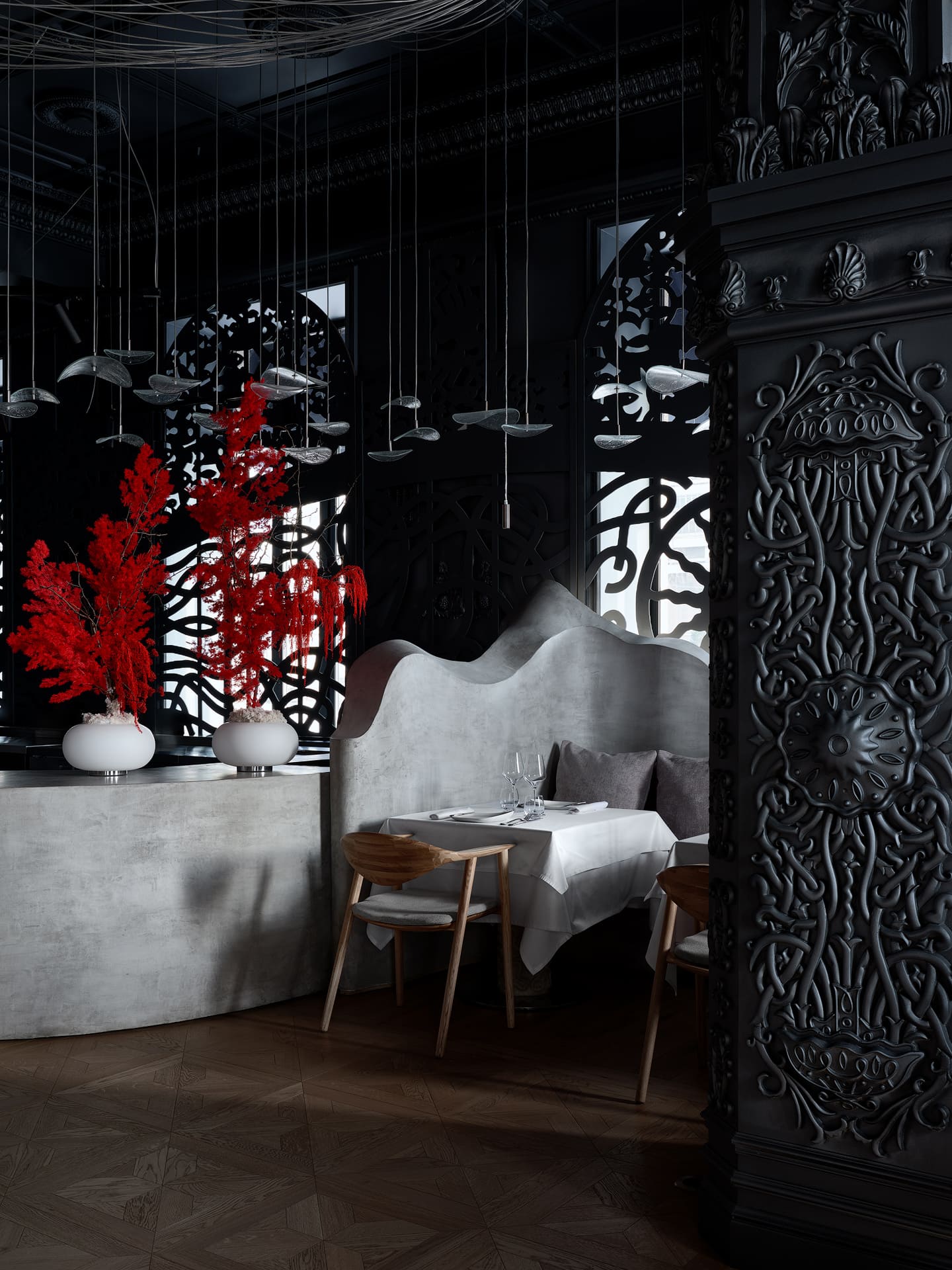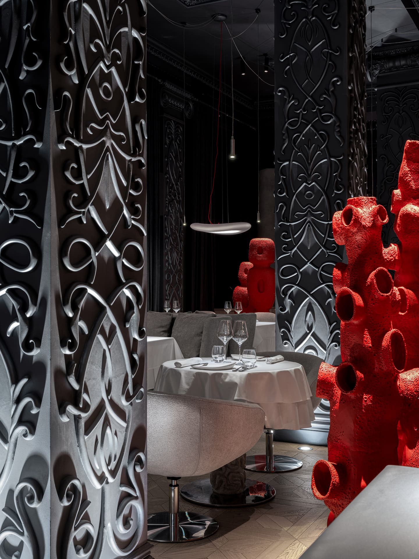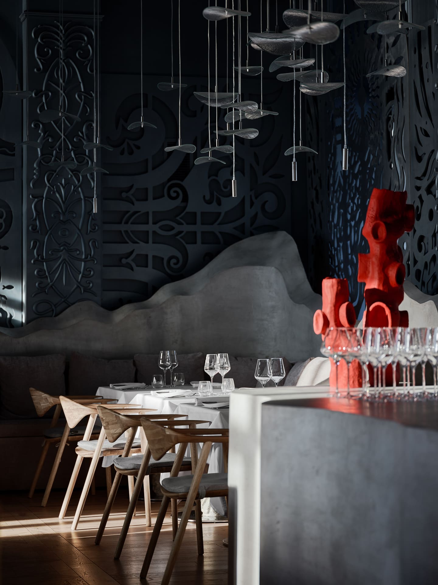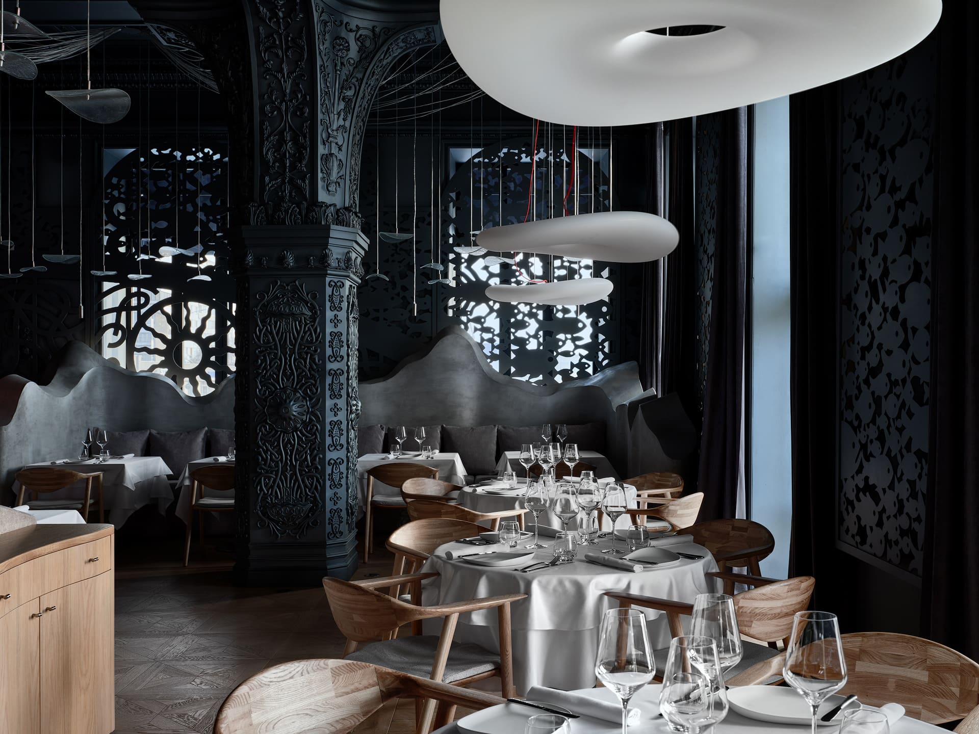 The main task given by the Berrywood Family restaurant group was to create the atmosphere immersing guests in the sea world. The restaurant’s interior is dark, almost monochrome, with lots of reflective metal surfaces. Bright accents — ceramic corals — refer to underwater landscapes. The concrete wave that stretches throughout the space is our tribute to modernist architecture. We decorated surfaces with tailor-made plaster moldings to create expressively fairytale atmosphere. Windows that do not overlook the river are covered with fabled motifs screens. The design of moldings and screens was exclusively created for the project by modern Siberian artist.