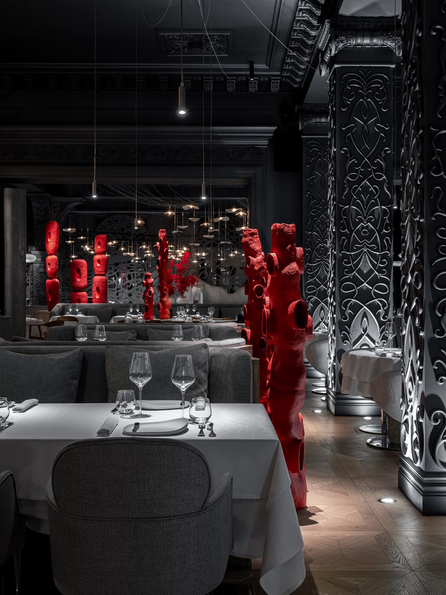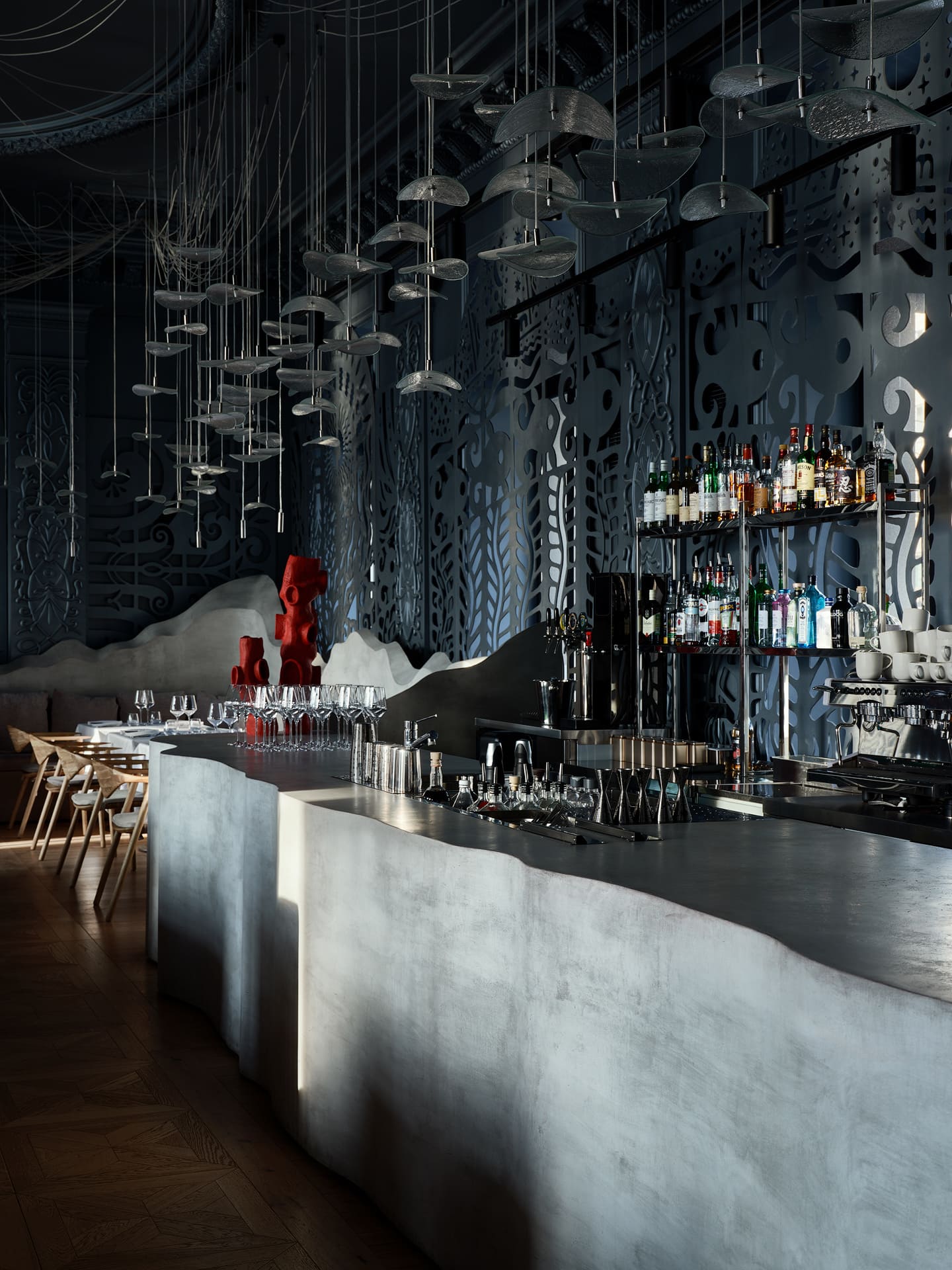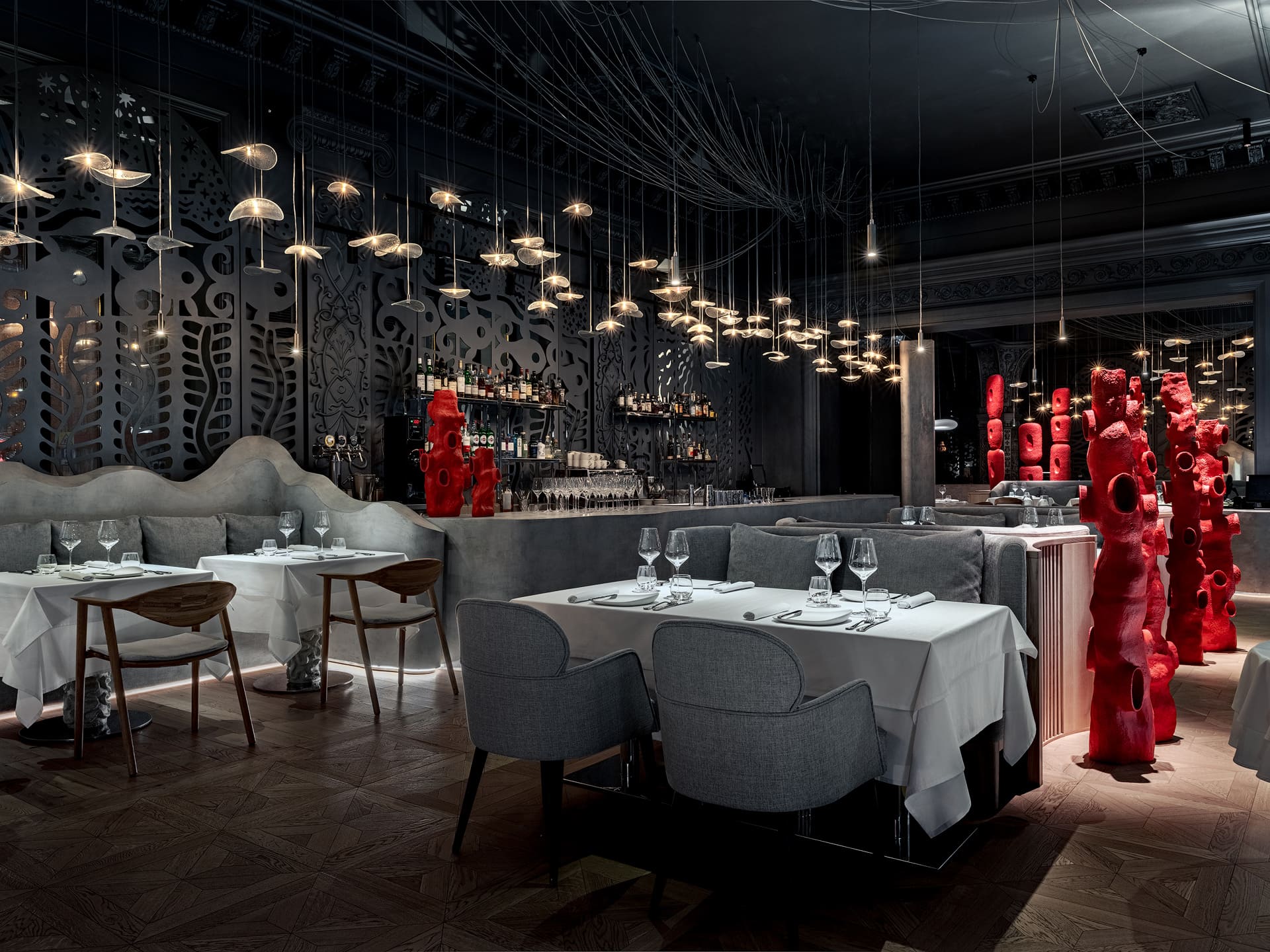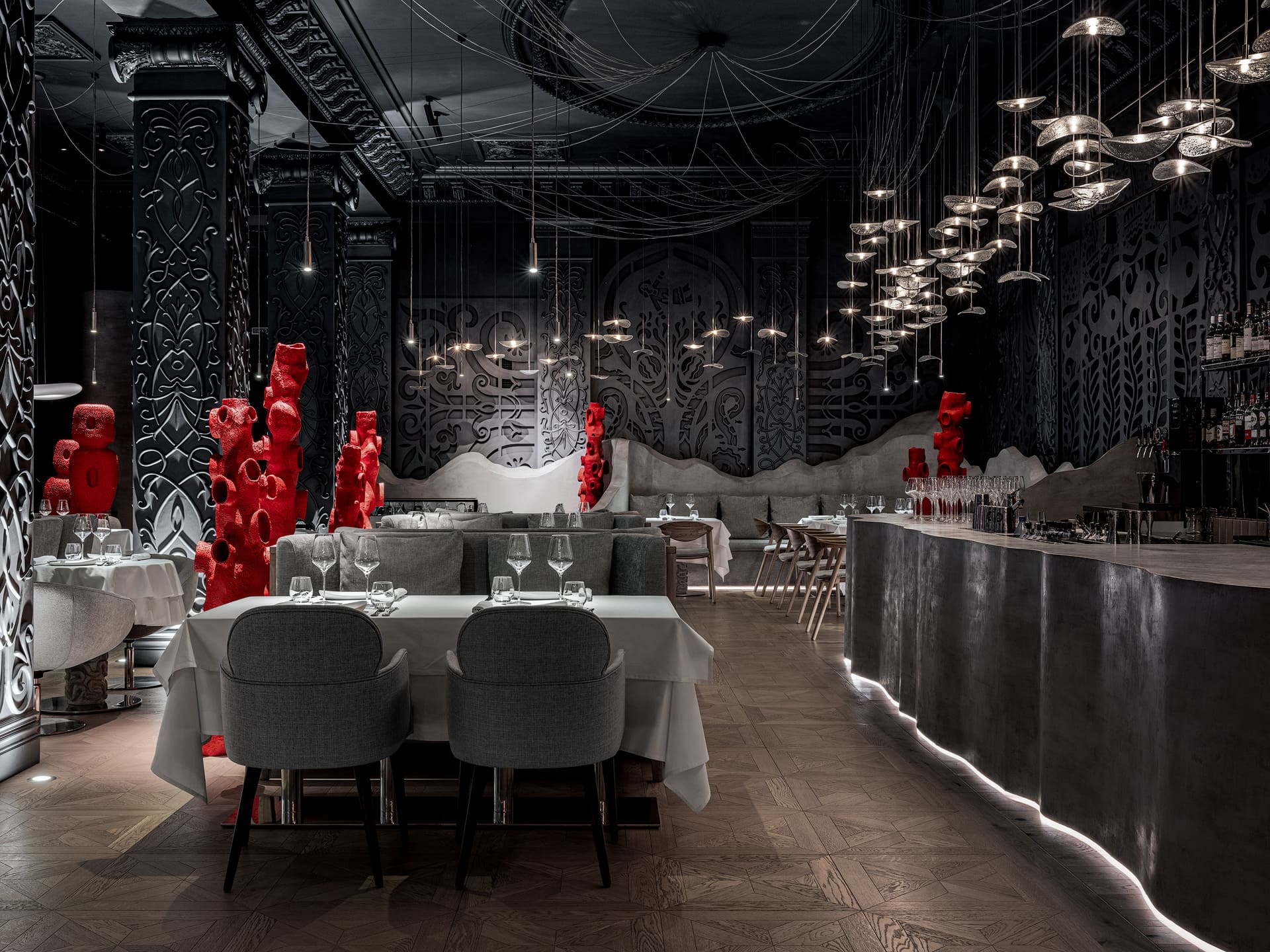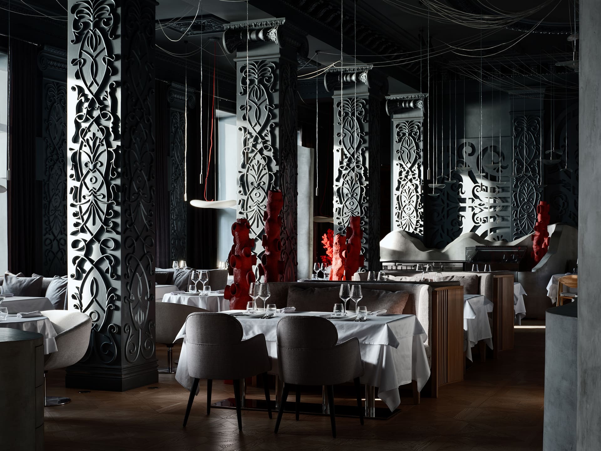 The main task given by the Berrywood Family restaurant group was to create the atmosphere immersing guests in the sea world. The restaurant’s interior is dark, almost monochrome, with lots of reflective metal surfaces. Bright accents — ceramic corals — refer to underwater landscapes. The concrete wave that stretches throughout the space is our tribute to modernist architecture. We decorated surfaces with tailor-made plaster moldings to create expressively fairytale atmosphere. Windows that do not overlook the river are covered with fabled motifs screens. The design of moldings and screens was exclusively created for the project by modern Siberian artist.