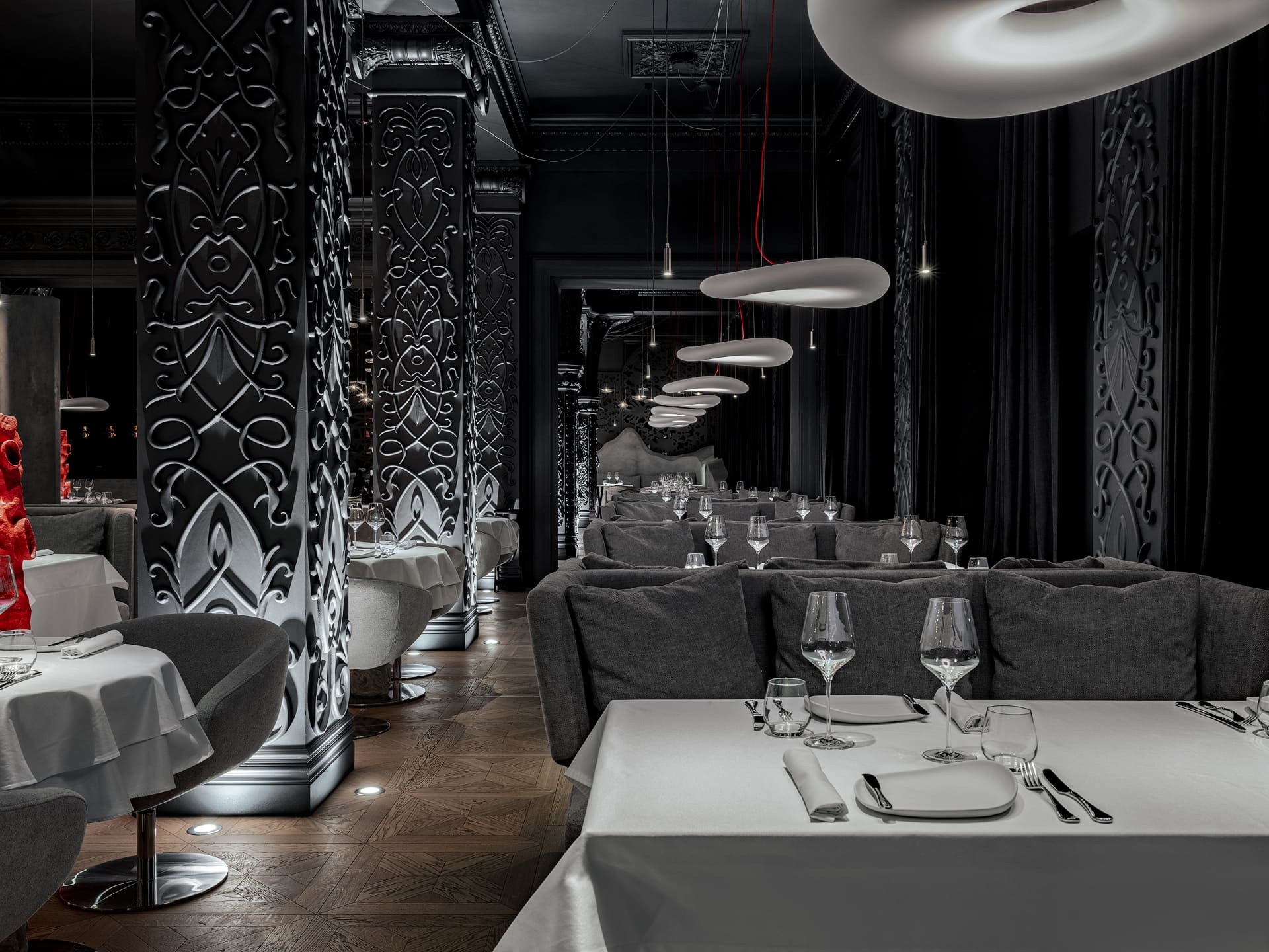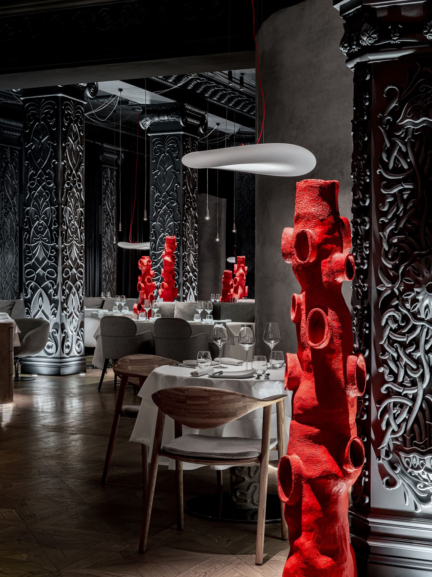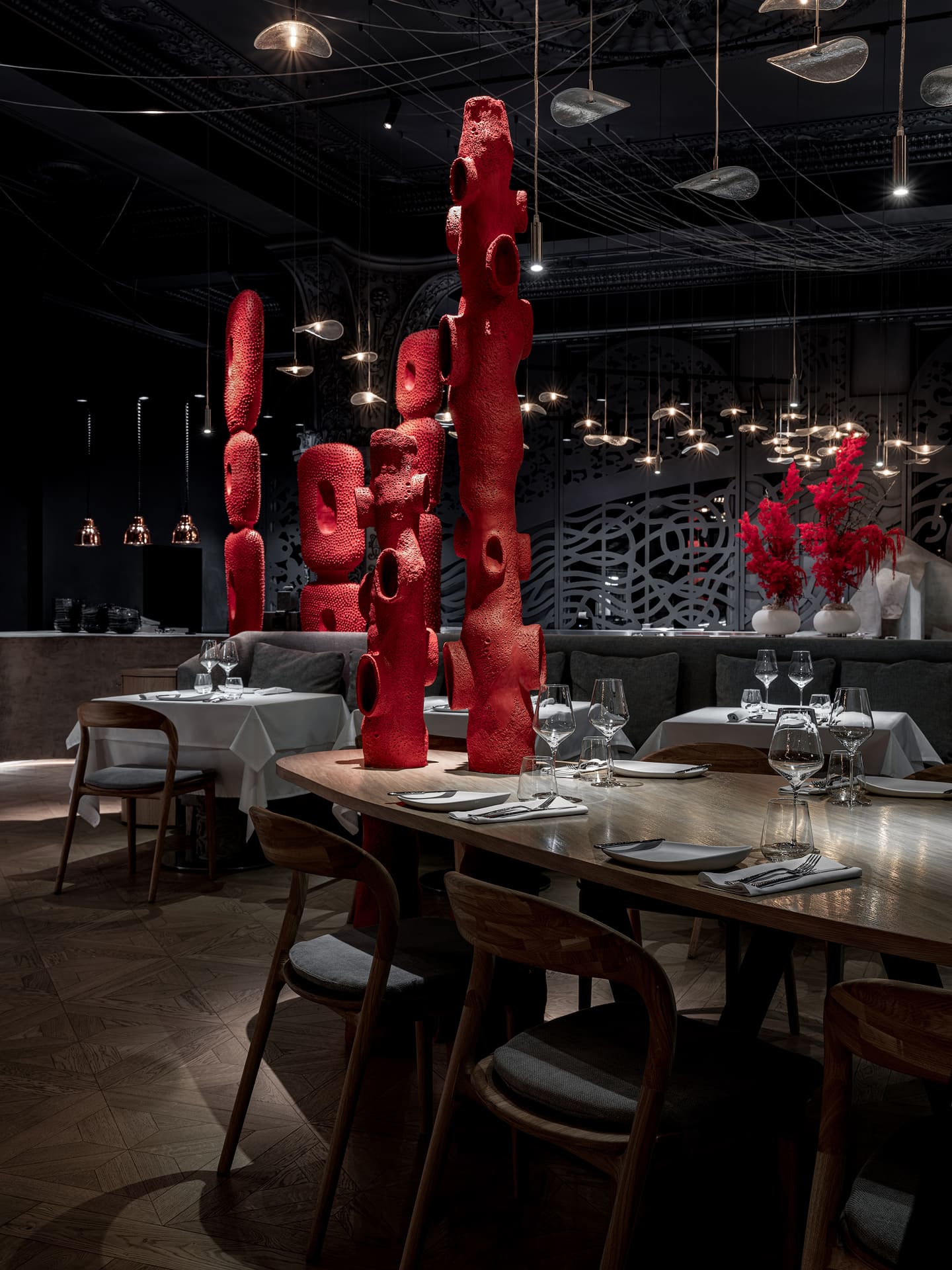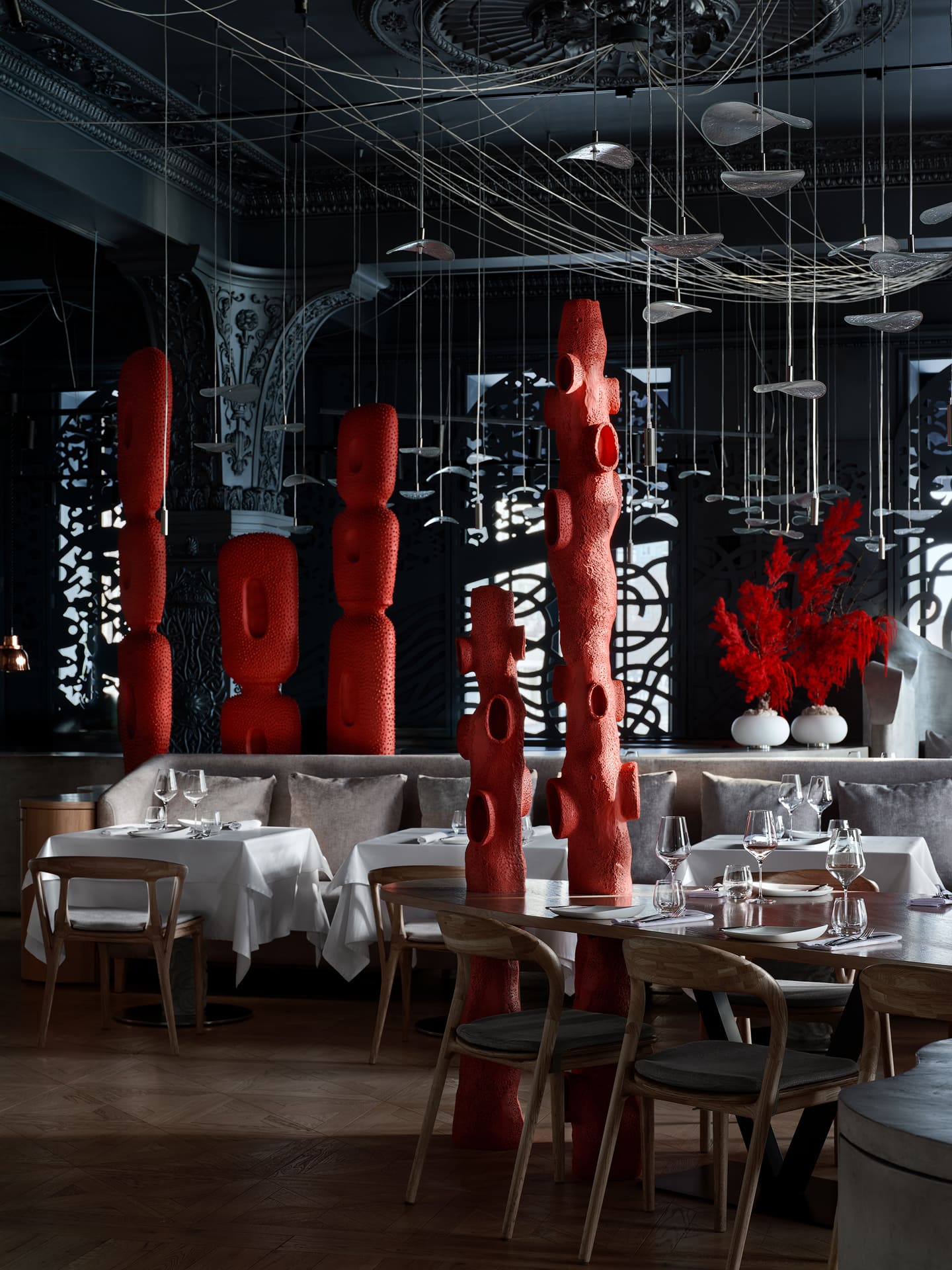 The main task given by the Berrywood Family restaurant group was to create the atmosphere immersing guests in the sea world. The restaurant’s interior is dark, almost monochrome, with lots of reflective metal surfaces. Bright accents — ceramic corals — refer to underwater landscapes. The concrete wave that stretches throughout the space is our tribute to modernist architecture. We decorated surfaces with tailor-made plaster moldings to create expressively fairytale atmosphere. Windows that do not overlook the river are covered with fabled motifs screens. The design of moldings and screens was exclusively created for the project by modern Siberian artist.