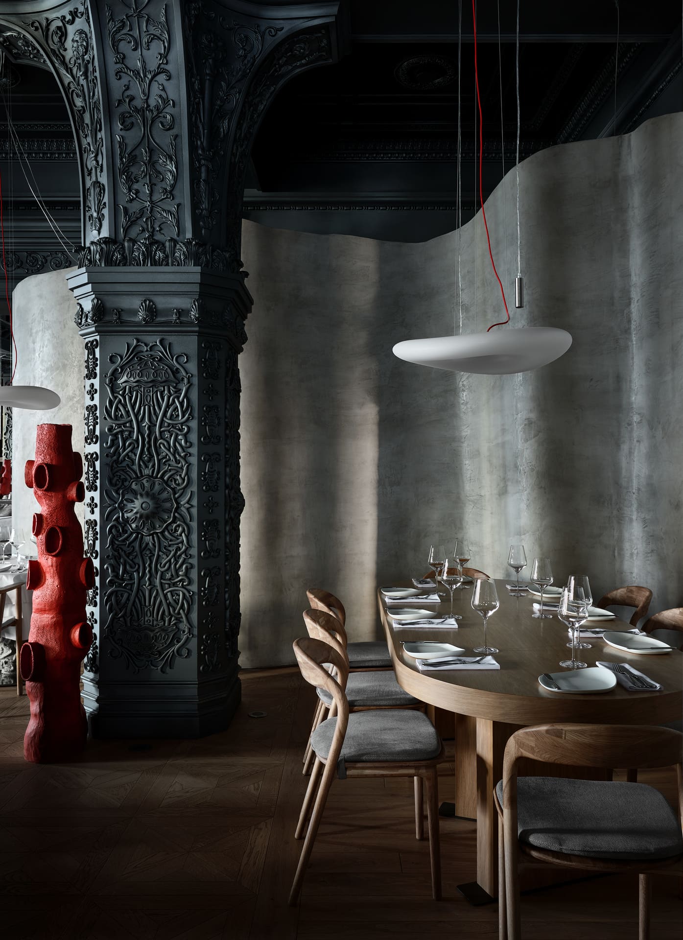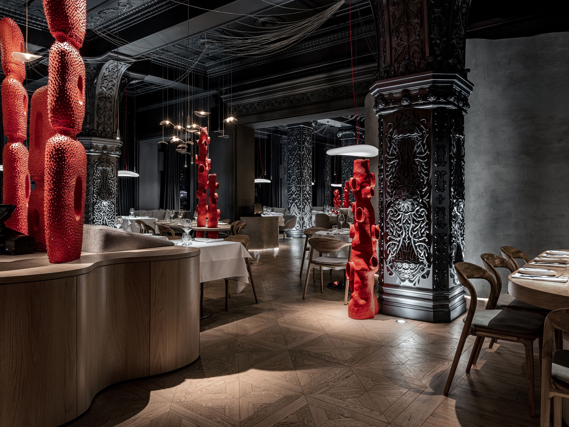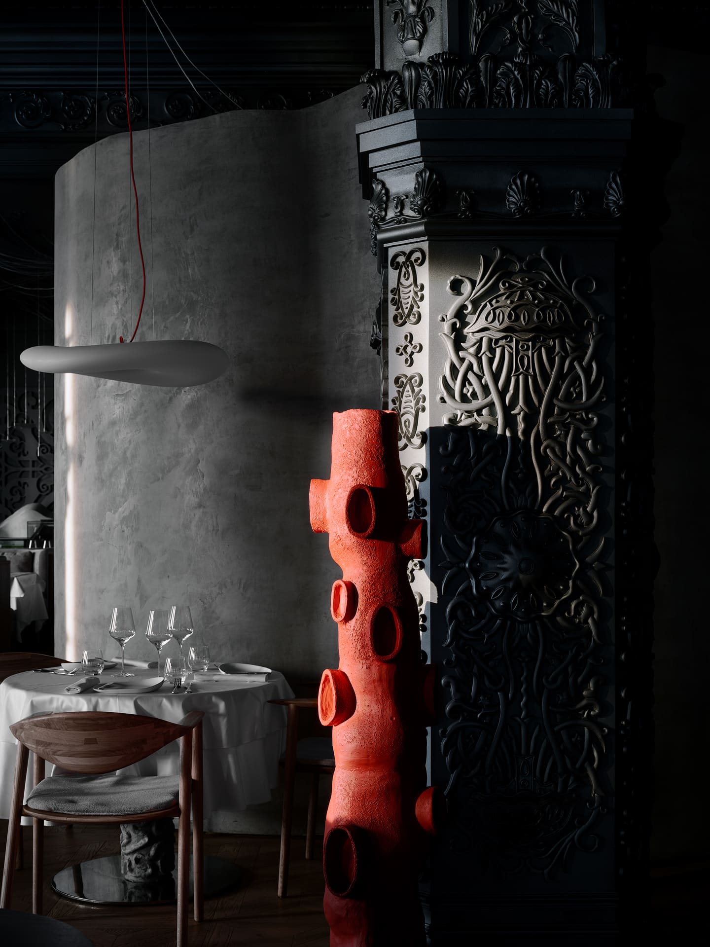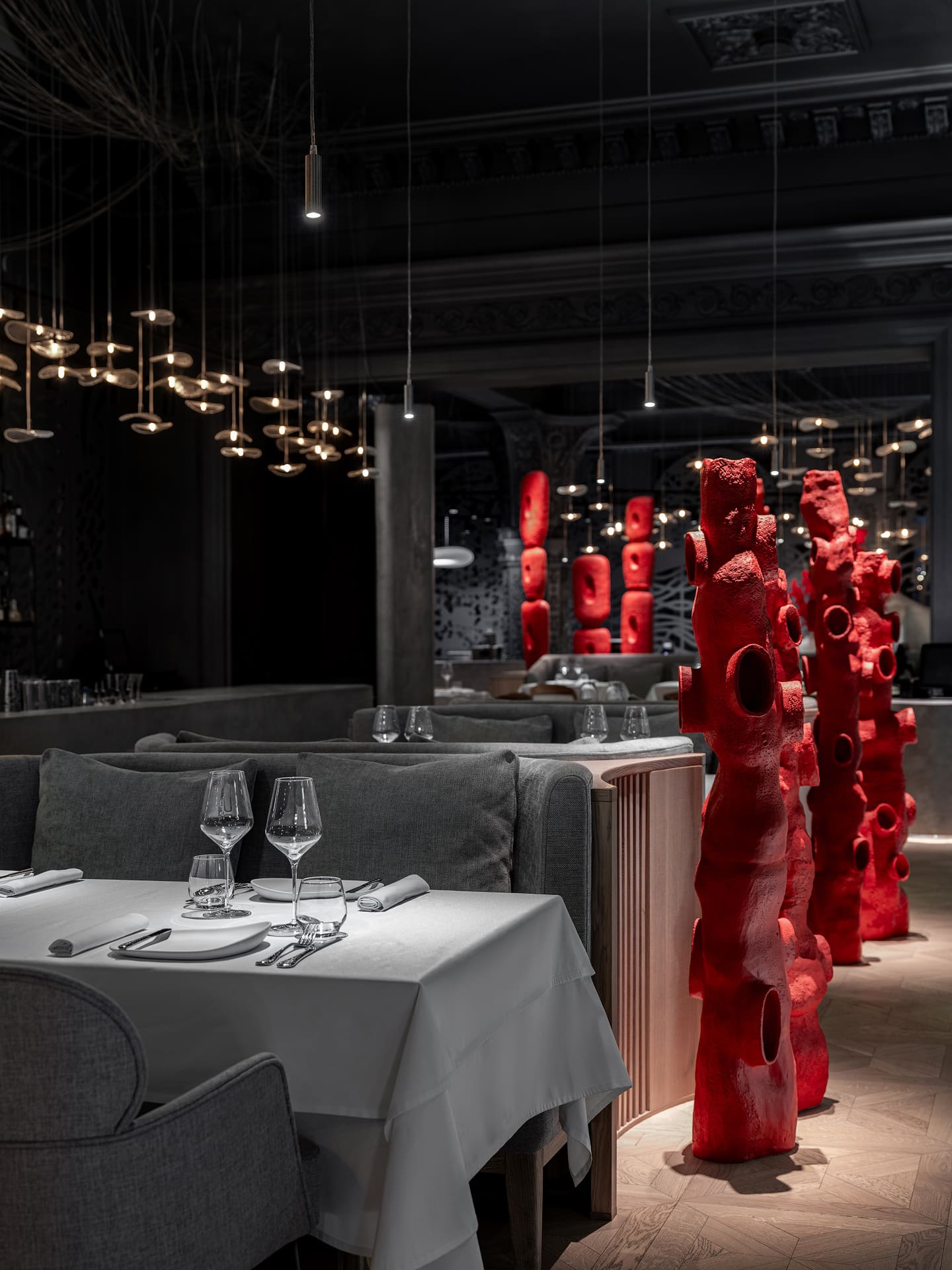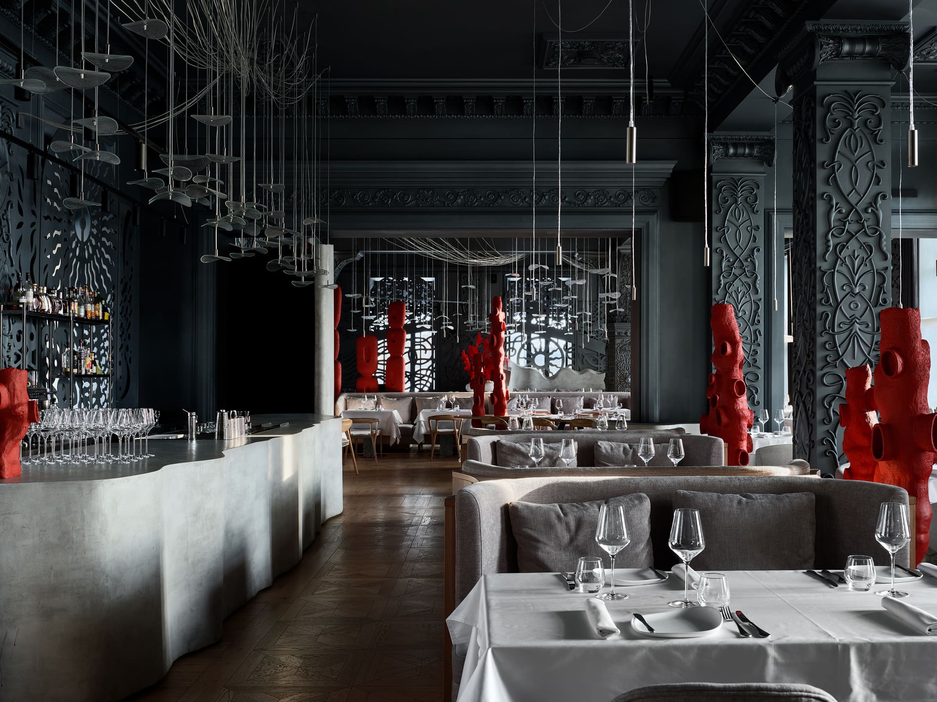 The main task given by the Berrywood Family restaurant group was to create the atmosphere immersing guests in the sea world. The restaurant’s interior is dark, almost monochrome, with lots of reflective metal surfaces. Bright accents — ceramic corals — refer to underwater landscapes. The concrete wave that stretches throughout the space is our tribute to modernist architecture. We decorated surfaces with tailor-made plaster moldings to create expressively fairytale atmosphere. Windows that do not overlook the river are covered with fabled motifs screens. The design of moldings and screens was exclusively created for the project by modern Siberian artist.