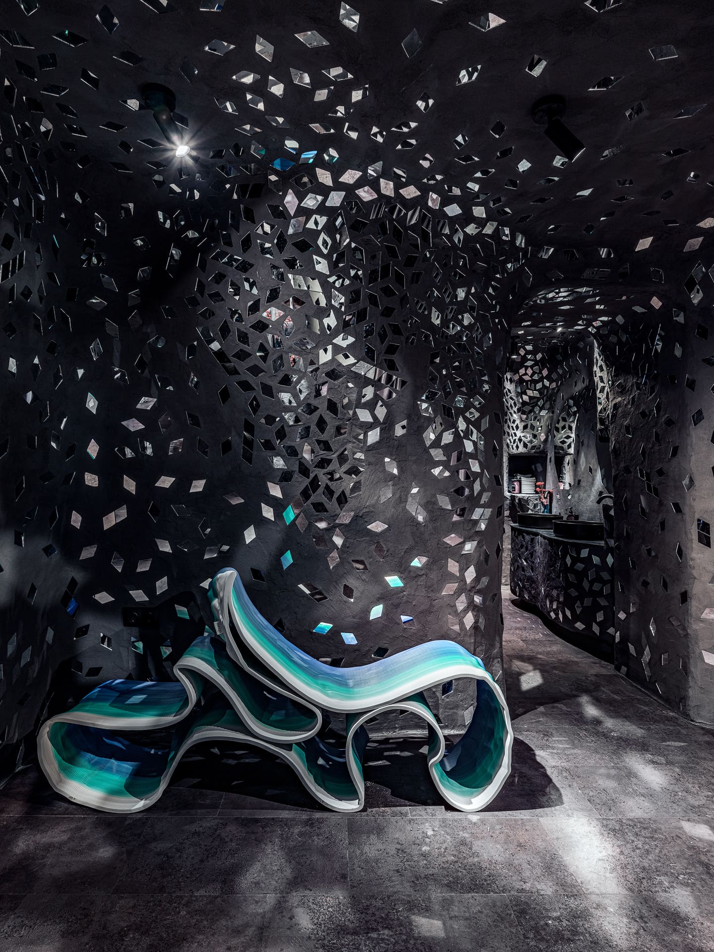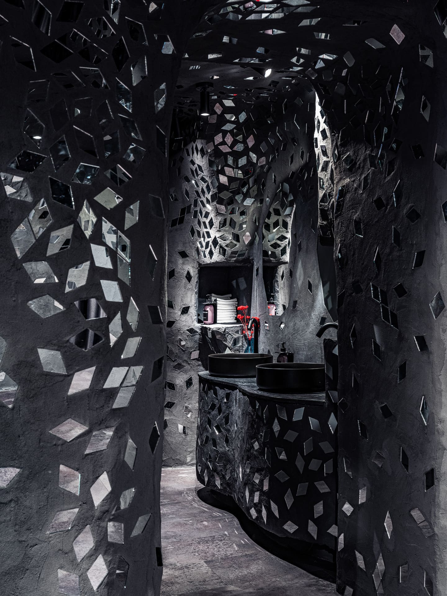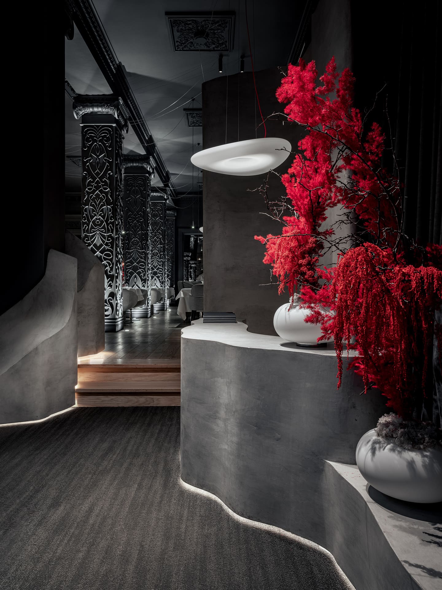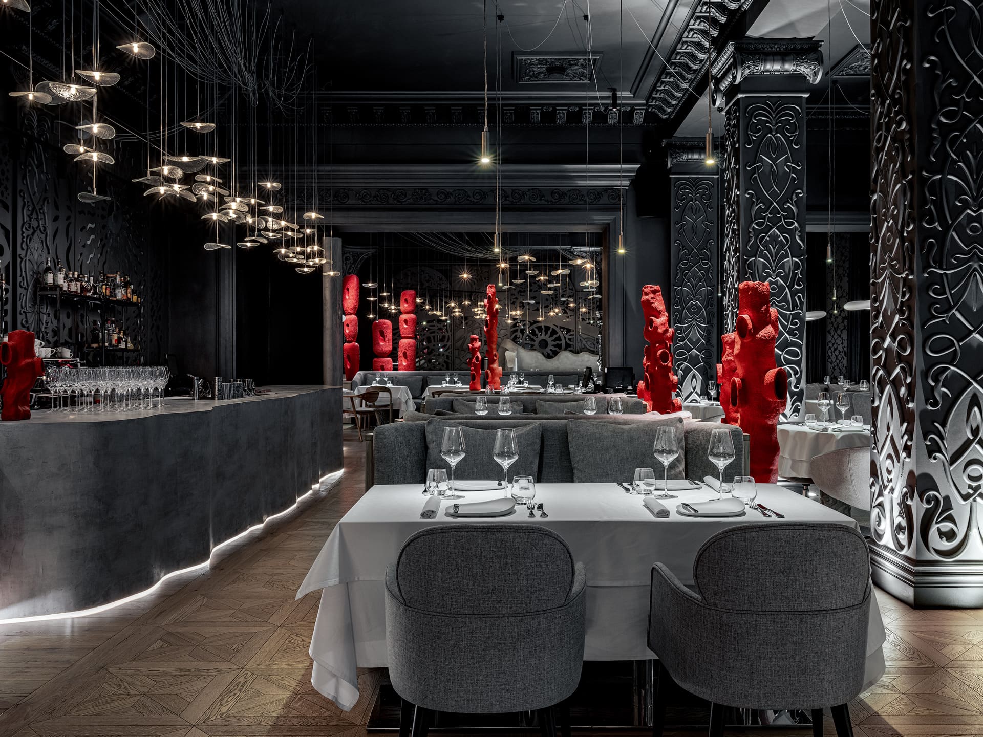 The main task given by the Berrywood Family restaurant group was to create the atmosphere immersing guests in the sea world. The restaurant’s interior is dark, almost monochrome, with lots of reflective metal surfaces. Bright accents — ceramic corals — refer to underwater landscapes. The concrete wave that stretches throughout the space is our tribute to modernist architecture. We decorated surfaces with tailor-made plaster moldings to create expressively fairytale atmosphere. Windows that do not overlook the river are covered with fabled motifs screens. The design of moldings and screens was exclusively created for the project by modern Siberian artist.
