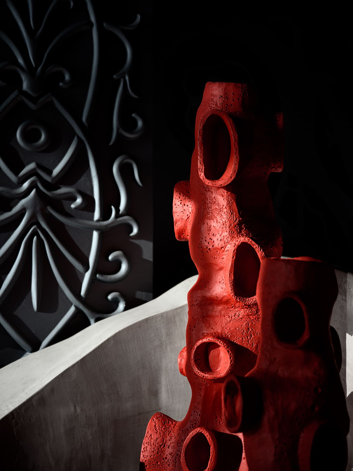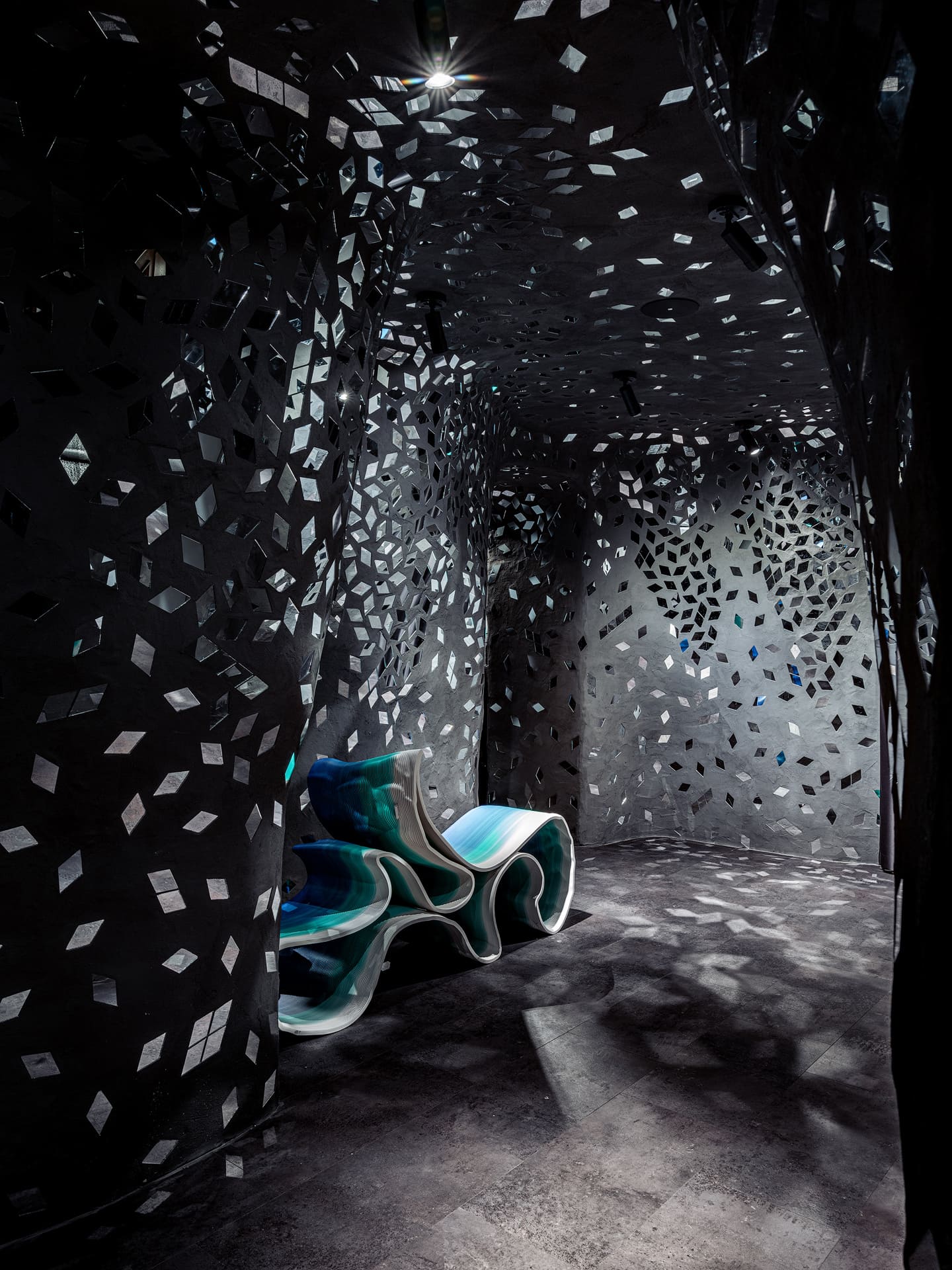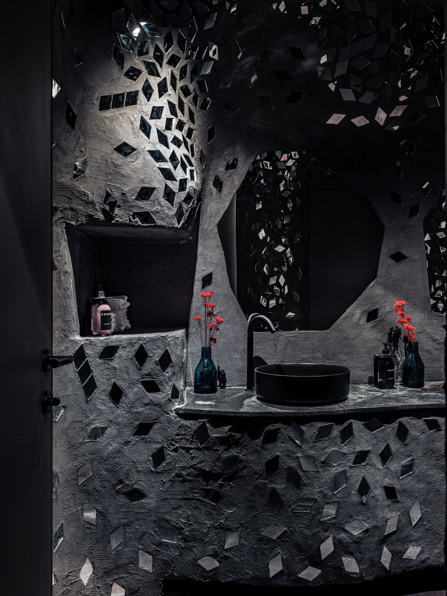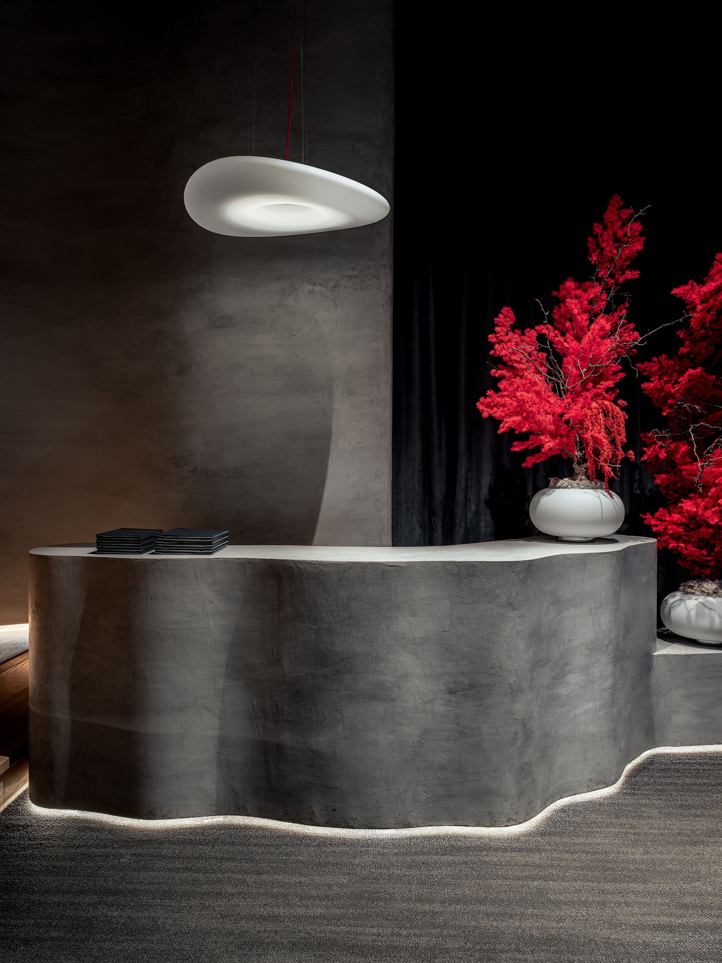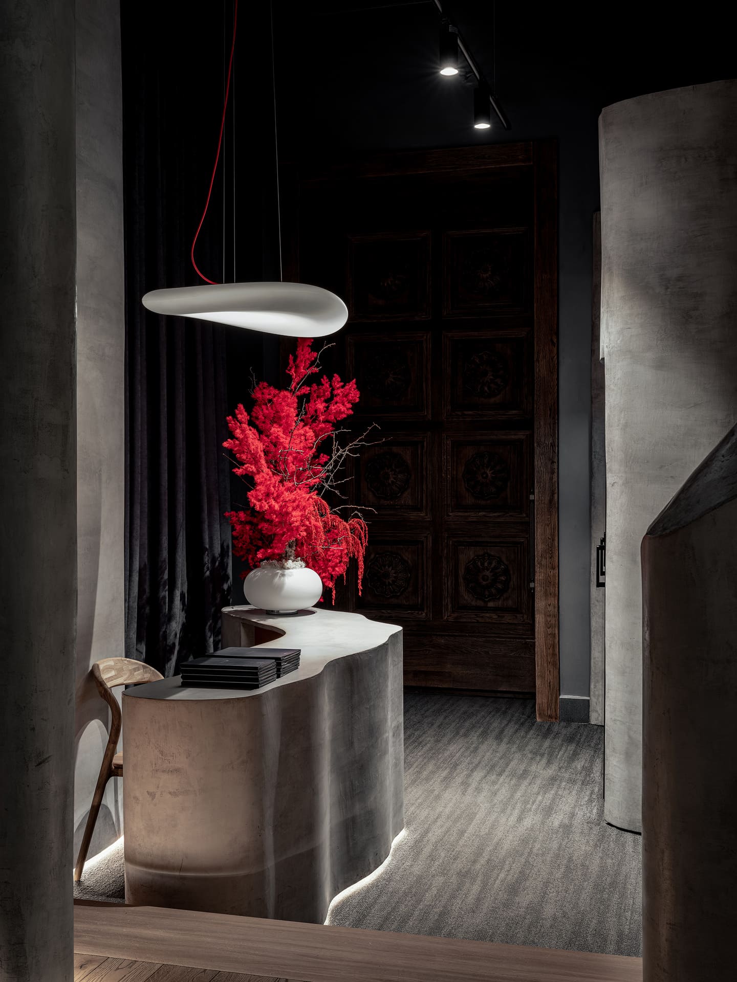 The main task given by the Berrywood Family restaurant group was to create the atmosphere immersing guests in the sea world. The restaurant’s interior is dark, almost monochrome, with lots of reflective metal surfaces. Bright accents — ceramic corals — refer to underwater landscapes. The concrete wave that stretches throughout the space is our tribute to modernist architecture. We decorated surfaces with tailor-made plaster moldings to create expressively fairytale atmosphere. Windows that do not overlook the river are covered with fabled motifs screens. The design of moldings and screens was exclusively created for the project by modern Siberian artist.