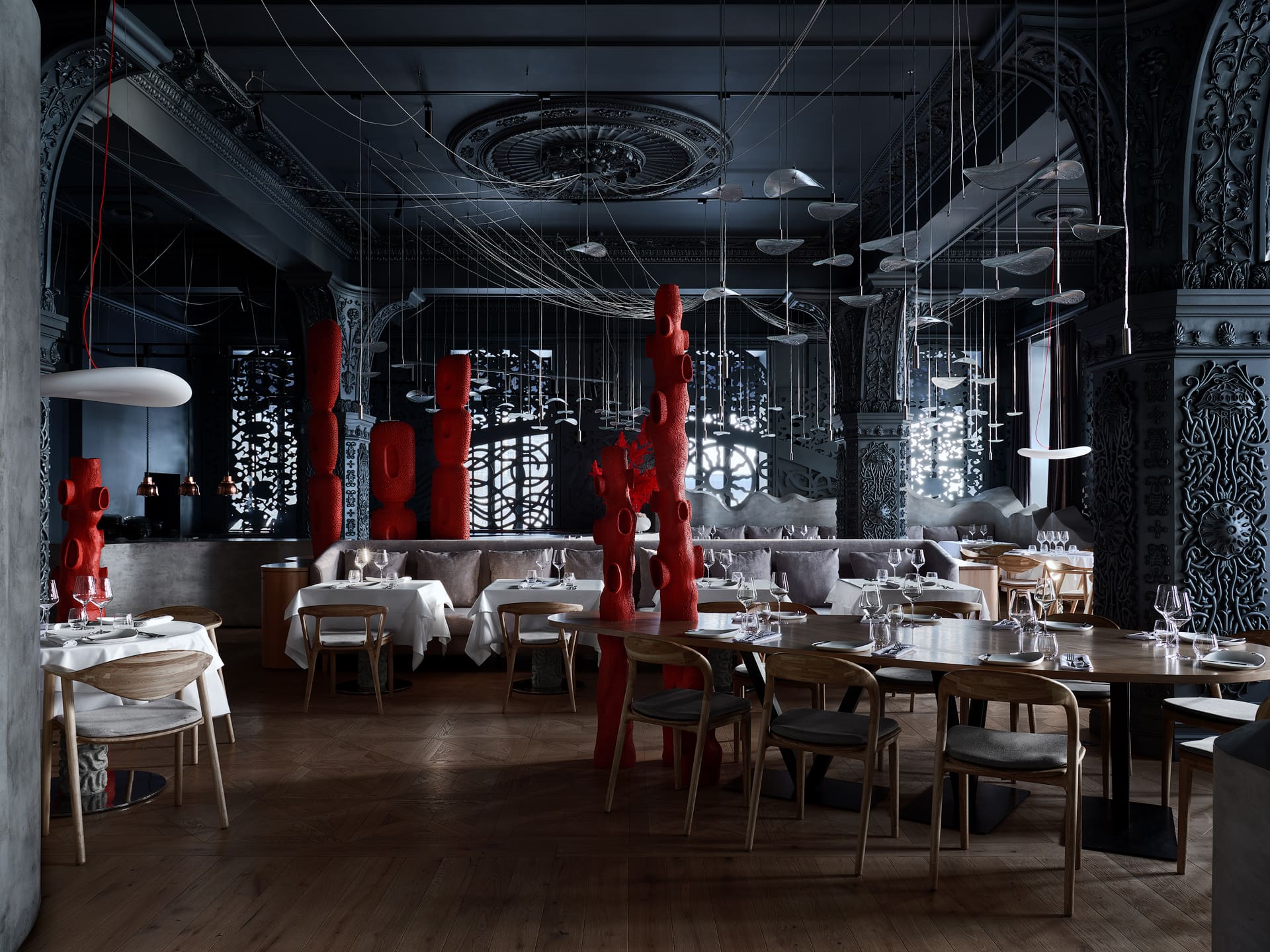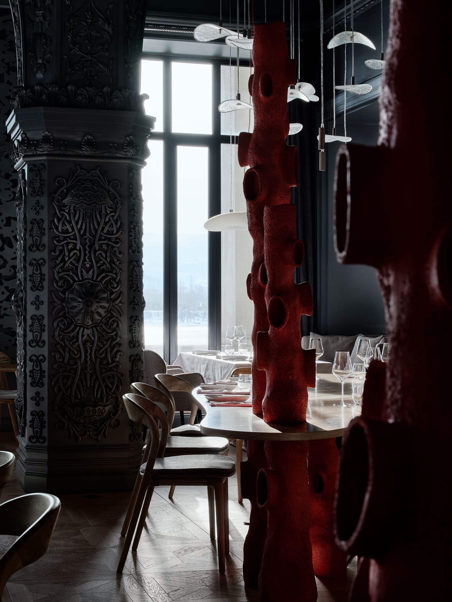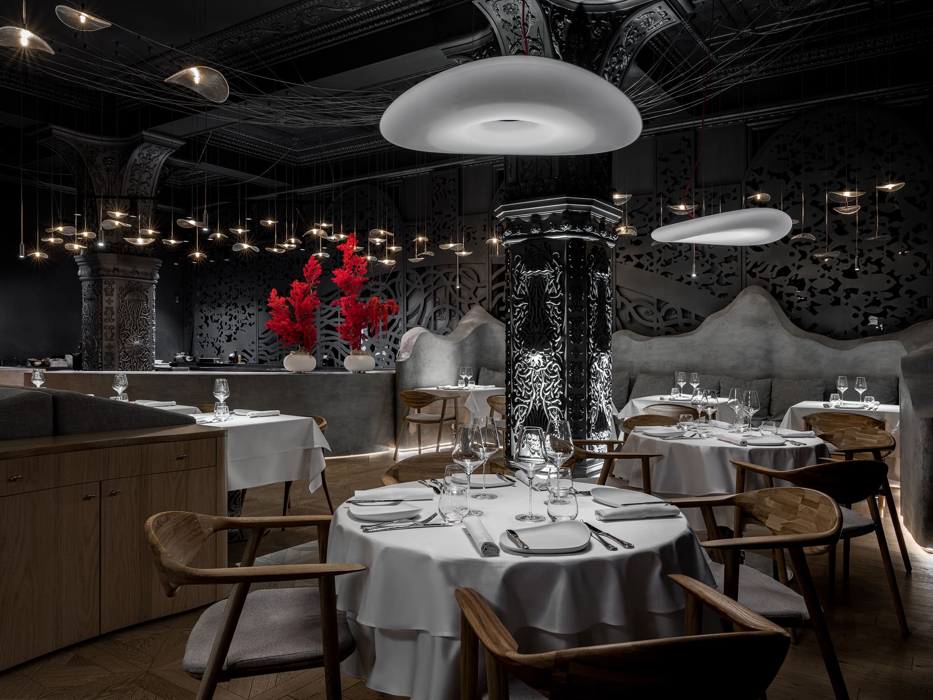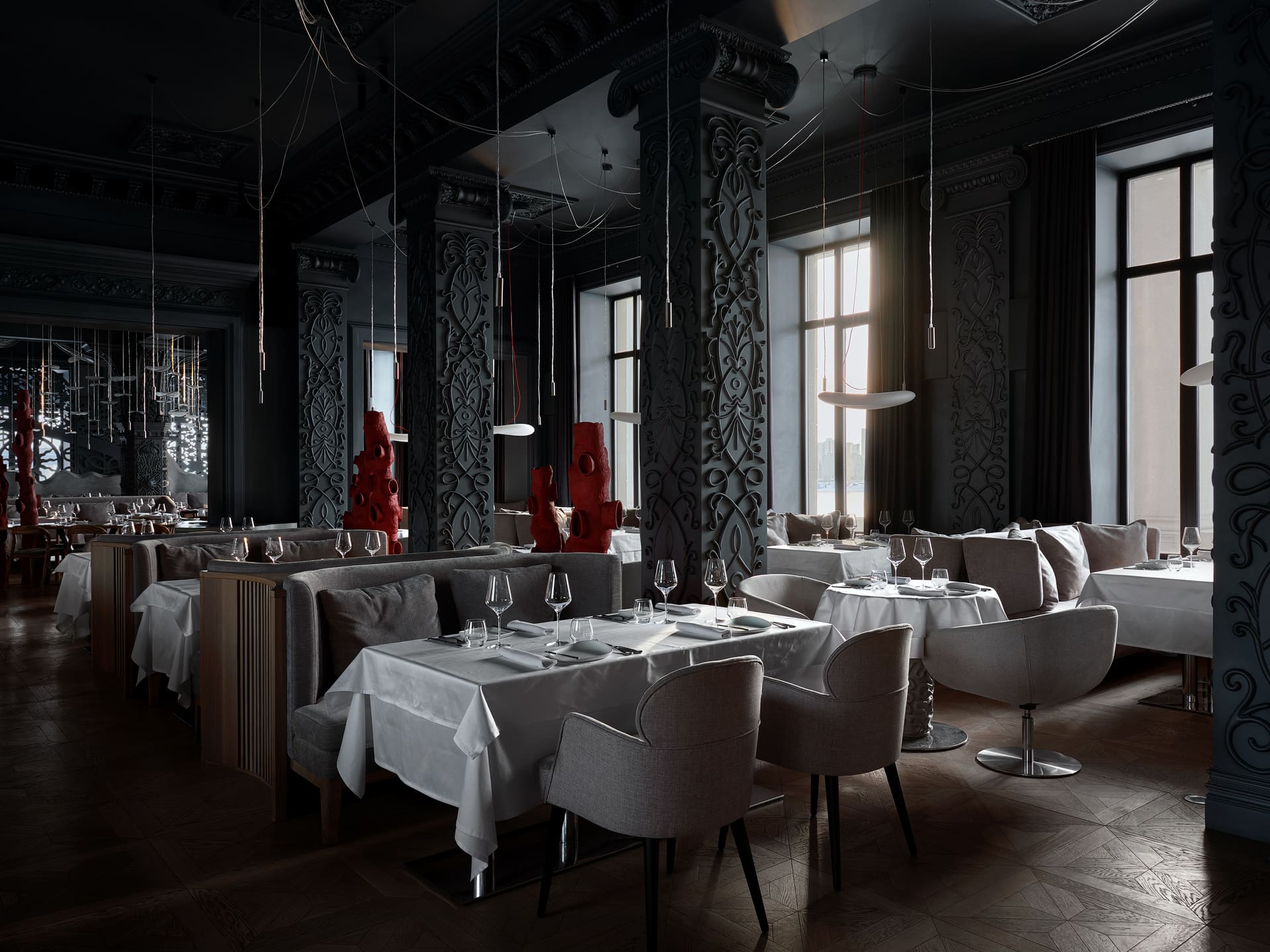 The concept of the SADKO restaurant and basis of the cuisine were determined by its proximity to the river and location in the historical building of the river port. Restaurant’s name refers to an ancient folklore legend about a merchant who once traveled to the kingdom of the sea sovereign. The combination of the extraordinary and unbelievable beauty of the underwater world and a fairytale with folklore patterns immerses guests in a magical mystical atmosphere.