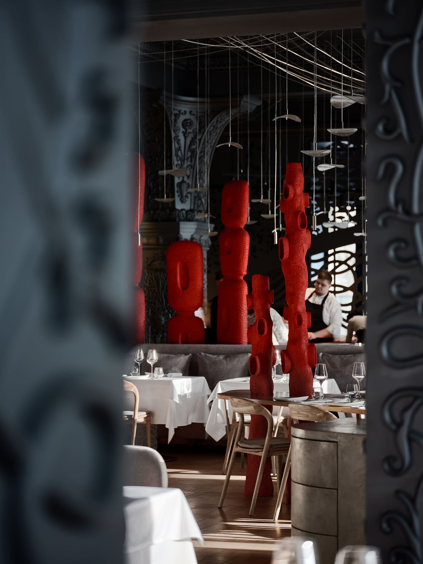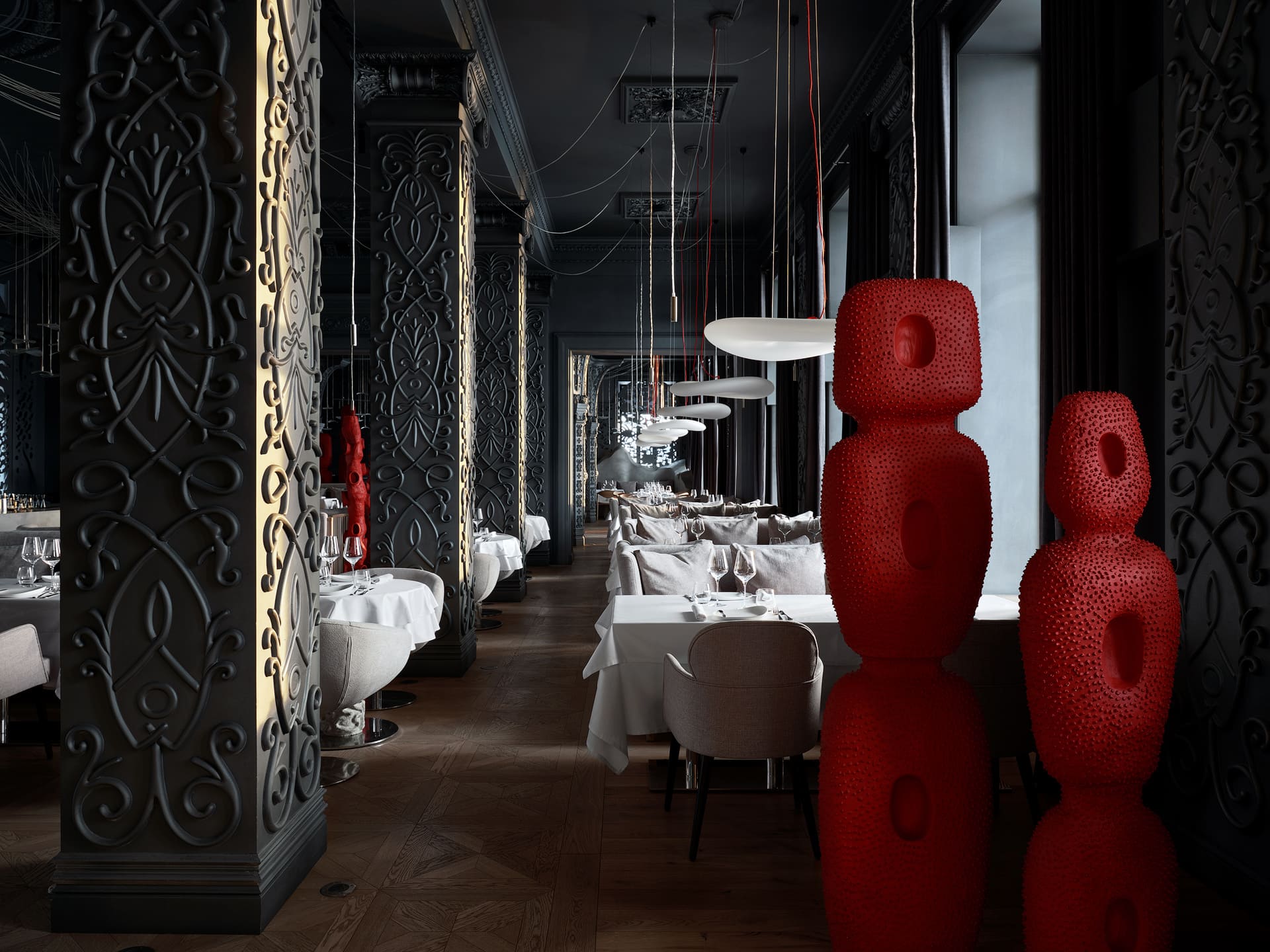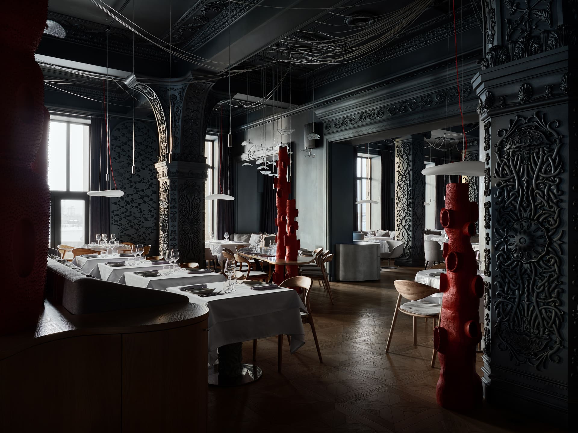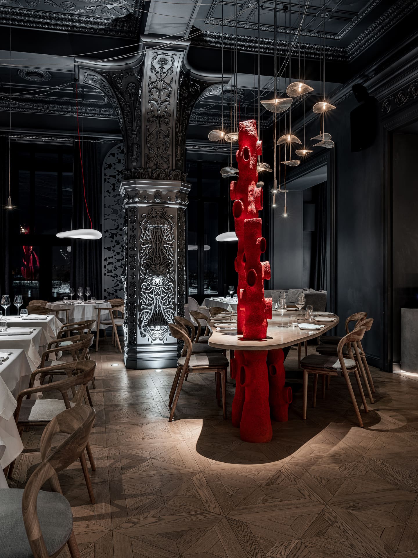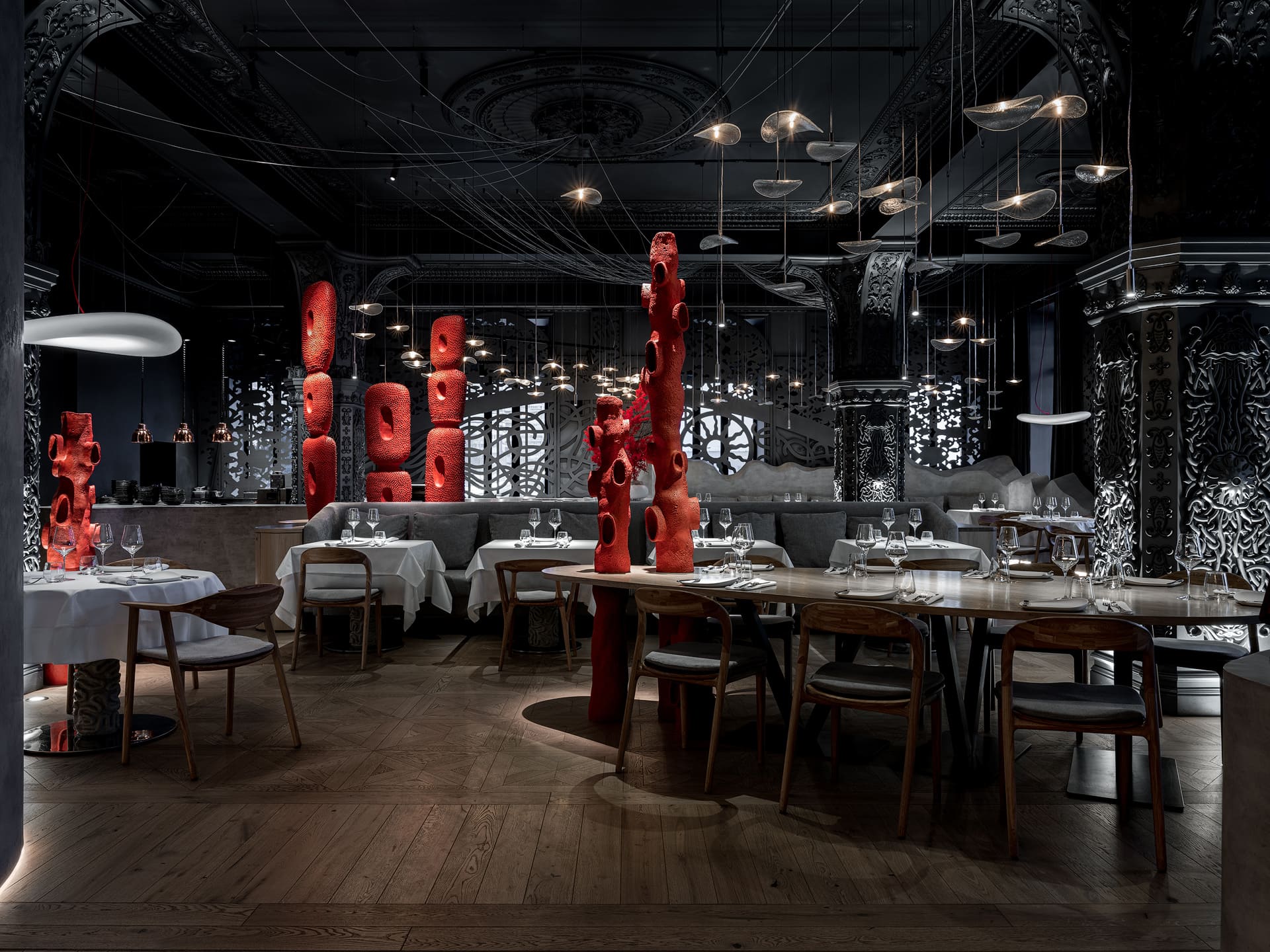 The concept of the SADKO restaurant and basis of the cuisine were determined by its proximity to the river and location in the historical building of the river port. Restaurant’s name refers to an ancient folklore legend about a merchant who once traveled to the kingdom of the sea sovereign. The combination of the extraordinary and unbelievable beauty of the underwater world and a fairytale with folklore patterns immerses guests in a magical mystical atmosphere.