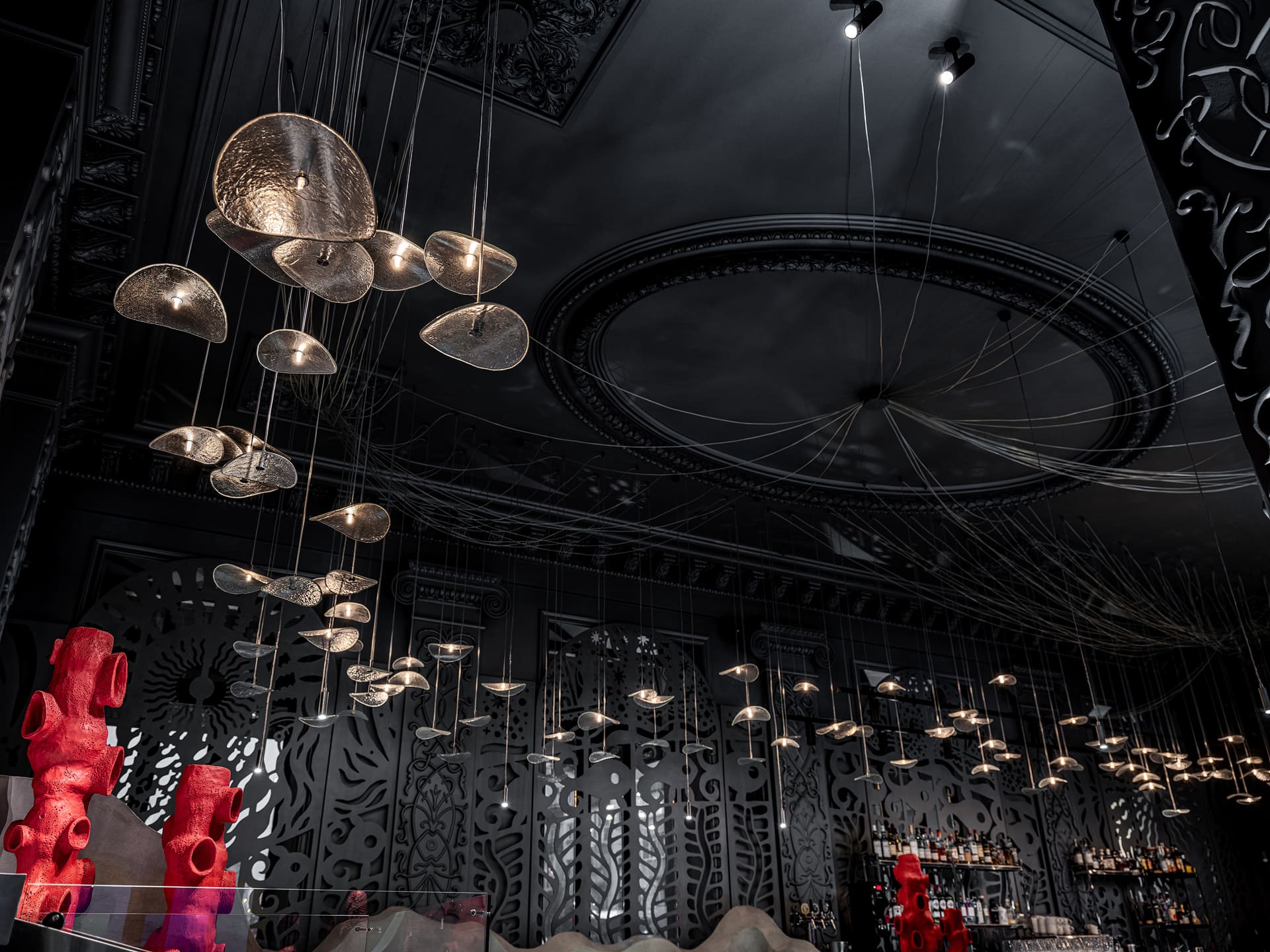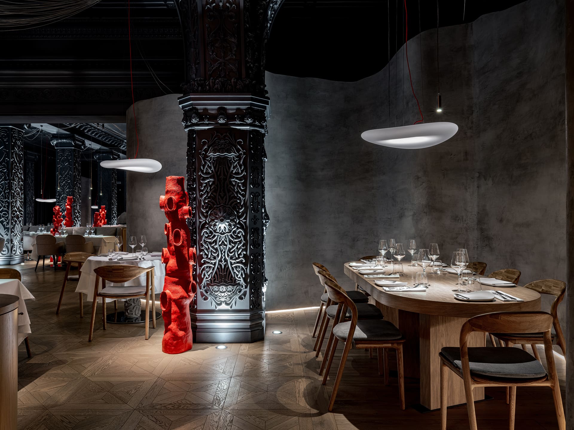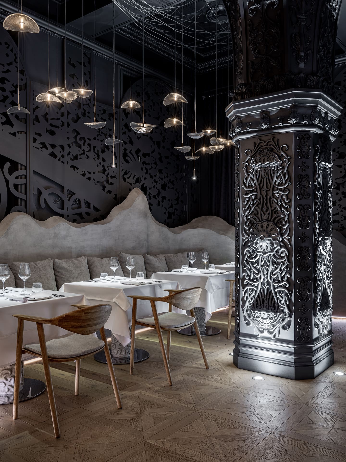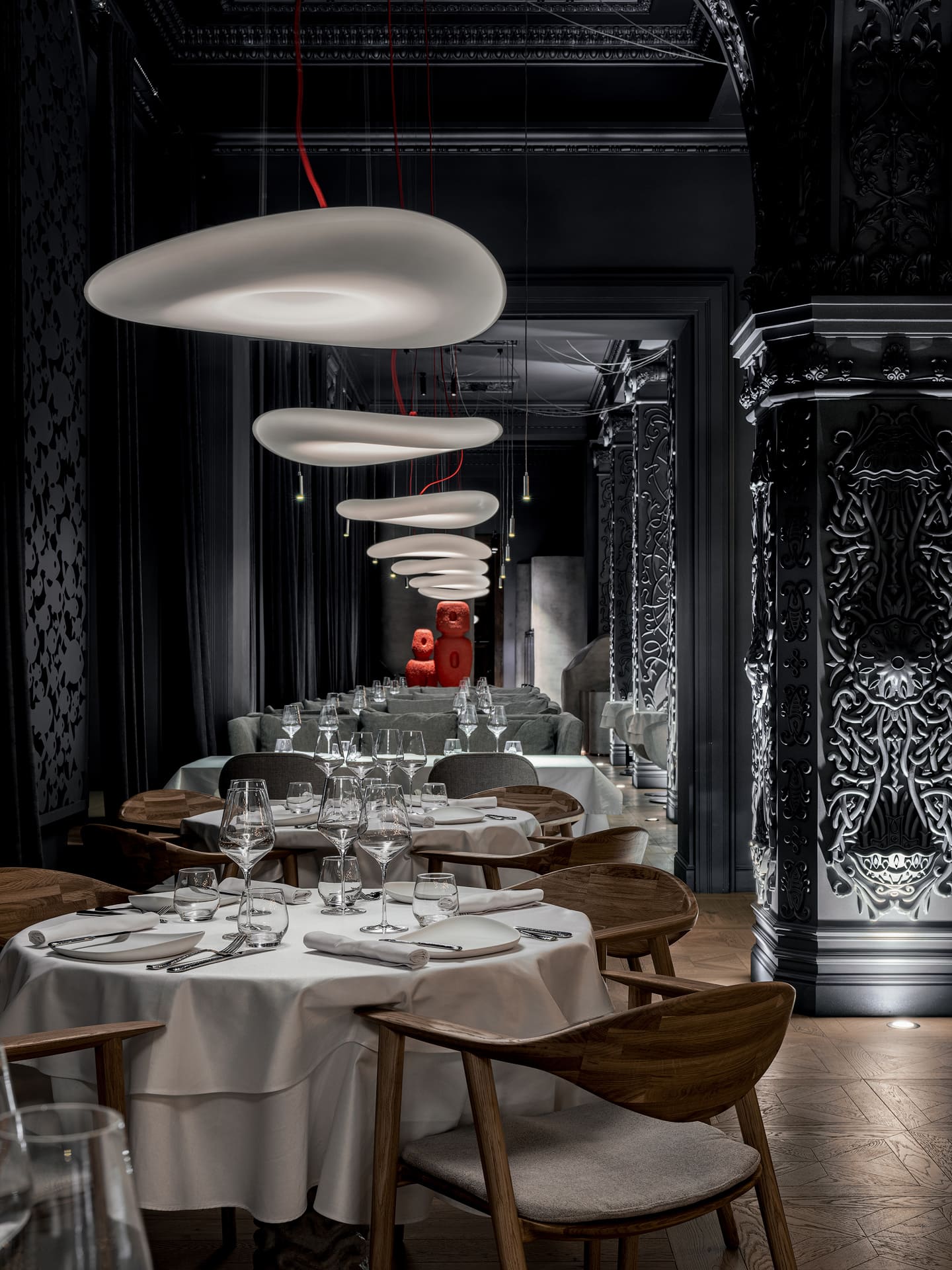 Interior of the SADKO restaurant — is mix of building’s classic architecture with a touch of modern trends. Working with spaces of cultural heritage is exciting though might be quite complicated. The floor level was uplifted in order to preserve historical ceiling and install AC-system. The limited number of electrical outputs led to creative decision to fix more than 200 “jellyfish” lamps using transparent wires to get the composition reminiscent of algae dance in sea water.