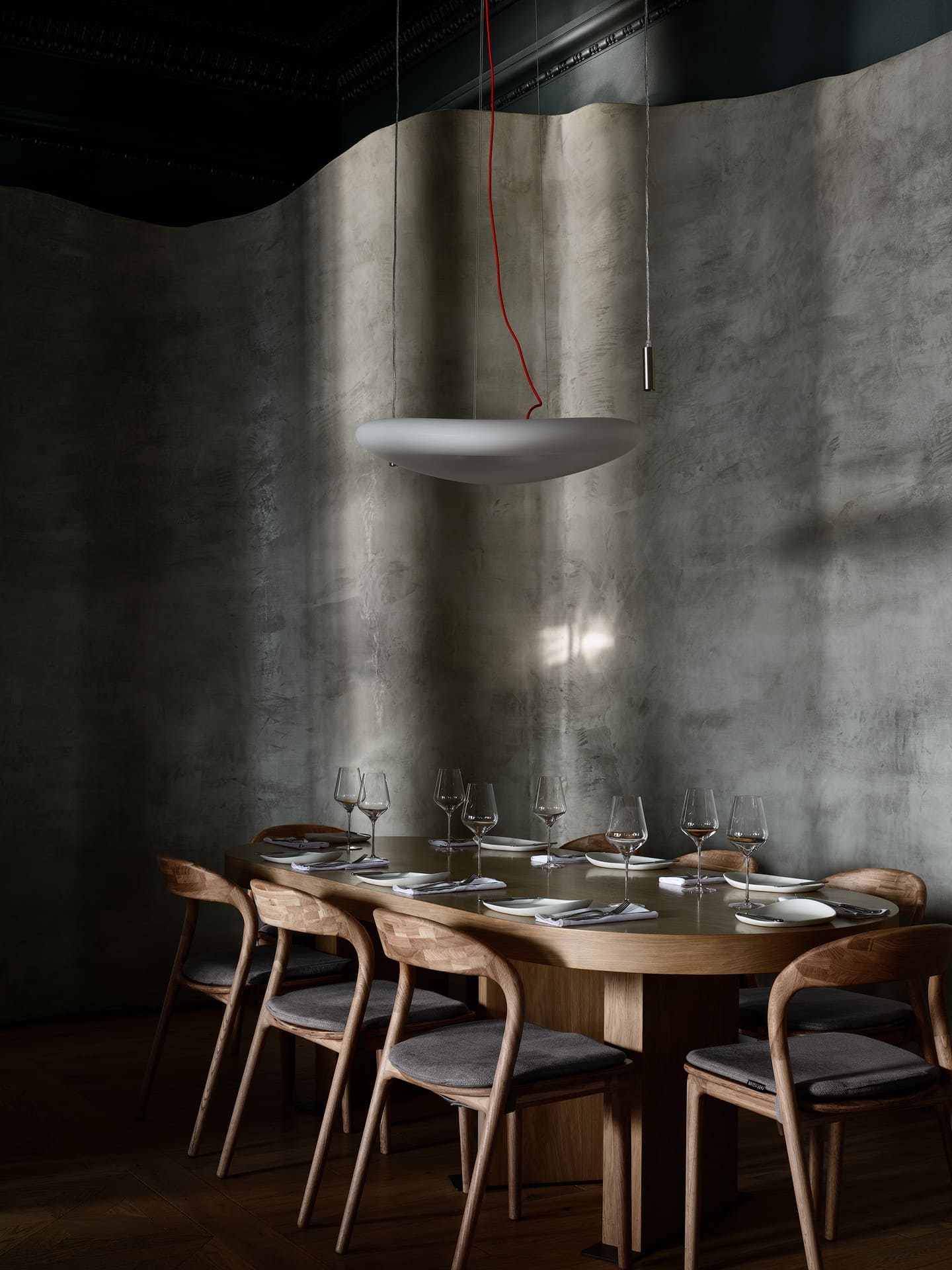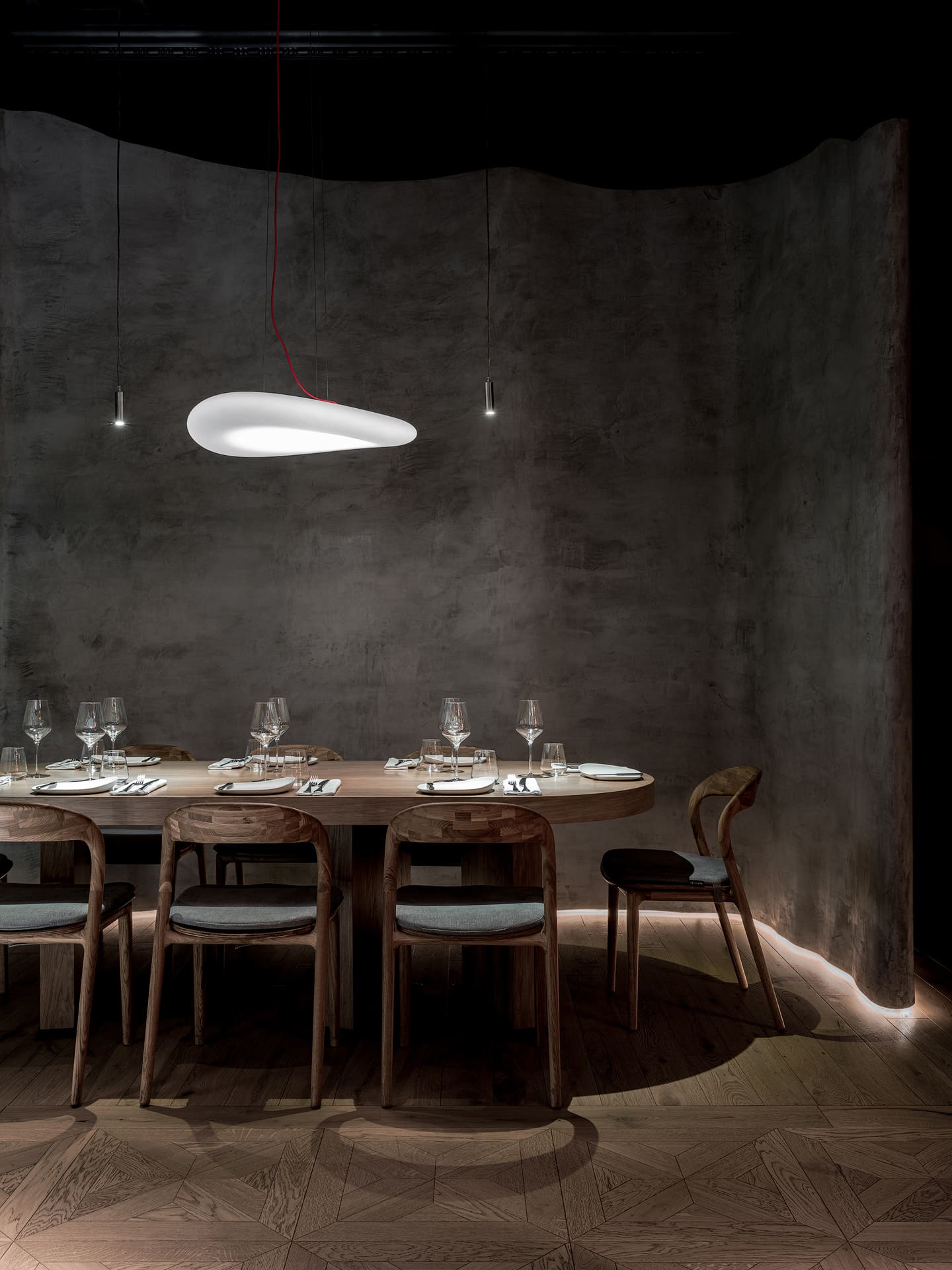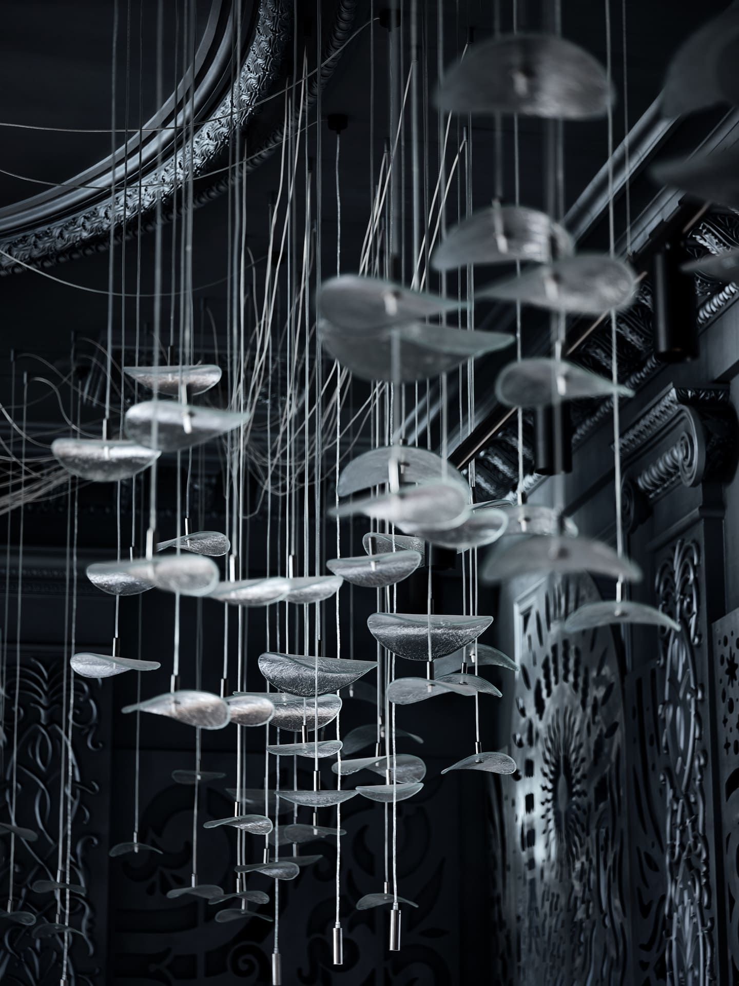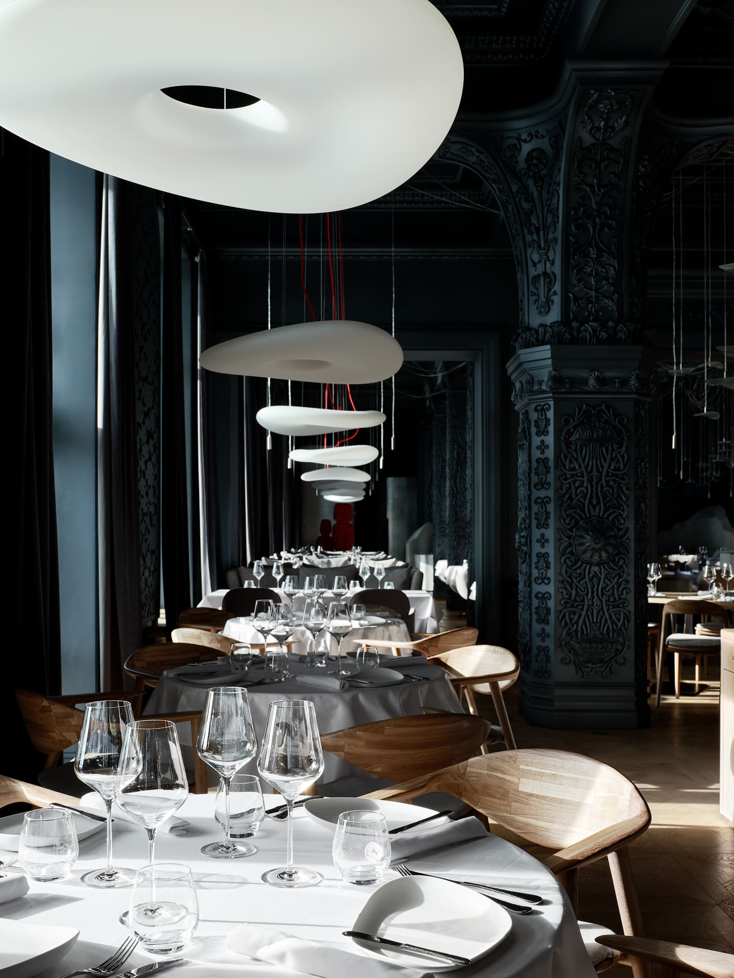 Interior of the SADKO restaurant — is mix of building’s classic architecture with a touch of modern trends. Working with spaces of cultural heritage is exciting though might be quite complicated. The floor level was uplifted in order to preserve historical ceiling and install AC-system. The limited number of electrical outputs led to creative decision to fix more than 200 “jellyfish” lamps using transparent wires to get the composition reminiscent of algae dance in sea water.