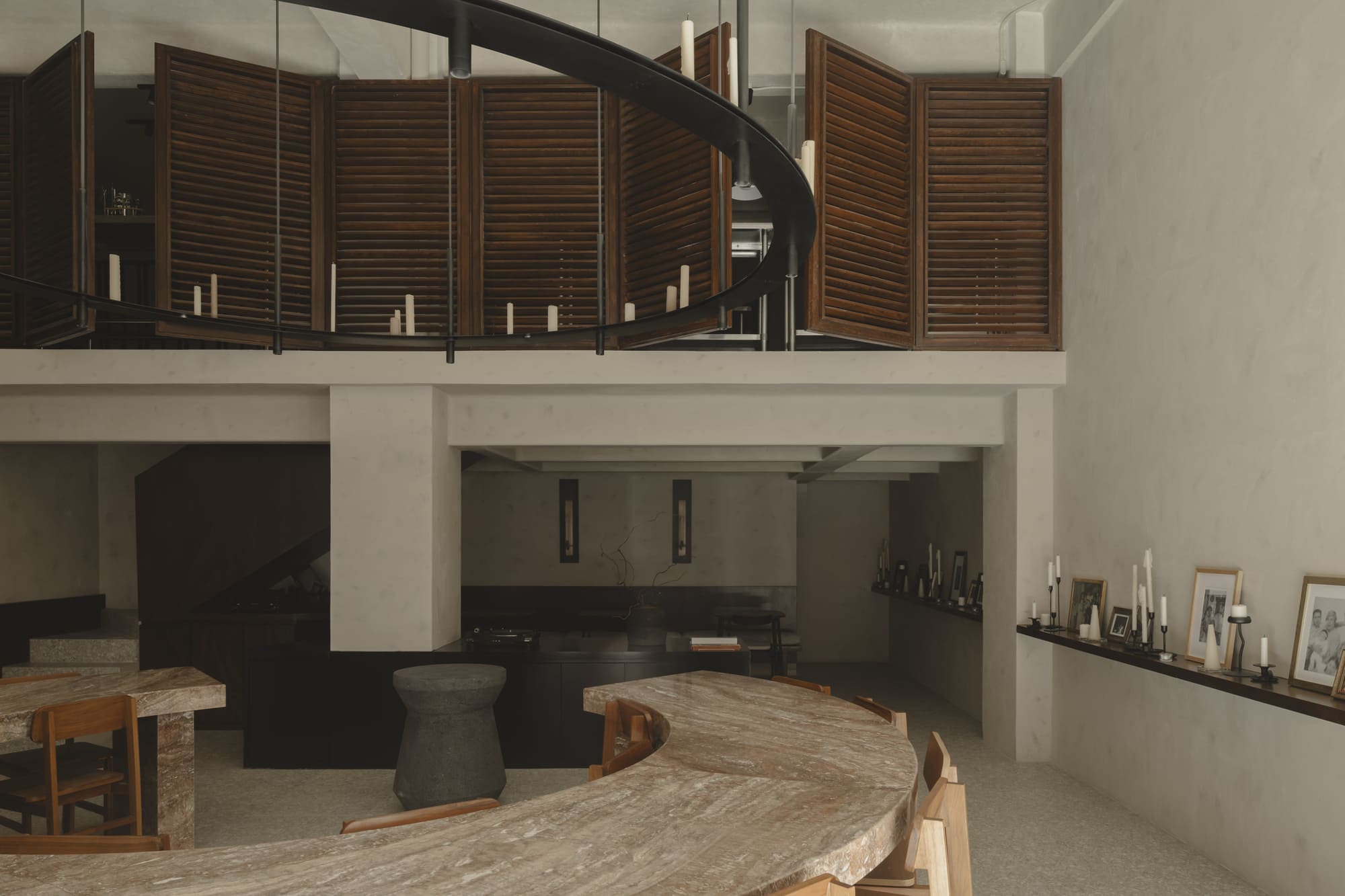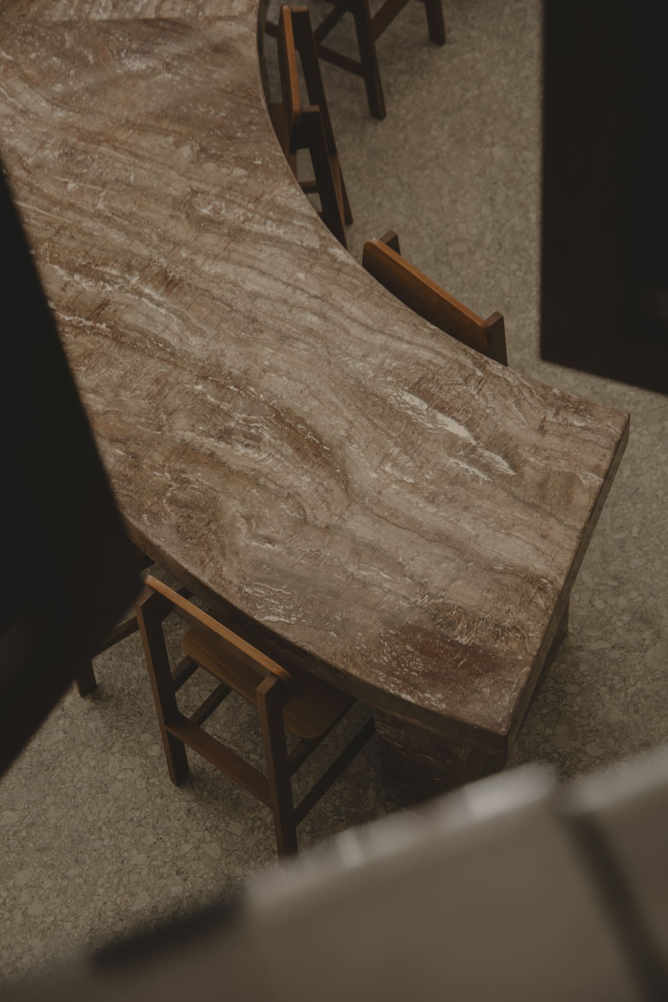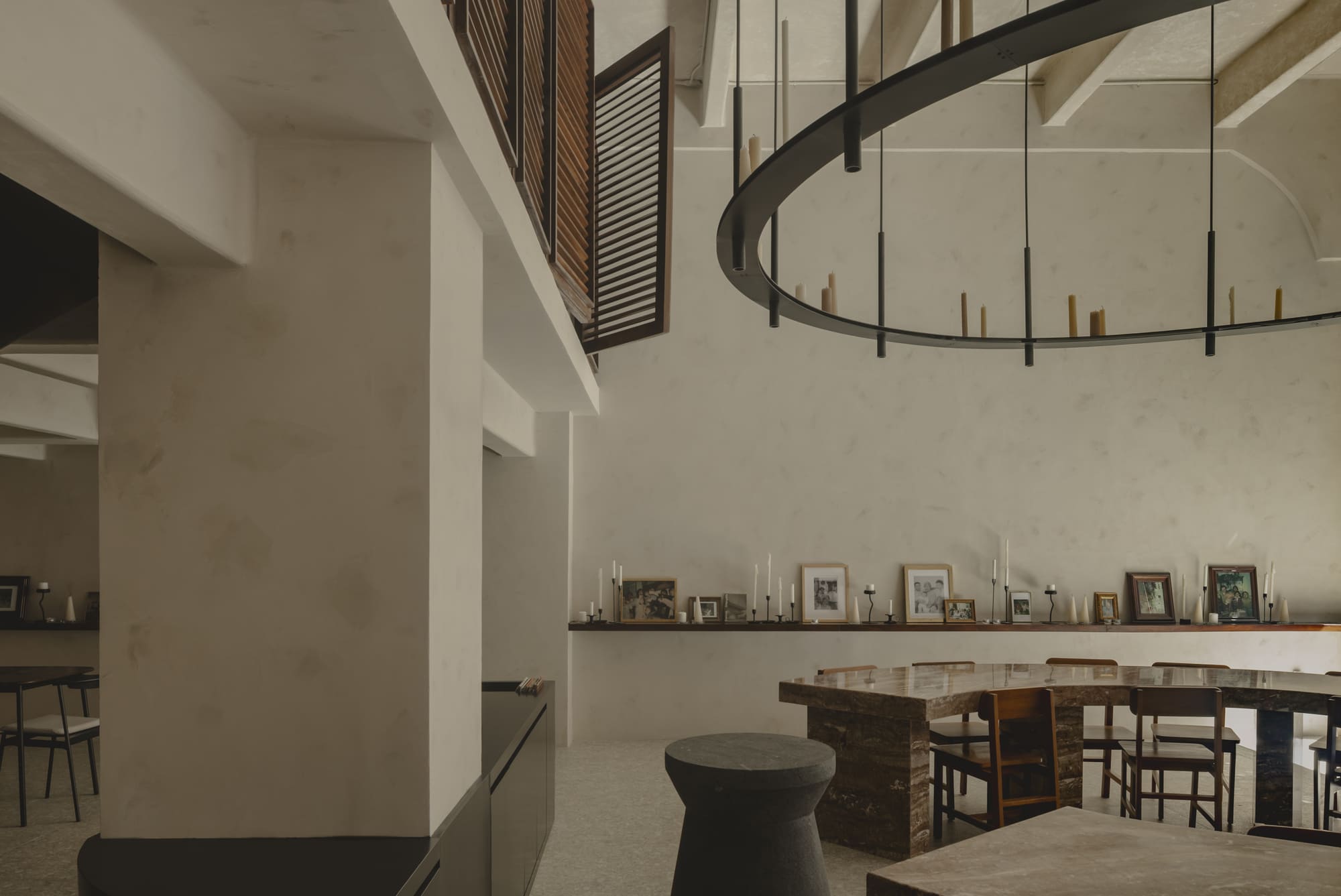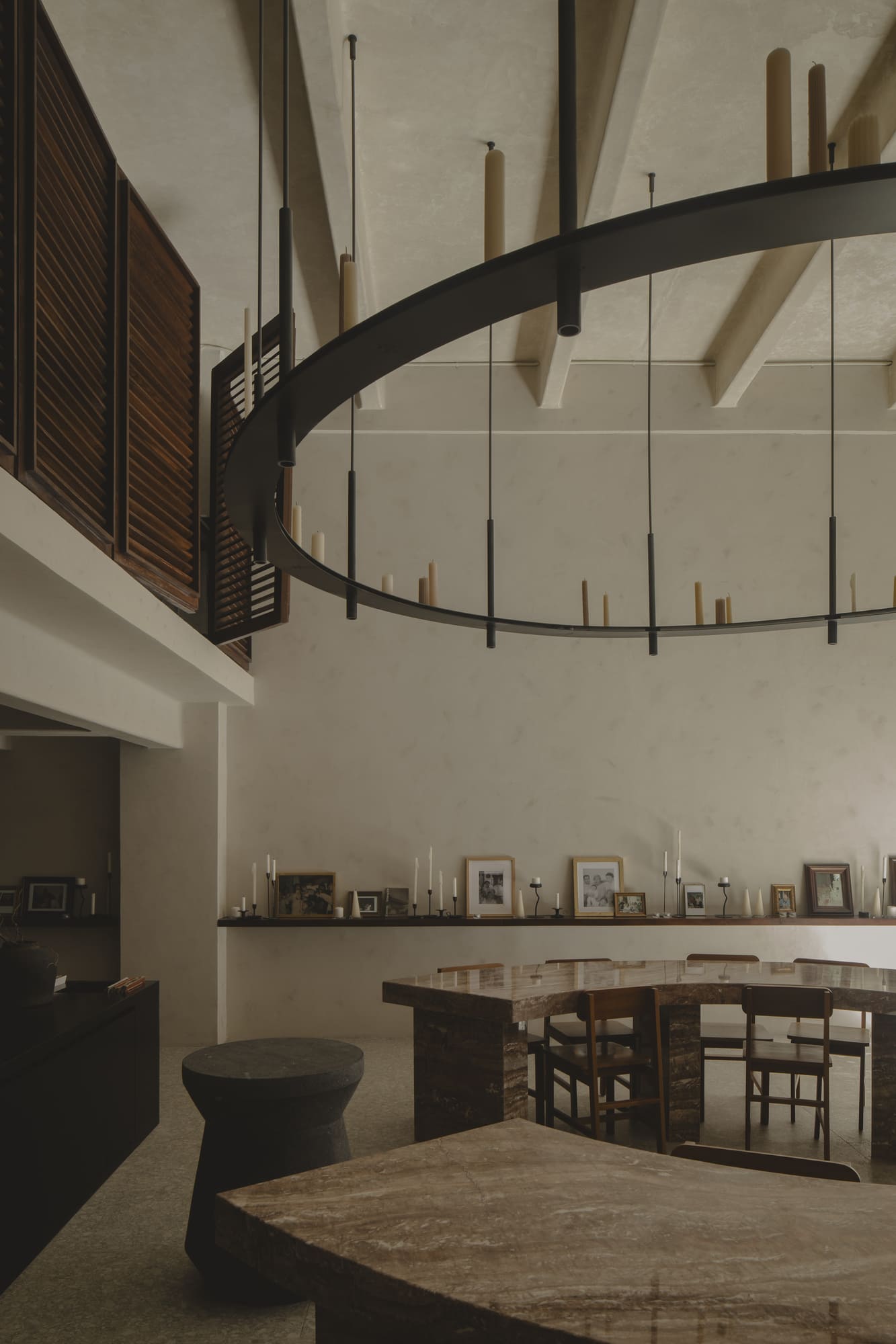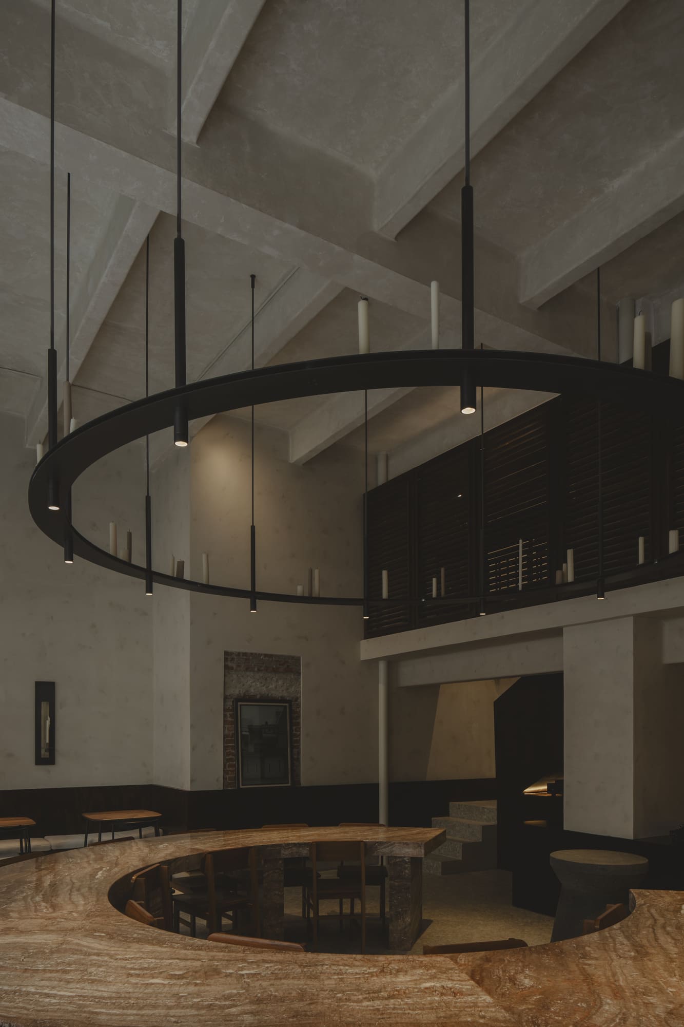 From this idea came the communal table—not as a simple piece of furniture, but as a sculptural and symbolic gesture that defines the heart of the restaurant. The red marble table not only organizes the space but also becomes a ritual axis: a meeting point and dialogue that condenses the gastronomic and architectural proposal. Around it, a totem closes the circle and acts as a piece imbued with meaning, open to being inhabited as both symbol and ritual.