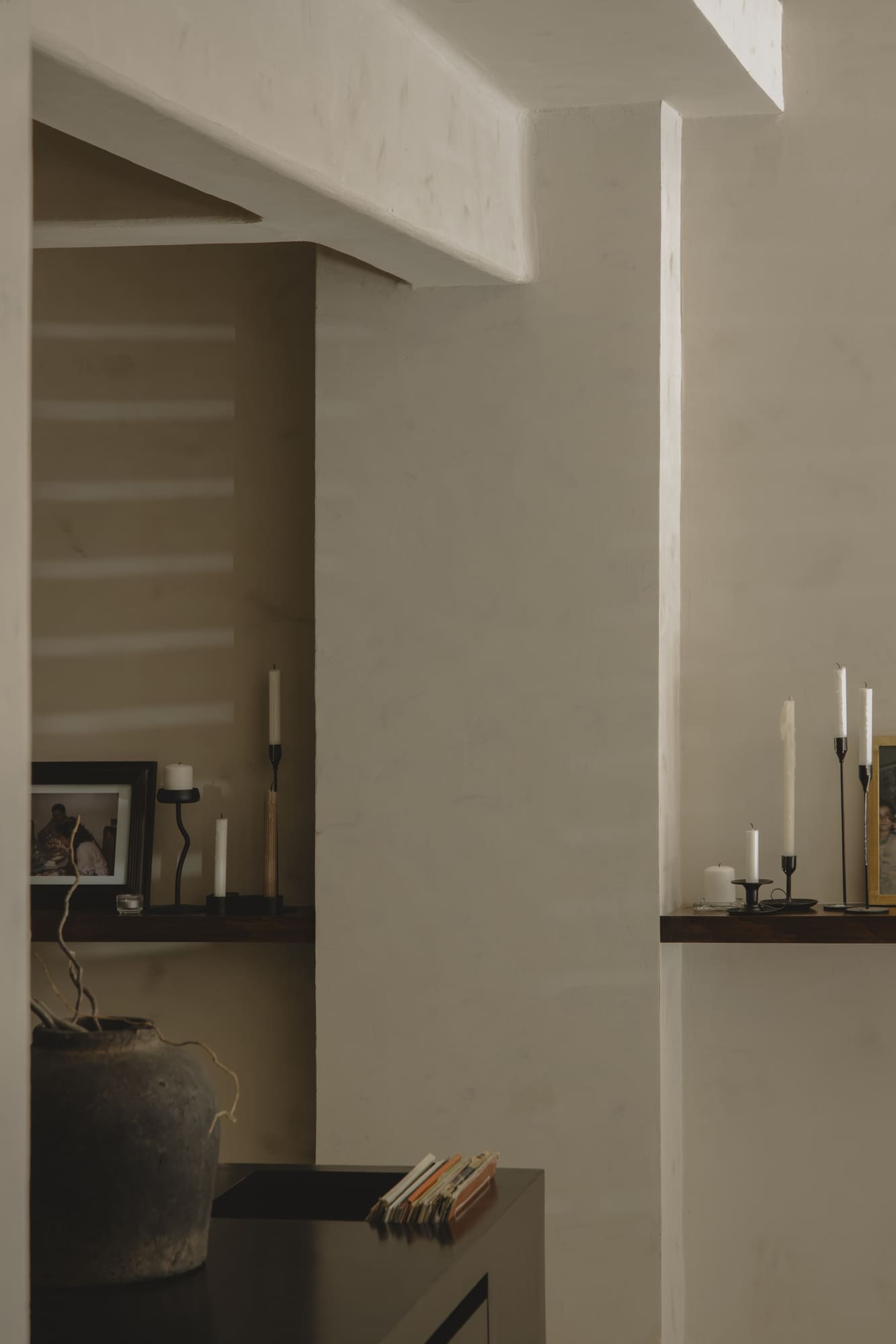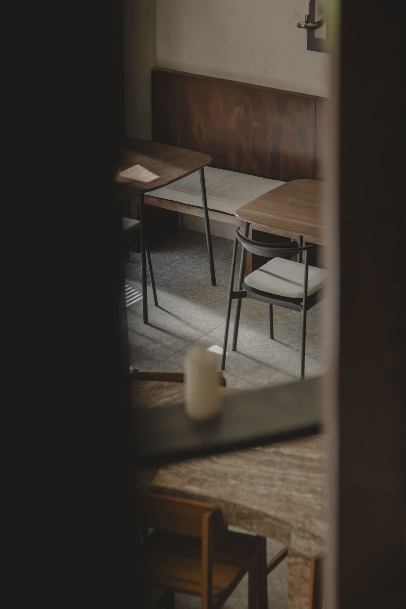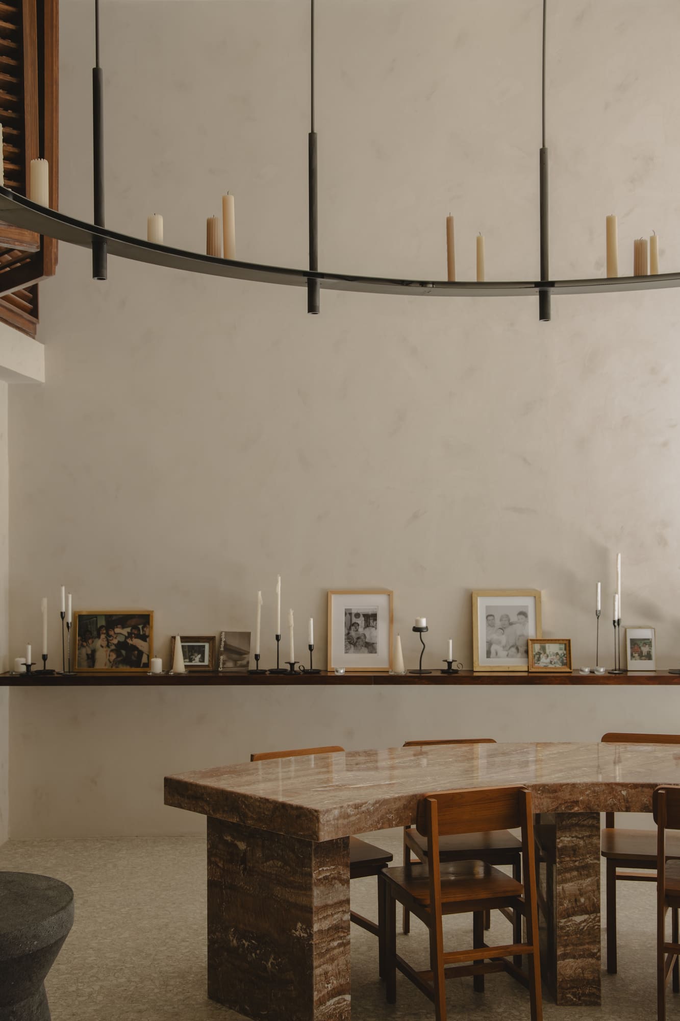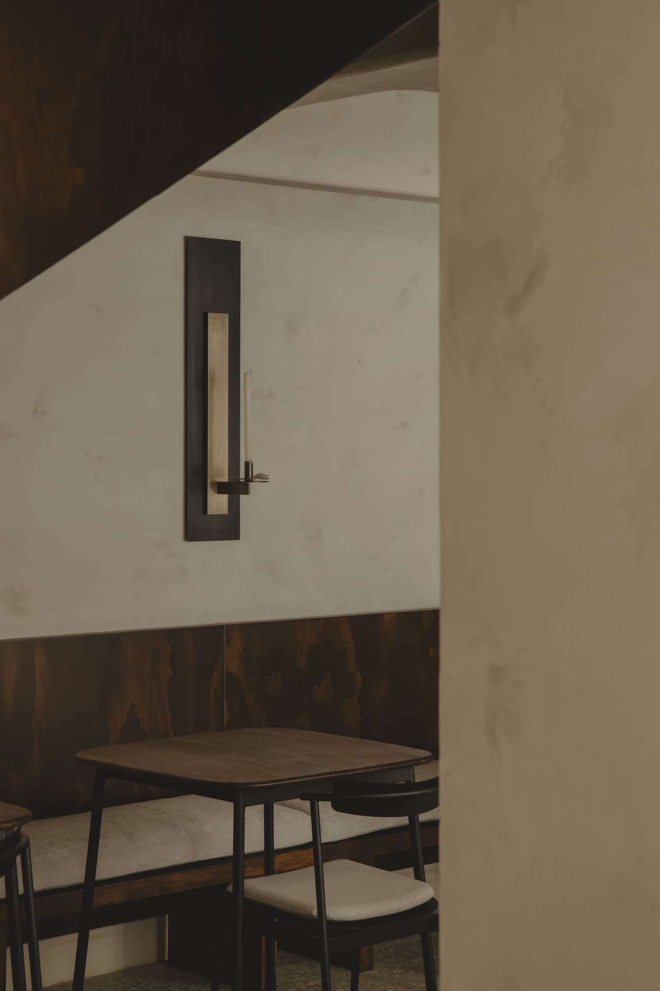 Stone appears at different moments, in the light fixtures, in the details, in the table itself, as a reminder of permanence and roots. The furniture, carefully selected by the architects, reinforces the idea of containment: wood supports, stone grounds, light softens. Even the tableware was conceived and designed especially by Mon, created to embrace the food and extend the gesture of care from the kitchen to the diner.