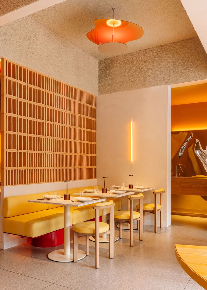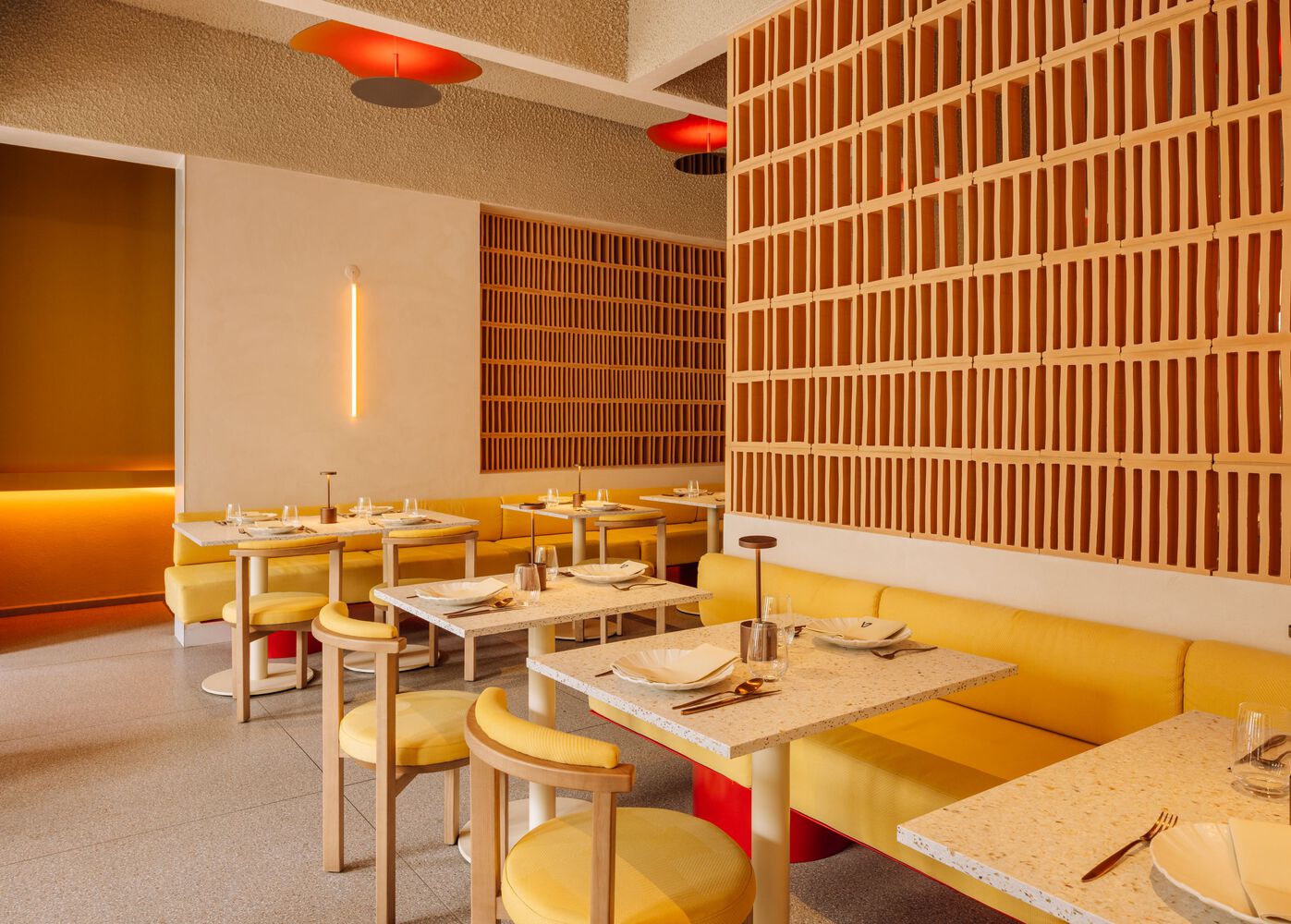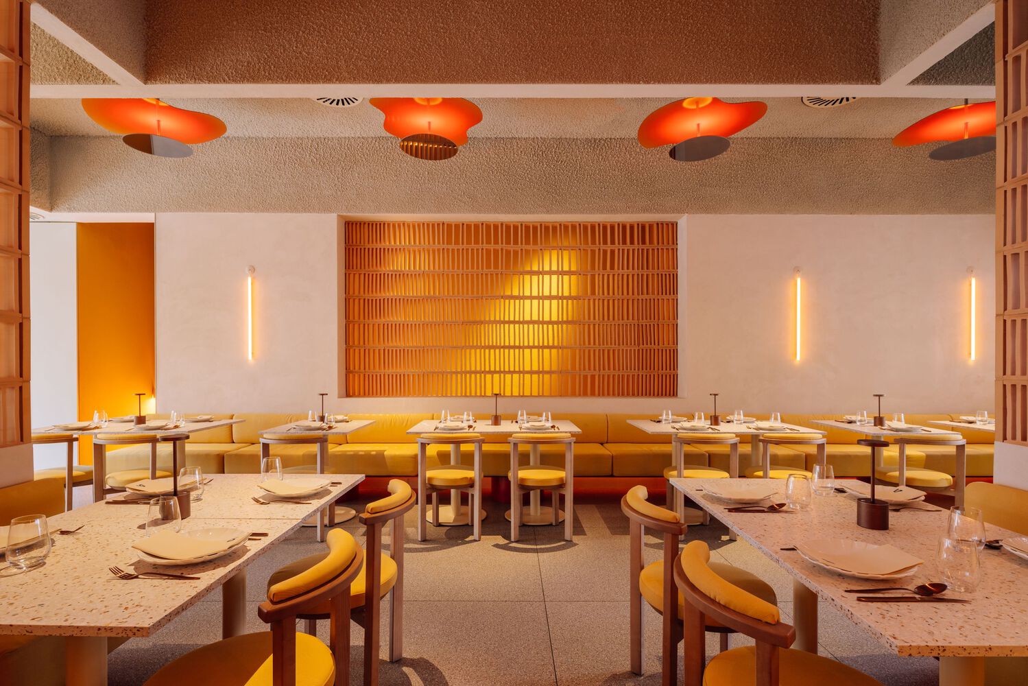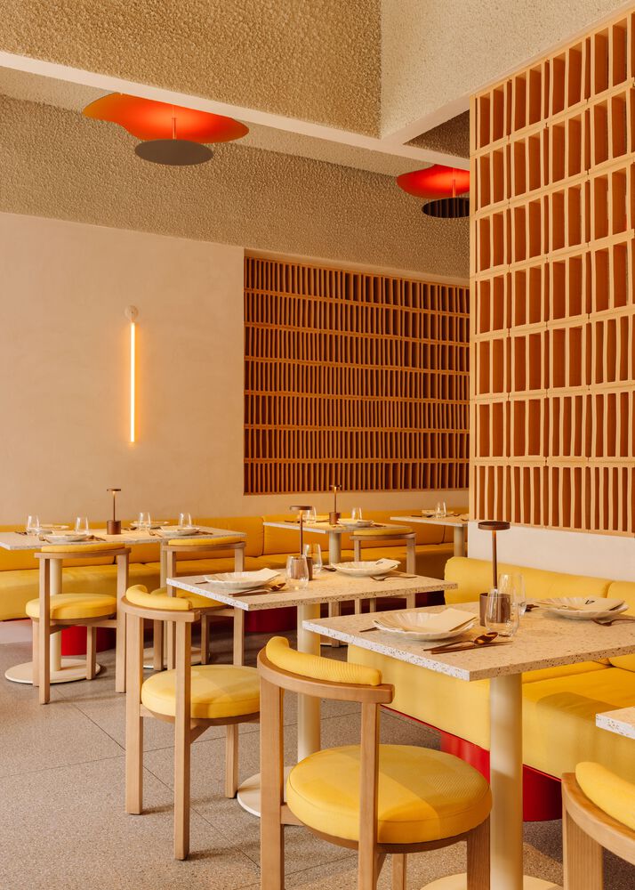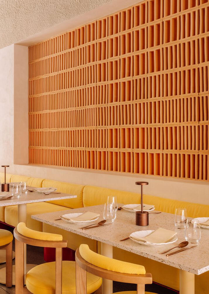 As a contemporary interpretation of that Italian flair, which goes from the Alpine lakes to the olive groves of Puglia, we needed to make sure the food was the principal ingredient in this equation, and that the space to enjoy it was warm and cozy, with bright oranges and yellows, almost an outside looking in perspective, sunny side up.