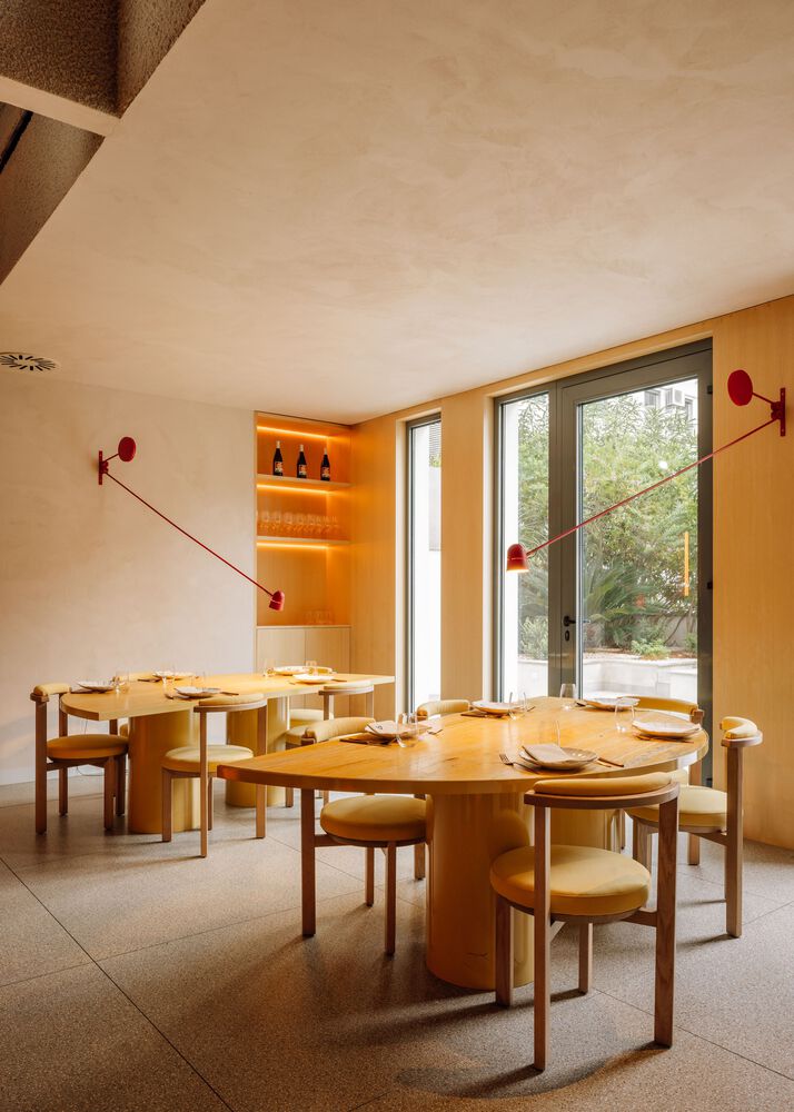 For the tables, which have an almost “pizza” folding and transmit the idea of intimate family and friends gatherings, we chose materials which almost blend with the wall textures, and we used very soft lighting which accentuates warmth again (cue to beautiful streamlined wall lamps which are our pride, or bread and butter).