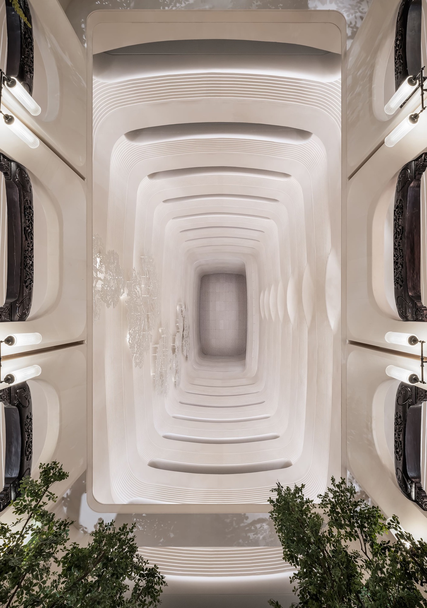 Managing the relationship between people and space in this 63-meter-high space is a crucial consideration. CCD refers to the structural relations of “densely-eaved pagoda,” a type of traditional Chinese architecture, to form dynamic parabolas, making the lofty space appear neither empty nor clumsy.