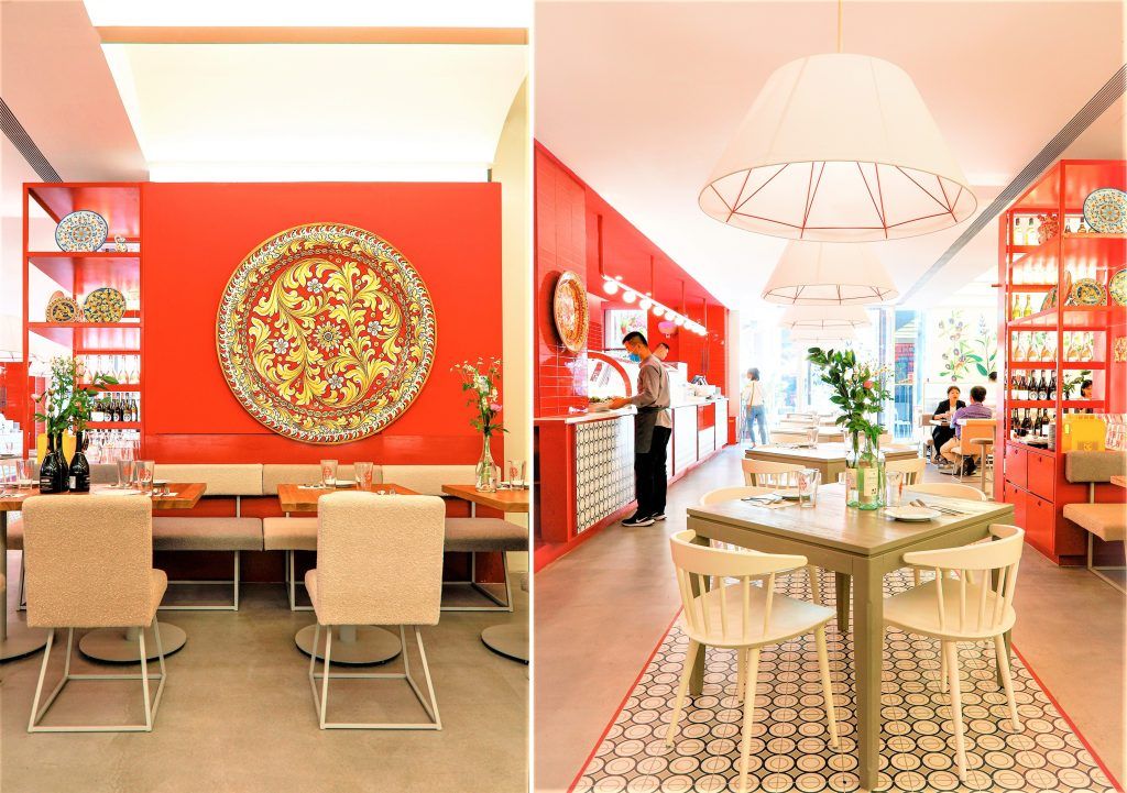 The project combines a series of Italian culinary experiences offered to a Chinese audience: fresh-made pasta restaurant, wine taverna and food market. These three main aspects are shown in the main counter, along which customers can see the process of the pasta making in a glazed exposed lab, pick up their dishes from food displays or choose wines from shelves. The easy-going atmosphere is characterized by a fresh contemporary design, which combines the warm and joyful brightness of South Italian restaurants with the cozy and intimate atmosphere of northern Italian “osteria” and wine pubs. Color scheme is clearly dividing the functional areas, with a signature red for the food displays and kitchen parts and a palette of soft and delicate grays for customers and dining rooms. All furniture, lighting fixtures, logo and wall decorations with traditional herbs are specifically designed for the space. Custom-made plates and ceramic pieces by “Il Rustico”, artisanal ceramic workshop from Caltagirone in Sicily, are decorating shelves and walls, and were inspiration for decorative and graphic elements around the space.