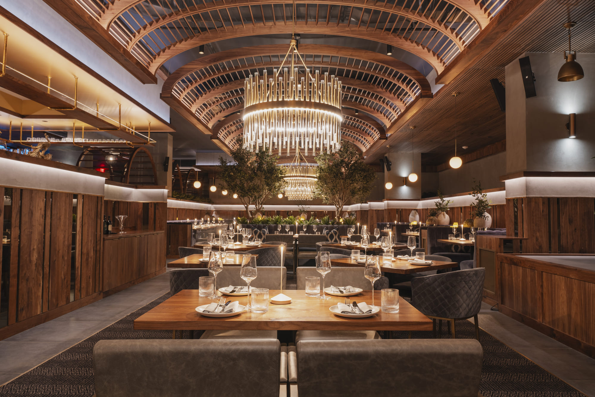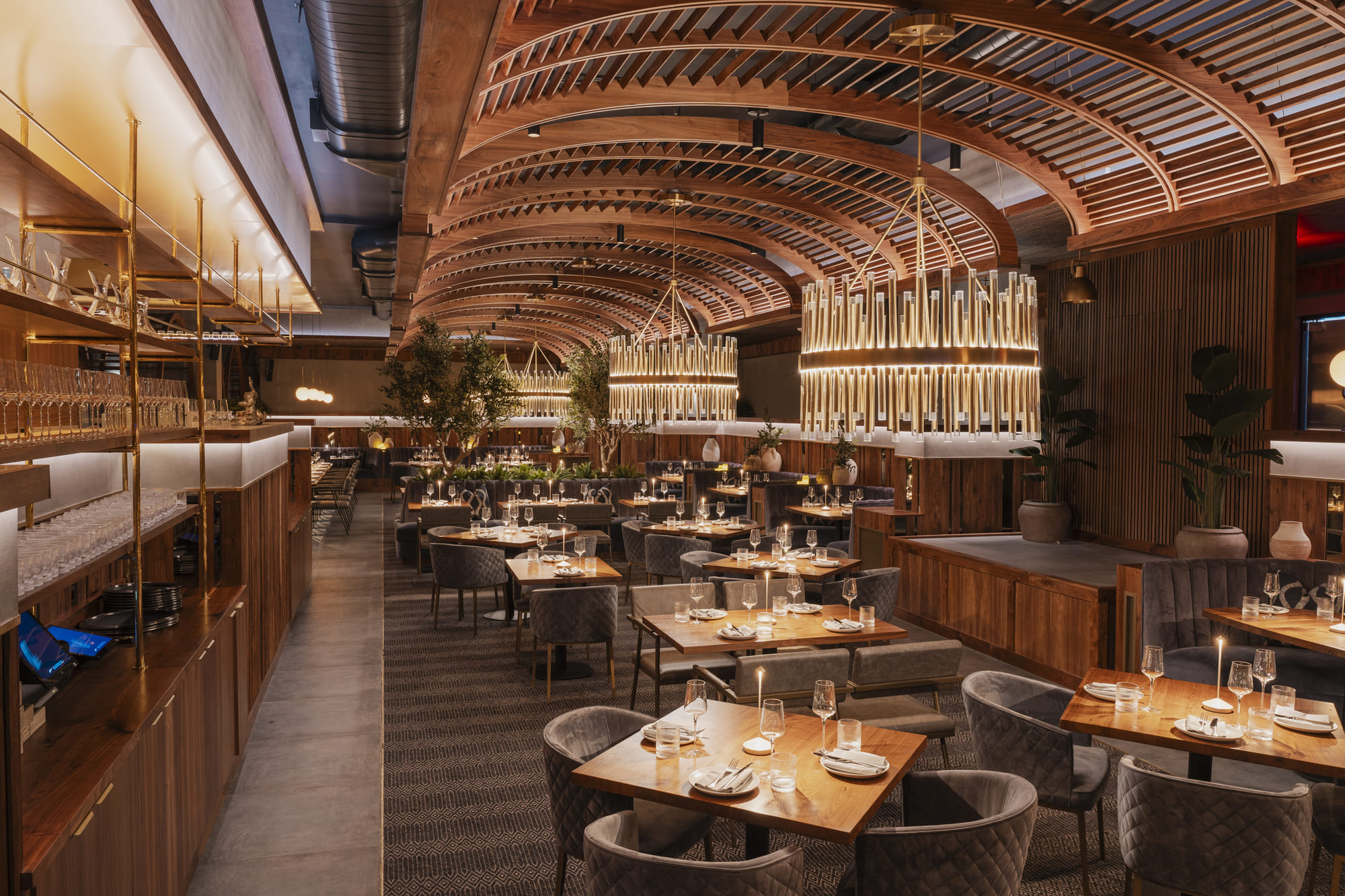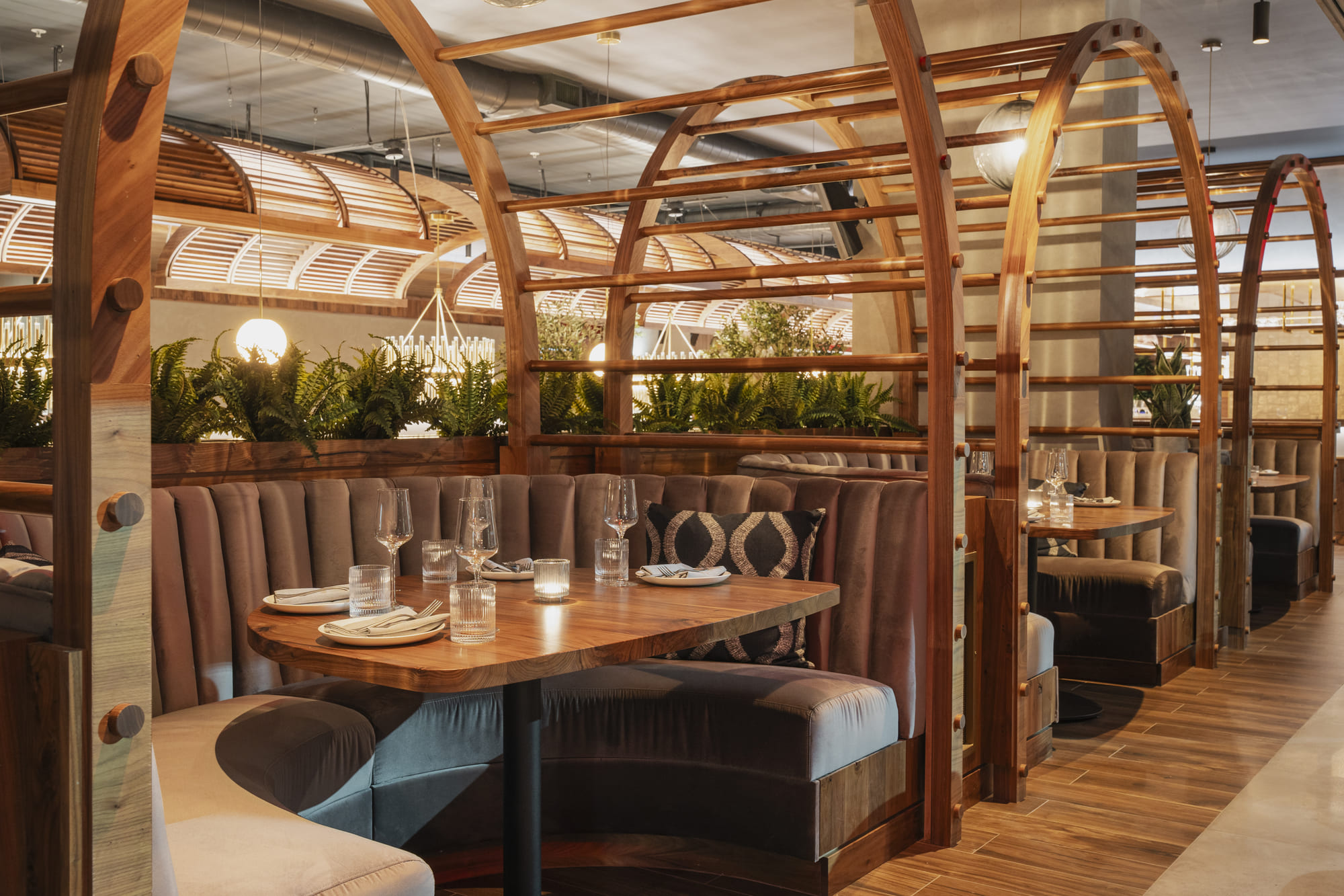 Sparrow Italia sets the tone with intention. The design concept embraces warmth and romanticism, with a restrained yet tactile palette of desaturated blue velvets, carved wood paneling, textured Venetian plaster, and burnished brass detailing. A sculptural, leathered-stone bar anchors the space, while arched booths laced with colored ropes offer semi-private dining. At the heart of the restaurant is a dramatic sunken dining room framed by a series of suspended wood arches mimicking a nest — an architectural move that introduces a rare, theatrical moment of discovery and grandeur, uncommon in the Miami dining scene. This central space also accommodates live nightly entertainment with a built-in stage seamlessly integrated into the design to support the brand’s core pillar of immersive dining.