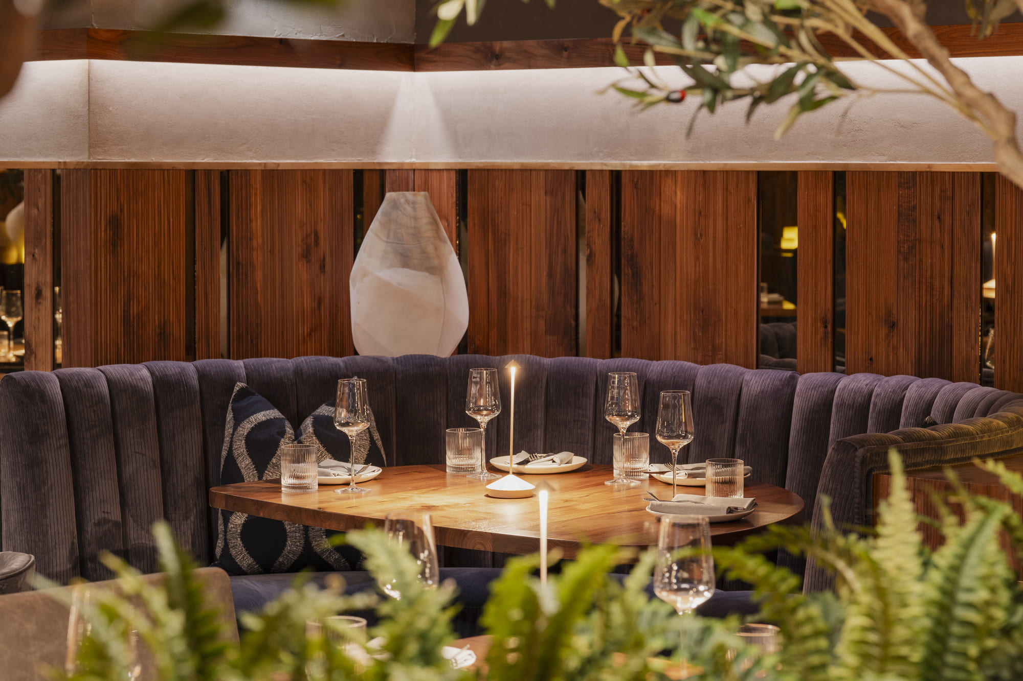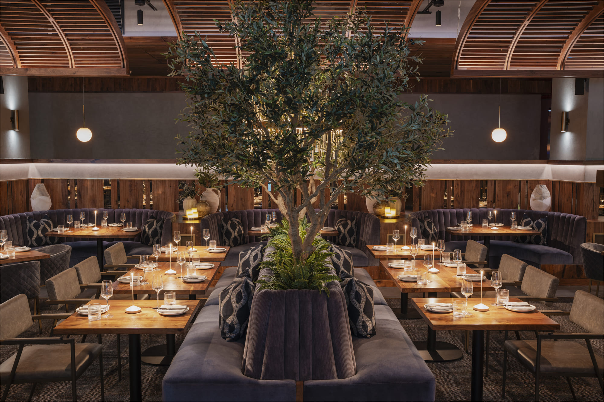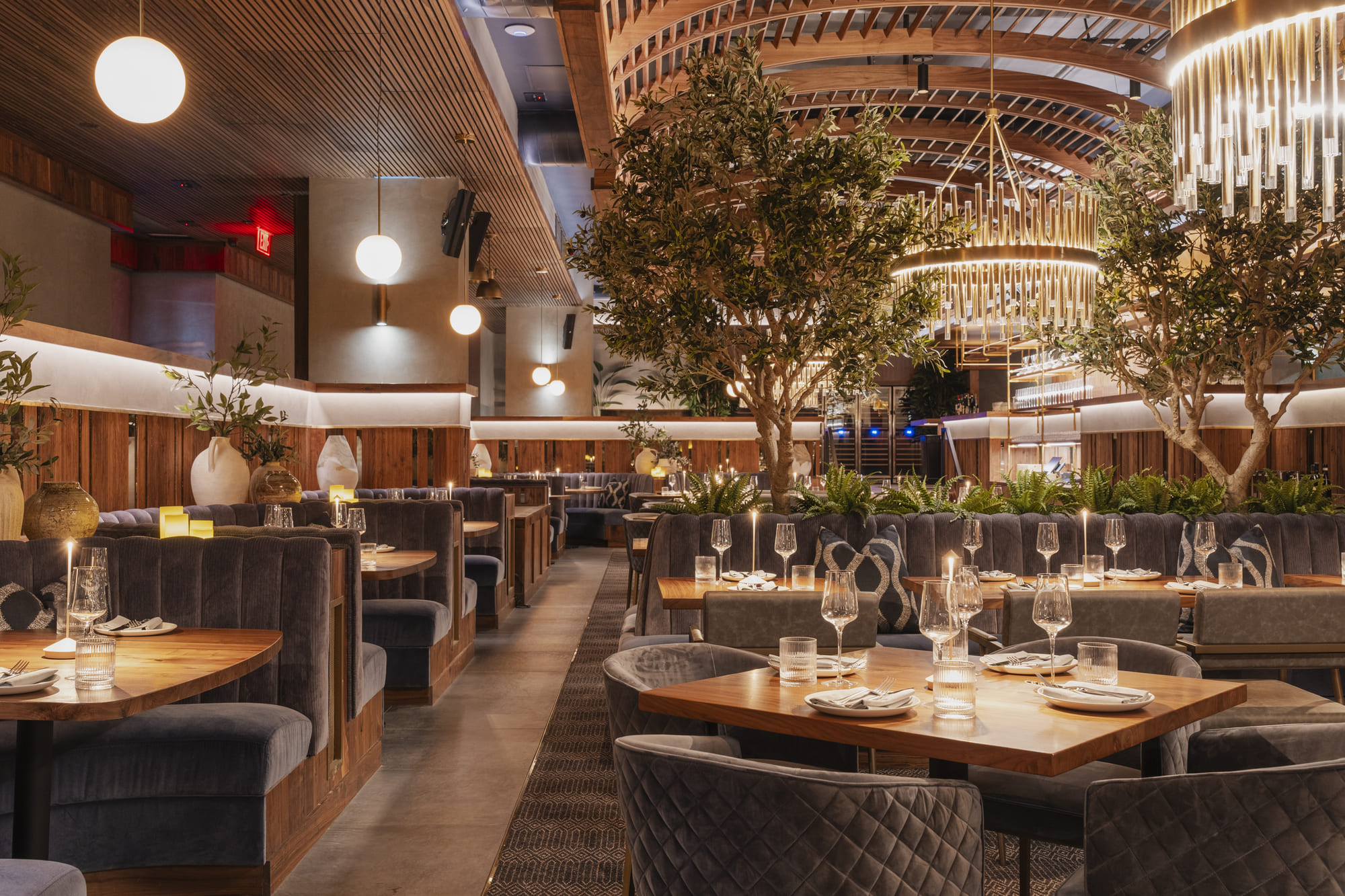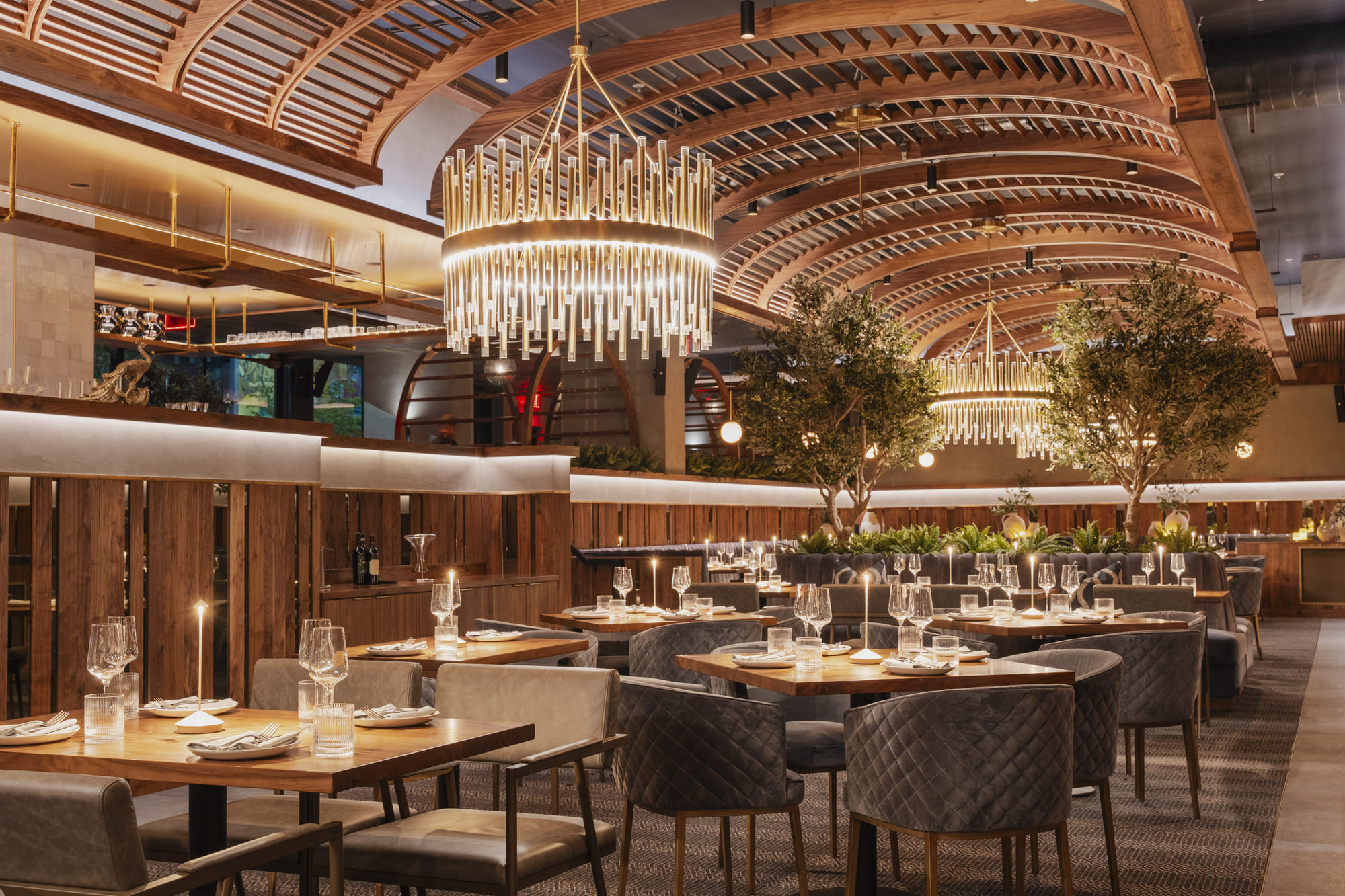 Sparrow Italia sets the tone with intention. The design concept embraces warmth and romanticism, with a restrained yet tactile palette of desaturated blue velvets, carved wood paneling, textured Venetian plaster, and burnished brass detailing. A sculptural, leathered-stone bar anchors the space, while arched booths laced with colored ropes offer semi-private dining. At the heart of the restaurant is a dramatic sunken dining room framed by a series of suspended wood arches mimicking a nest — an architectural move that introduces a rare, theatrical moment of discovery and grandeur, uncommon in the Miami dining scene. This central space also accommodates live nightly entertainment with a built-in stage seamlessly integrated into the design to support the brand’s core pillar of immersive dining.