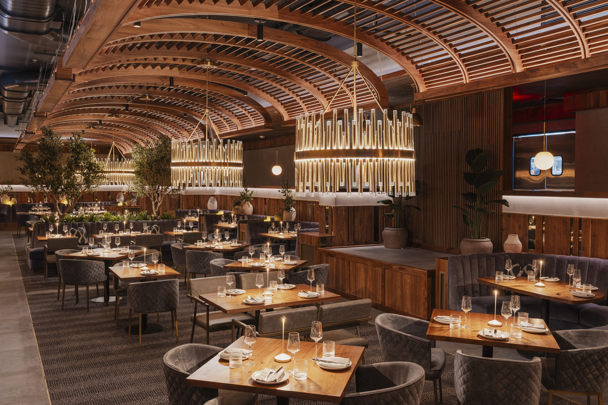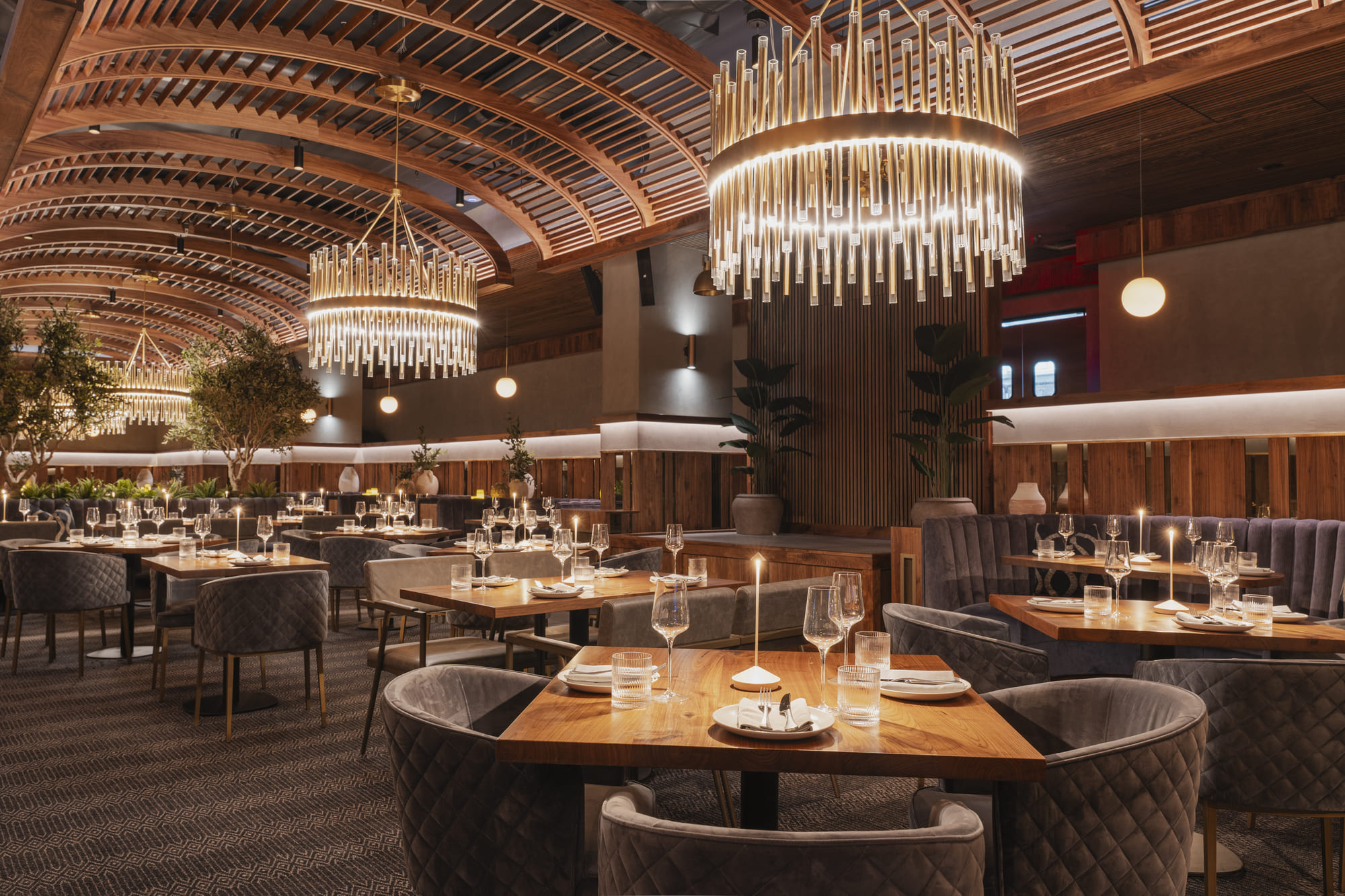 The lighting strategy was essential to achieving fine dining ambiance —combining soft washes, custom chandeliers, and intimate low-level lighting to enhance the materiality and create a rich, immersive glow. Al fresco seating and gender-neutral restrooms underscore a commitment to inclusivity and contemporary hospitality values.