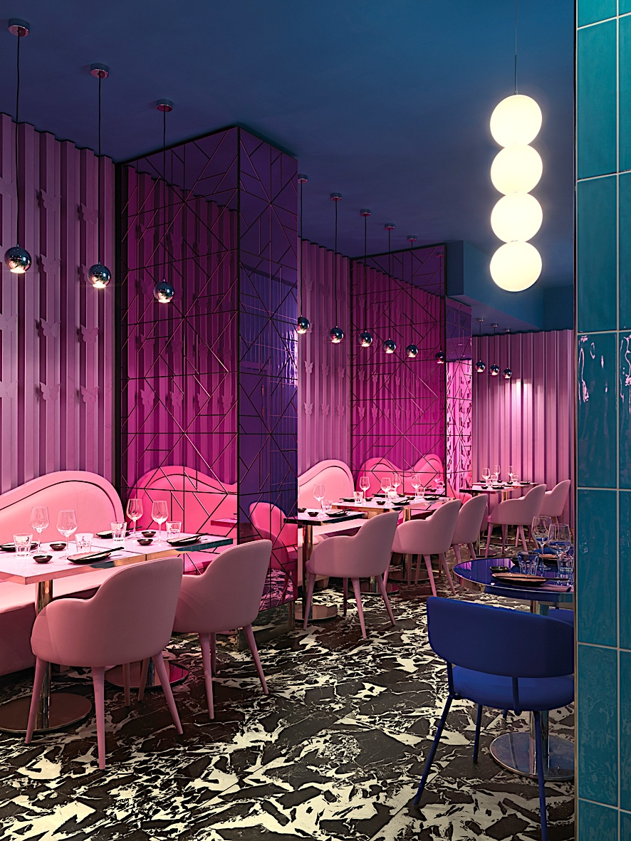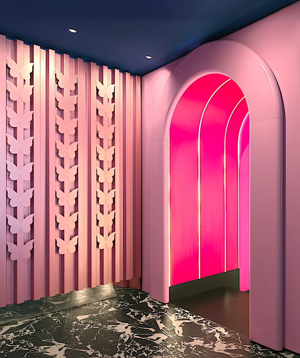 A place with an irreverent and unconventional soul, which invites you to make your own the playful and dreamlike dimension of life, created by the interior design studio COLLIDANIELARCHITETTO. Tako is a new sushi restaurant and cocktail bar with an eclectic and visionary atmosphere, played on the edge of fun, located in the heart of Ostiense, a Roman neighborhood with a strong industrial identity, once dominated by an electrical power plant, a river port and a gasometer, today among the most interesting places for lovers of street art and underground culture, frequented by university students and international tourists in search of gourmet dining experiences.Opened in the year of the rabbit, symbol of luck, prosperity and creativity, Tako draws inspiration from the tale Alice’s Adventures in Wonderland, to create an experience with a strong emotional impact, at the same time charismatic and carefree; multifaceted and dreamlike, it is a colorful dream played out in macro-proportions. Butterflies, flowers, lollipops and rabbits populate an environment where food and design blend together to bring to life an emotional, timeless and ageless experience that remains imprinted in the memory of its guests.The project is revealed on two levels. The ground floor, which has eight large windows overlooking Via Ostiense, houses a space with 160 seats, the kitchen and the cocktail bar.The restaurant is a fluid environment where mirrored surfaces and metal coverings flutter above the floor with large black and white fragments.Customers are welcomed by the cocktail bar, dominated by a monolithic mirrored cylinder and an L-shaped counter with a black absolute marble top, covered in magenta press-bent metal while a macro circular bottle holder with polished steel details stands out against a background of iridescent pink glass, creating a dreamy atmosphere.The sushi bar, with its large portholes, wrapped in a fluid enamelled surface that recalls the movement of water, constitutes the connecting element between the two areas of which the venue is composed.On the right is the main space of the restaurant, characterized by a variety of seats and tables and conceived according to the color block principle with pink, magenta, cyan and Klein blue colours. A fluid space that culminates in a backdrop of tapered arches in relief, emphasized by lines of light that enclose semicircular niches dressed with mirrors, sofas and tables in total magenta.Luminous pearls, like bubbles floating in air, create a suspended and light atmosphere, emphasized by the multiplication of reflections on the mirrored surfaces and metal coverings.On the other side, to the left of the sushi bar, there is a more intimate area, which offers macro sofas, armchairs and tables playing in delicate shades of pink, which stand out against metal walls with decorative micro butterflies.A pink lacquered arch with bold proportions marks the passage between the two floors used for various functions; a staircase leads to the basement which houses the customer services and technical areas.A kaleidoscopic tunnel of coloured arches with lines of light that multiply to infinity a perspective chased down towards the magical world of Alice, in which everything arouses amazement: the walls are wrapped in pink and white wallpaper with dynamic geometry, while macro decor elements such as butterflies, flowers, rabbits and lollipops define a pop identity, in a careful and calibrated staging of colours and shapes.“I dreamed to create a place where you can feel free to express yourself – says Daniela Colli, at the helm of the COLLIDANIELARCHITETTO studio – to detach yourself from the concreteness of everyday life, to enter a fairy tale, a magical and extravagant environment in which people of all ages can travel with their imagination. When you enter Tako you are captivated by the colors, the lights, the details, everything is emotion and amazement.”Tako is a project that invites you to dream: arches and niches, furnishings wrapped in reflective and vibrant surfaces welcome customers in a harmonious and playfully provocative environment.