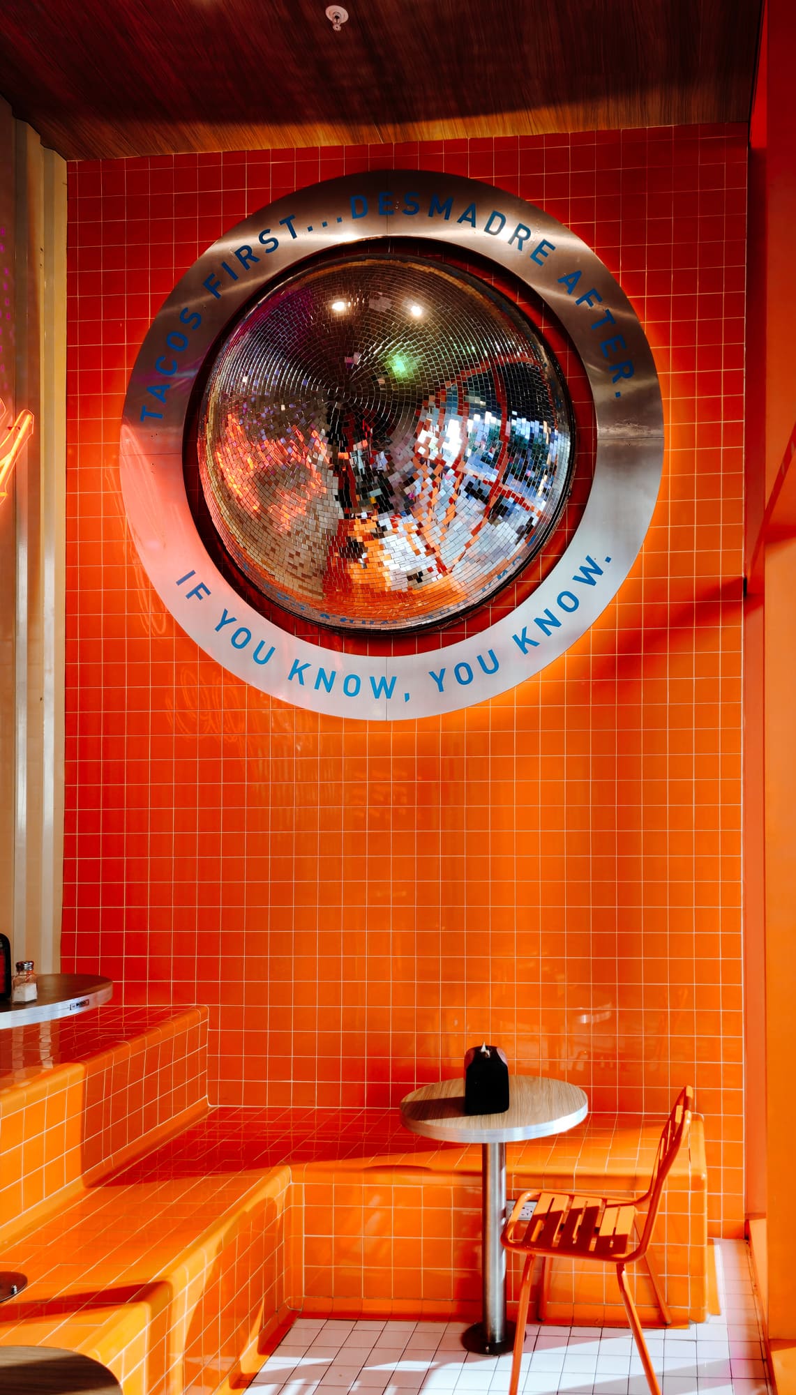 The festive atmosphere is built through a constant interplay of reflections and movement. Circular mirror lighting fixtures and suspended greenery add dynamism to the volume. A vibrant color palette, paired with a curated selection of graphic elements, invites users to immerse themselves in Mexican popular culture, resulting in a space that is simultaneously honest, elegant, and deeply welcoming.